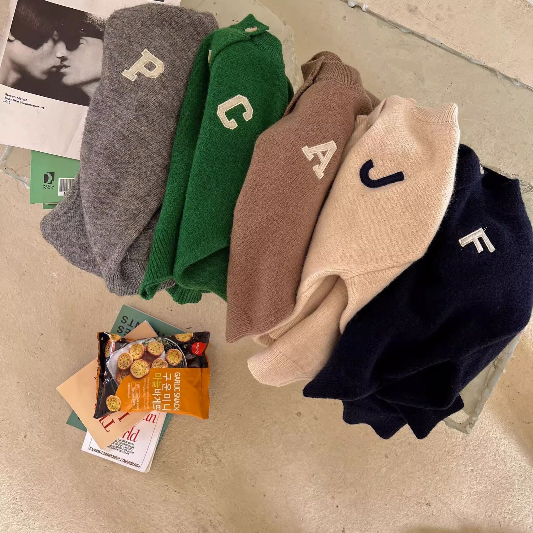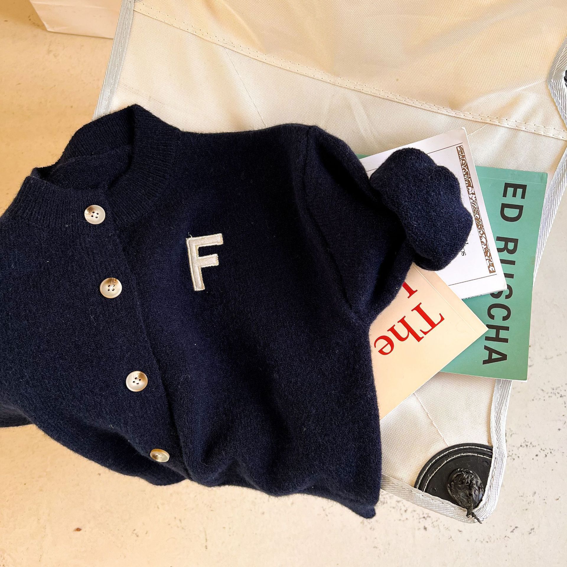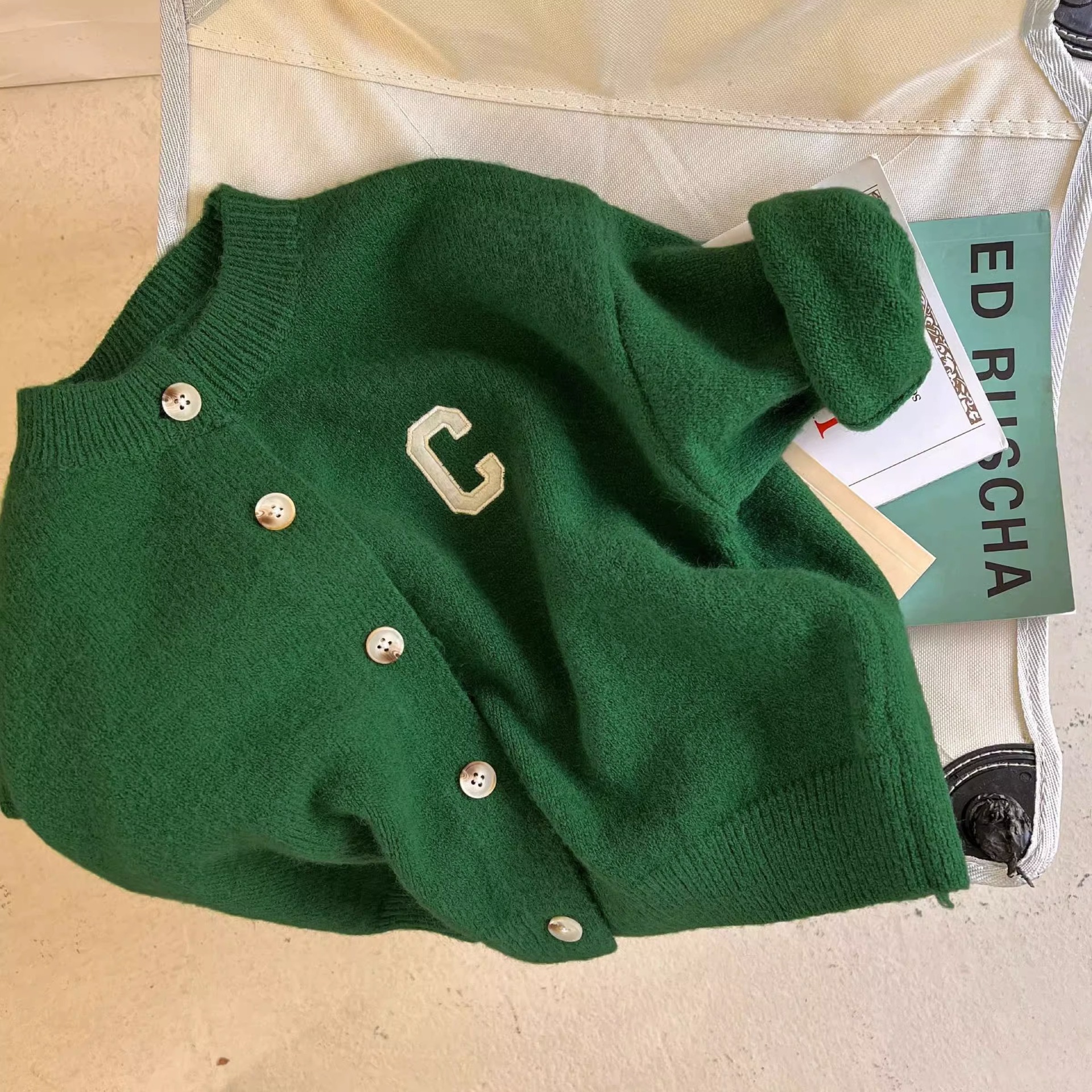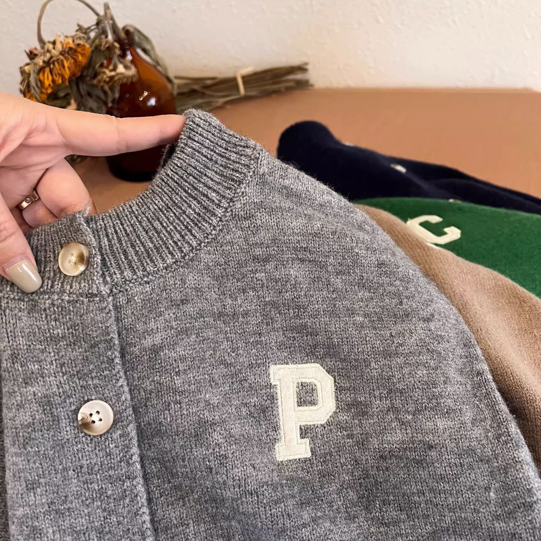 어린이 스웨터 2025 봄 새 소년과 소녀 둥근 목 단색 편지 카디건 아기 캐주얼 자켓