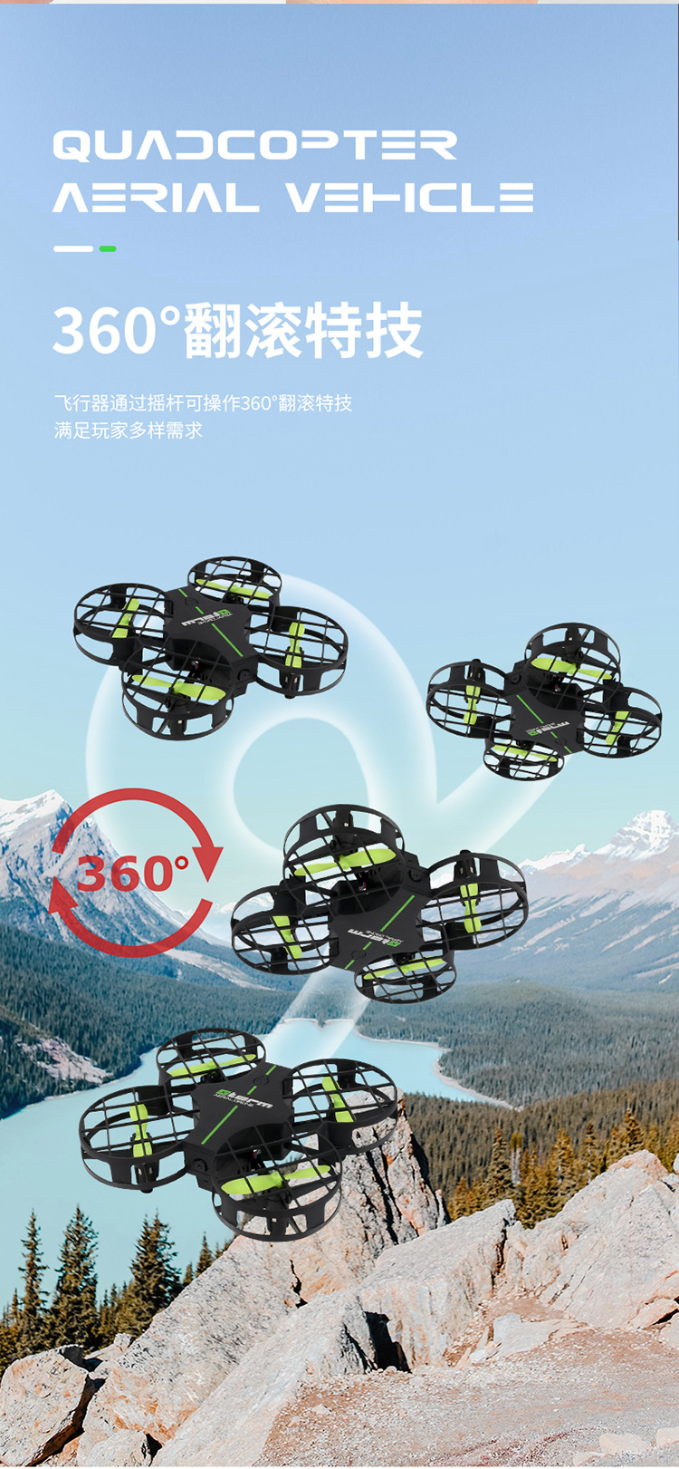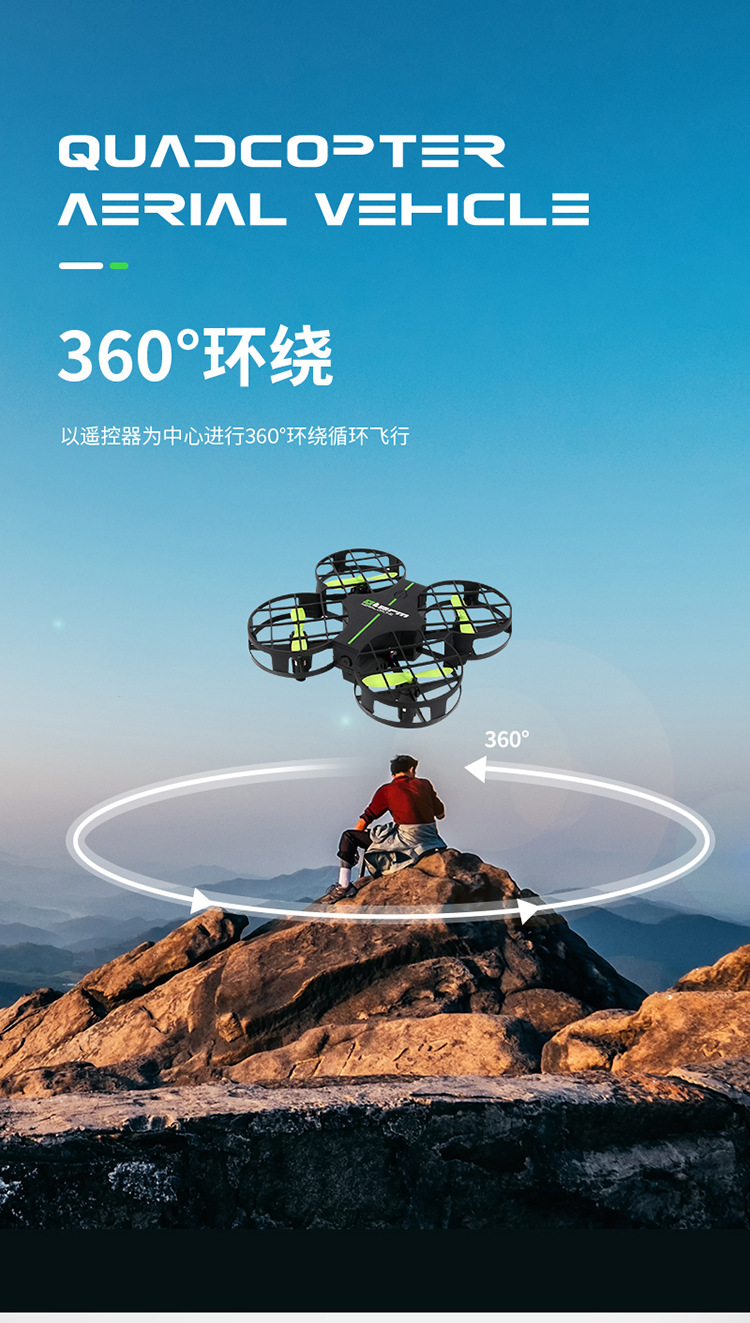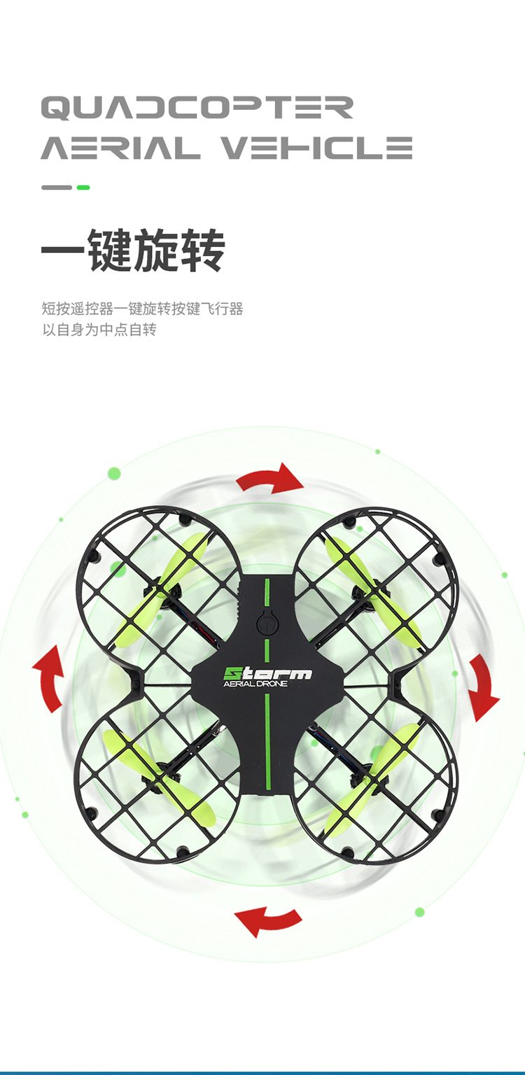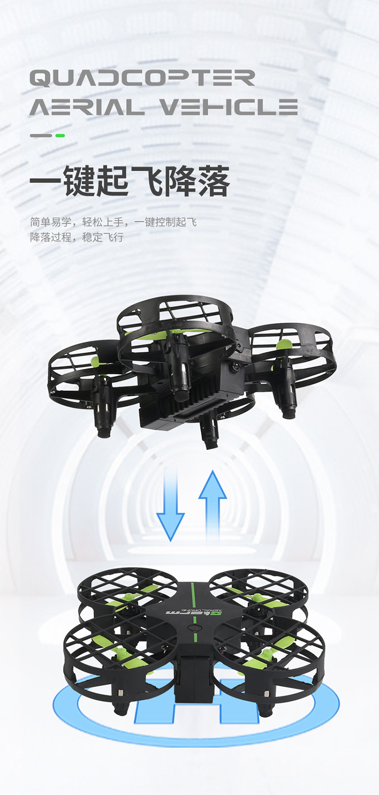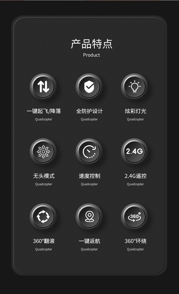 功能描述:功能:前进、后退、上升、下降、左右转、左右侧飞,一键起飞,一键降落,一键急停,无头模式,一键返航,快慢速3档切换功能,一键旋转,一键环绕,360°特技翻滚。