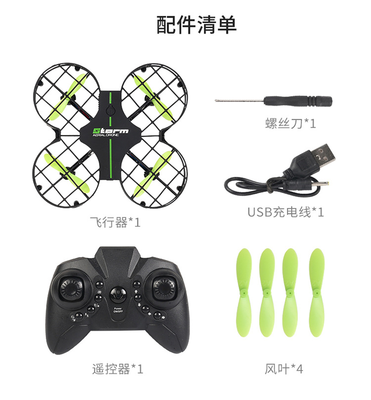 整套包含:遥控飞机*1,遥控器*1,电池*1,USB充电线*1,说明书*1,备用风叶*4