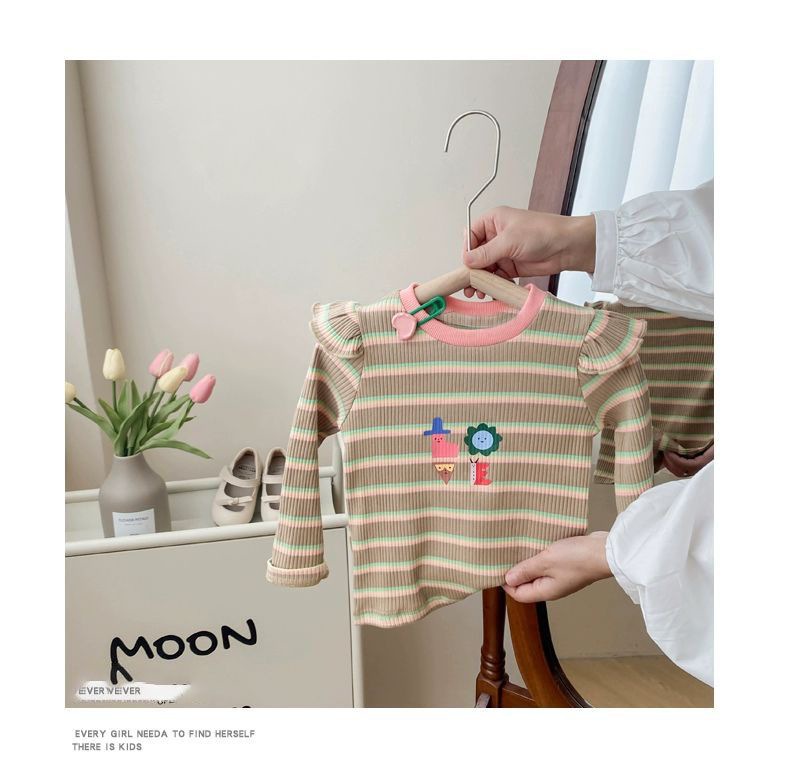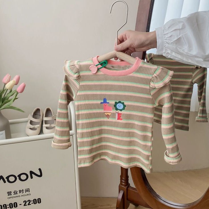 봄과 가을 소녀 티셔츠 아기 세련 된 어린이 성격 유행 브랜드 한국 컬러 매칭 줄무늬 만화 플라잉 슬리브 베이스 셔츠스토어 가기