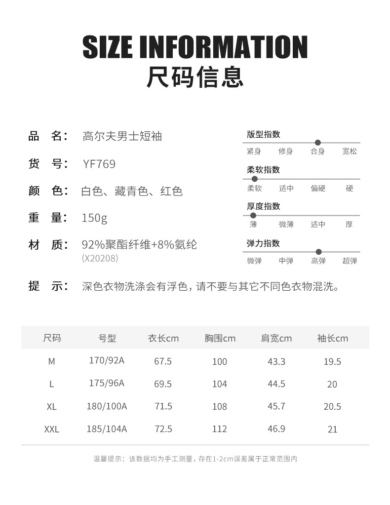 材 质 92%聚酯纤维+8%氨纶 颜色 高尔夫男士短袖