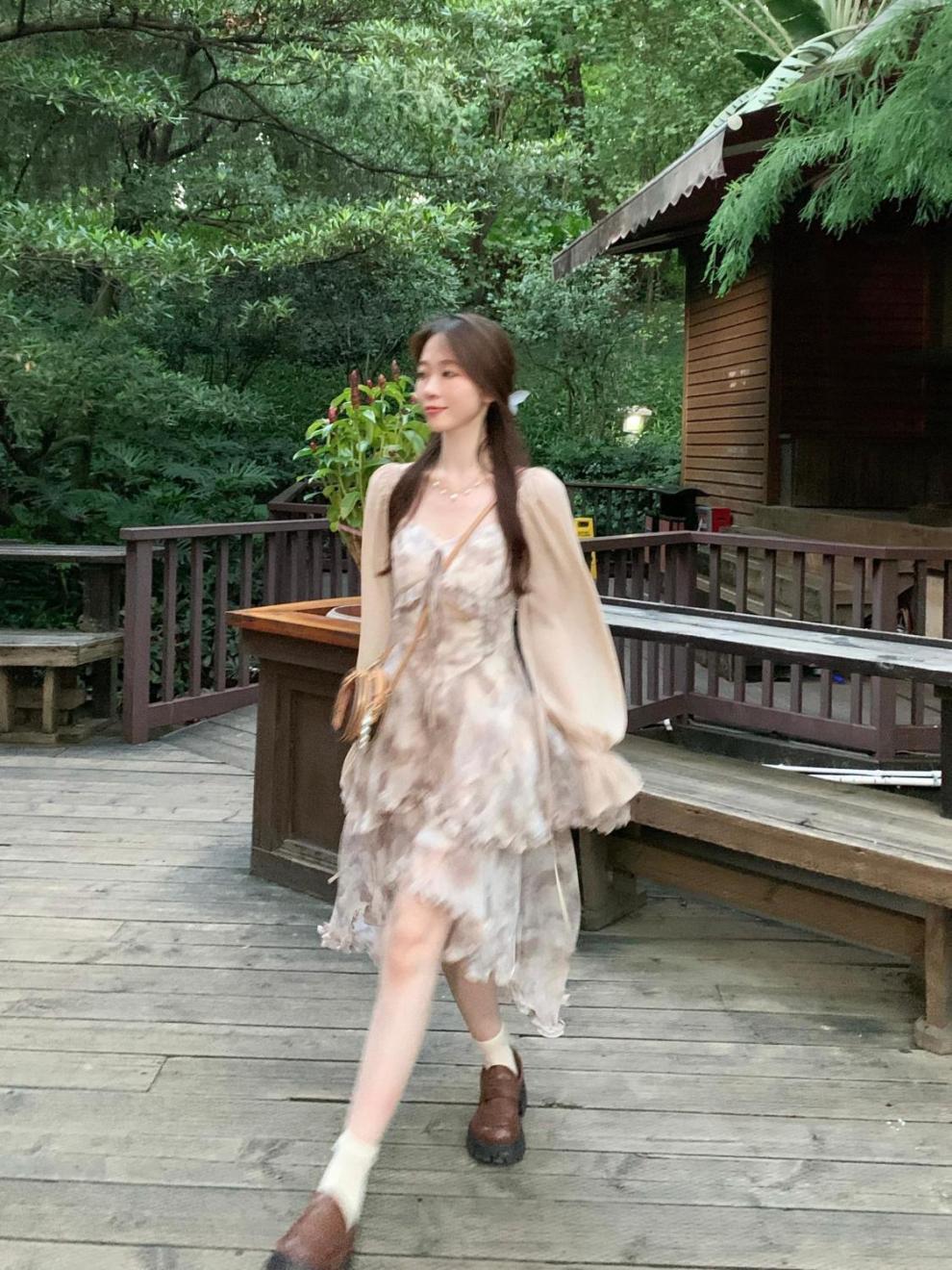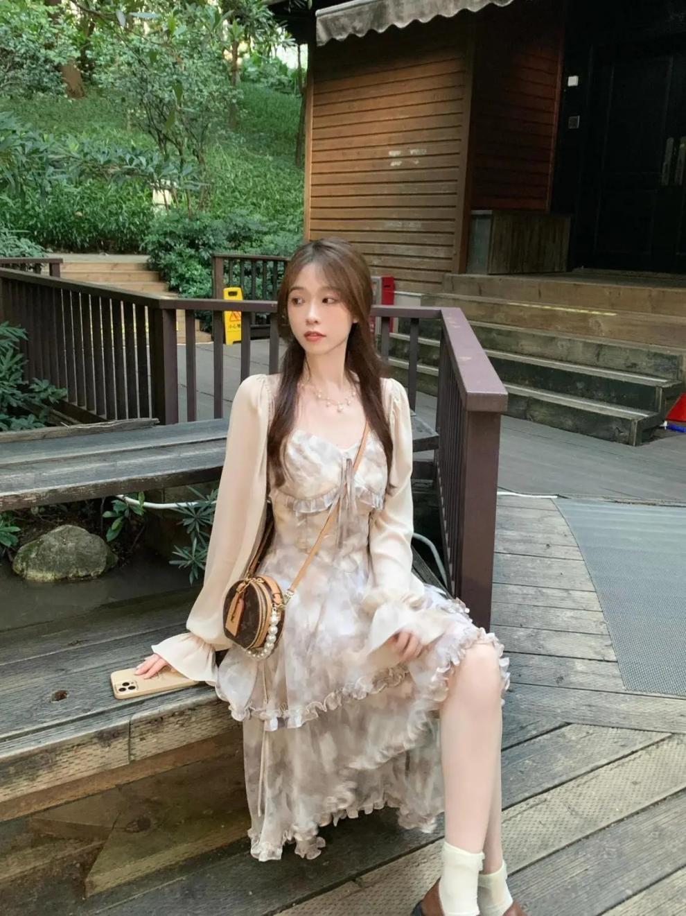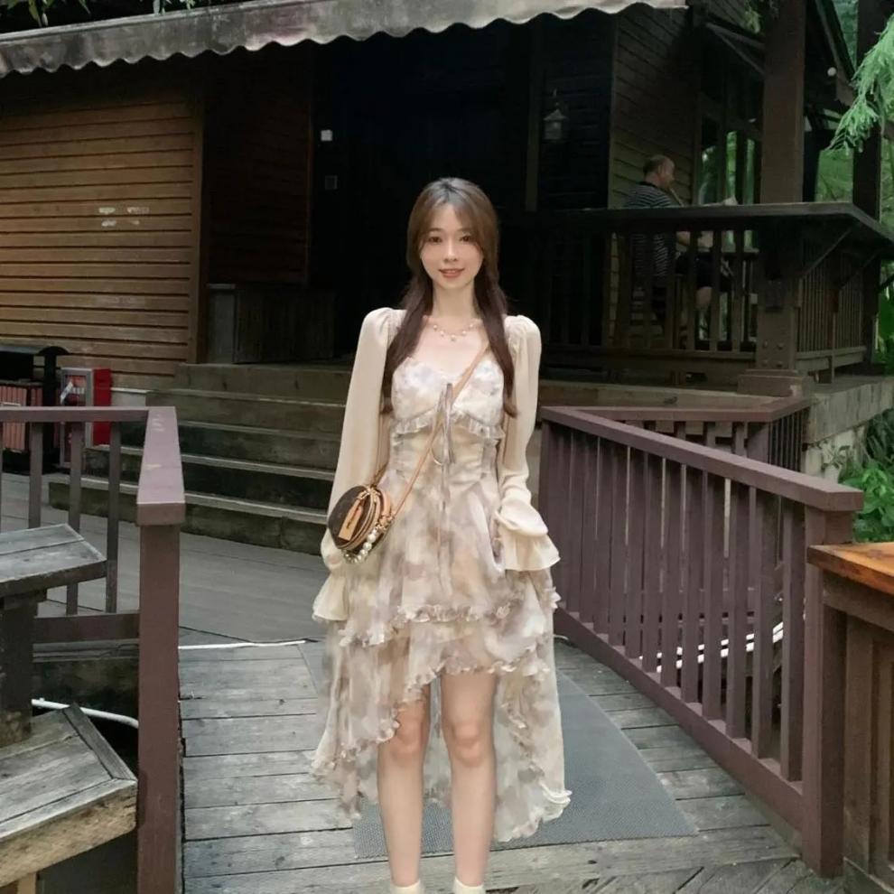 슬링 원피스 기질 현기증 우아한 꽃 원피스 달콤한 쉬폰 카디건 여성 여름 세트 국경 도매