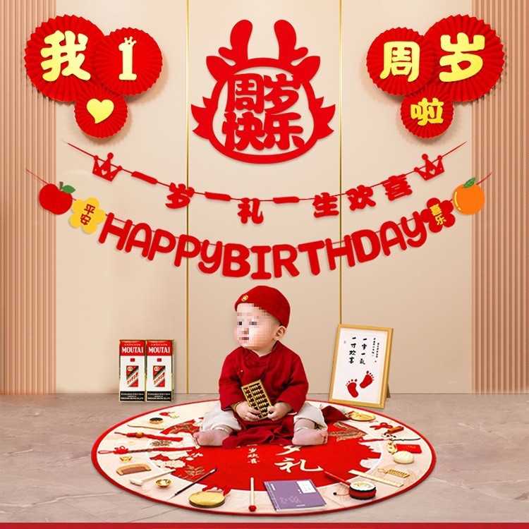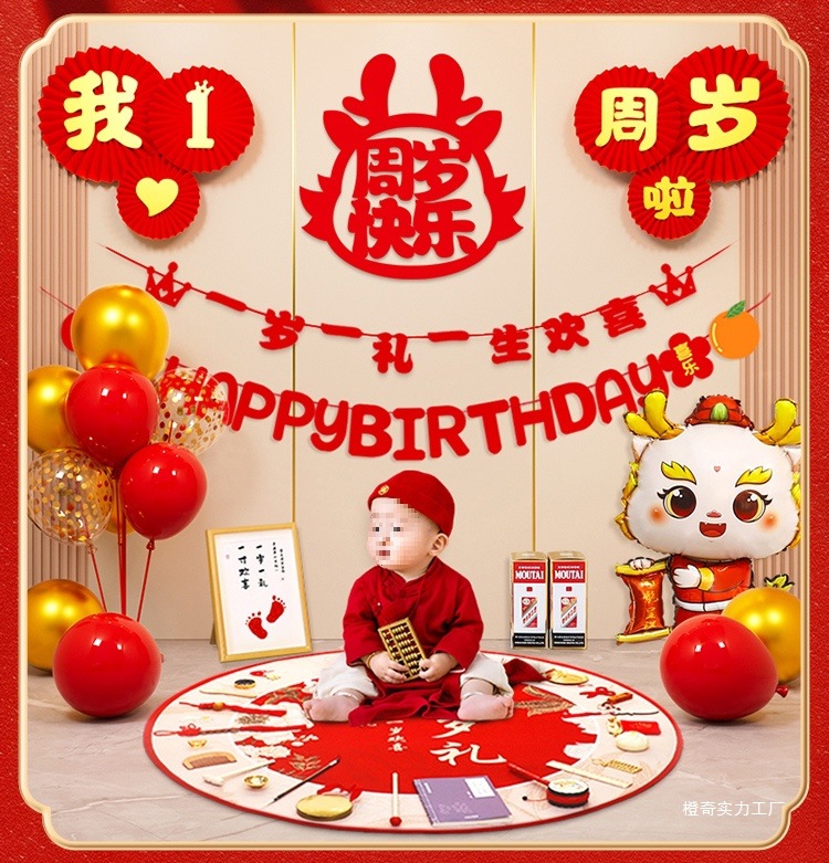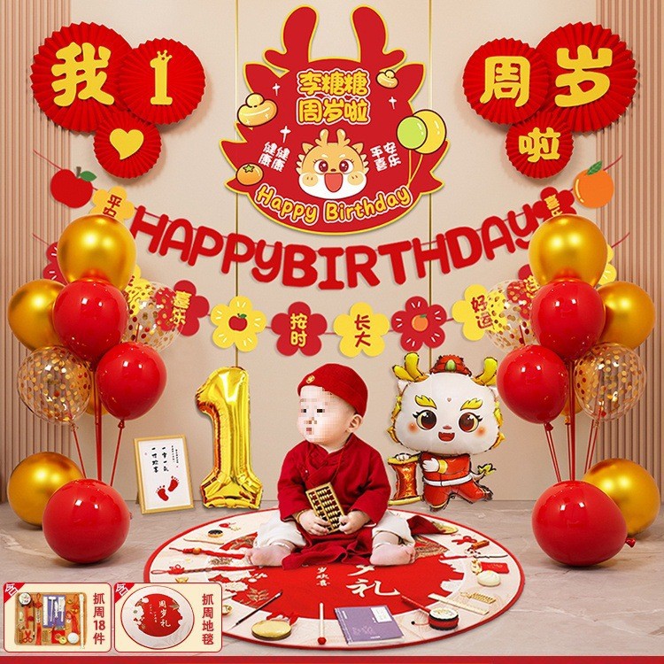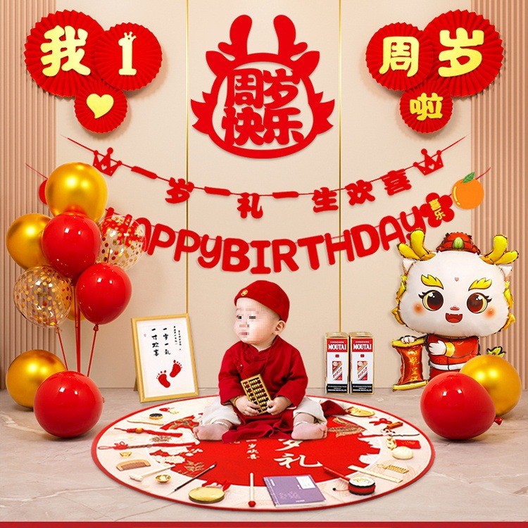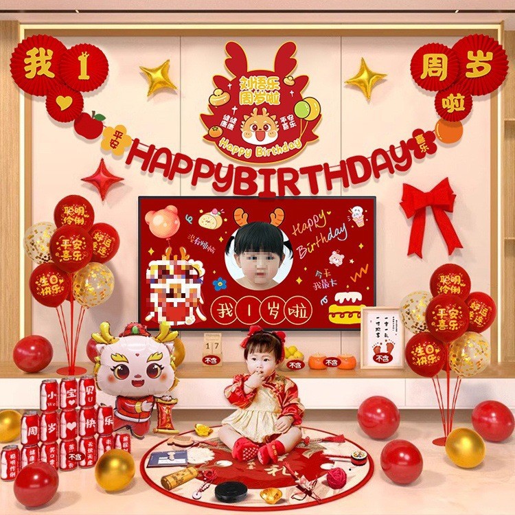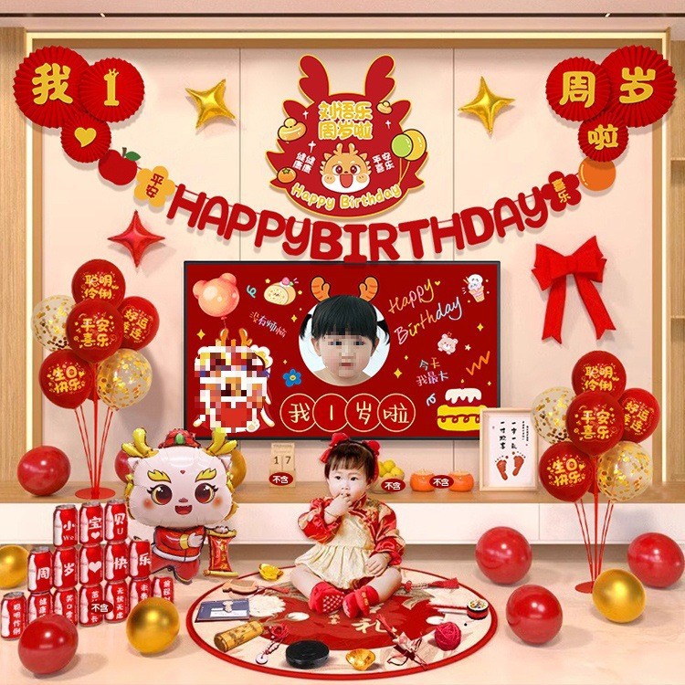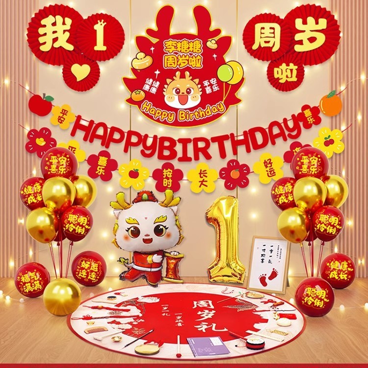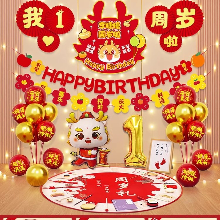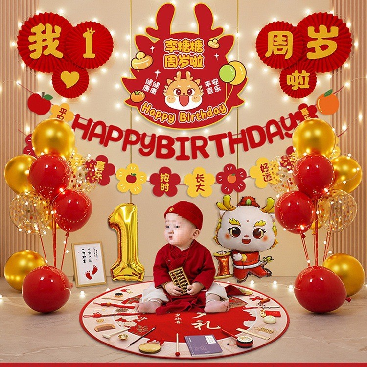 남성과 여성 용 아기 1 세 생일 파티 분위기 장식 장면 레이아웃 잡아 주 배경 벽 풍선 용품
