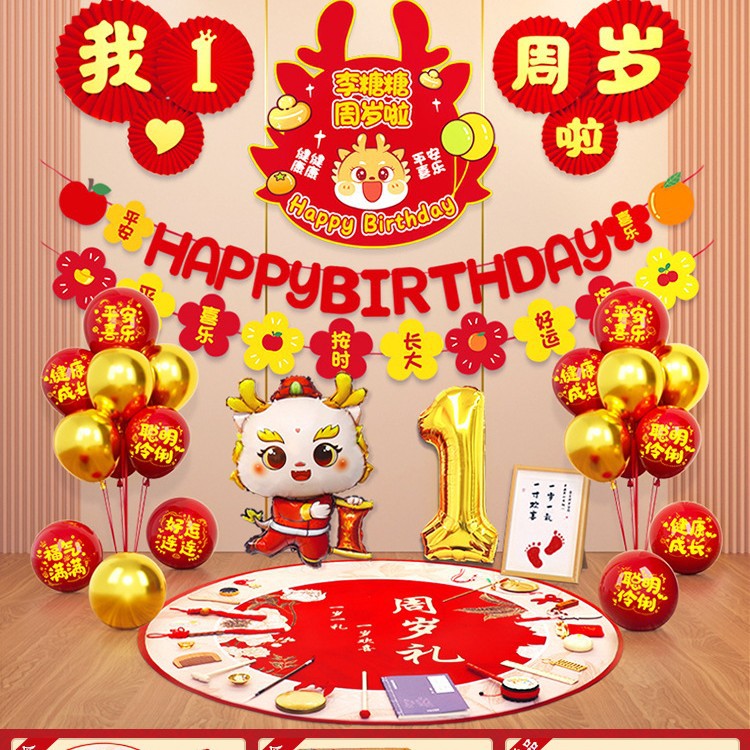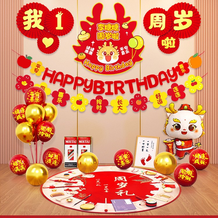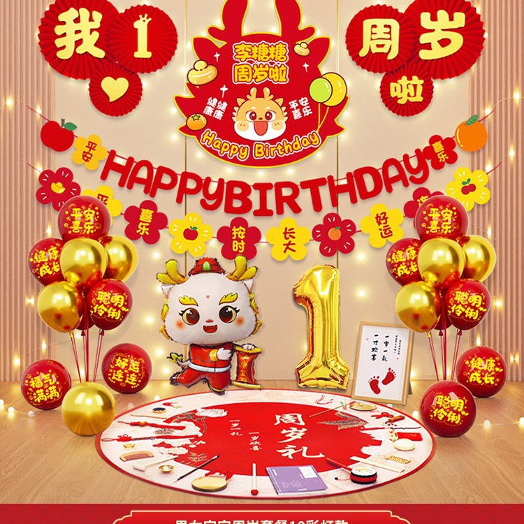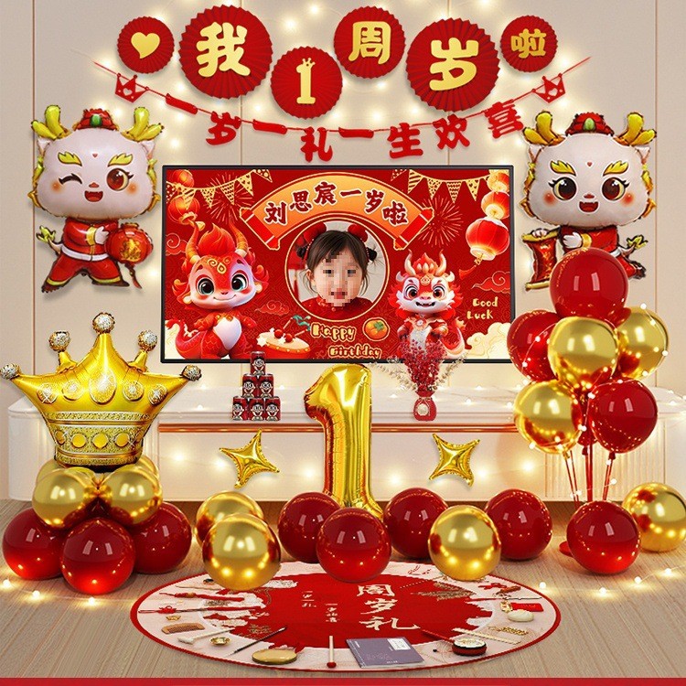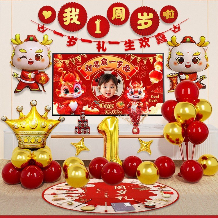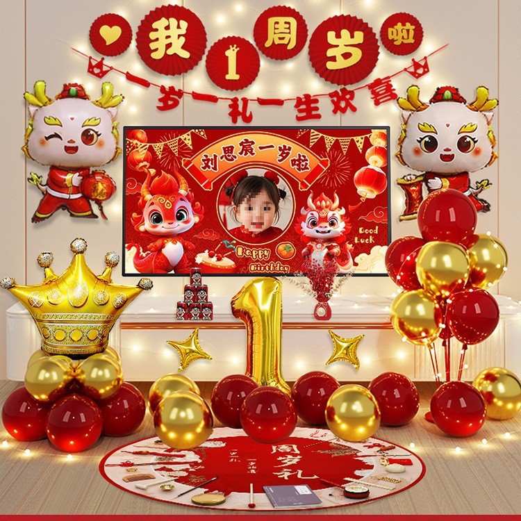 남성과 여성 용 아기 1 세 생일 파티 분위기 장식 장면 레이아웃 잡아 주 배경 벽 풍선 용품스토어 가기