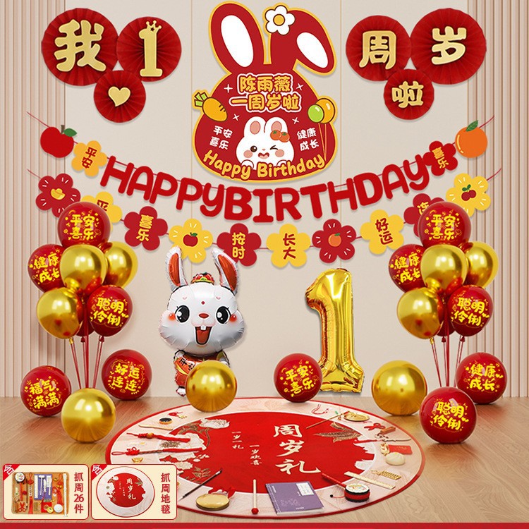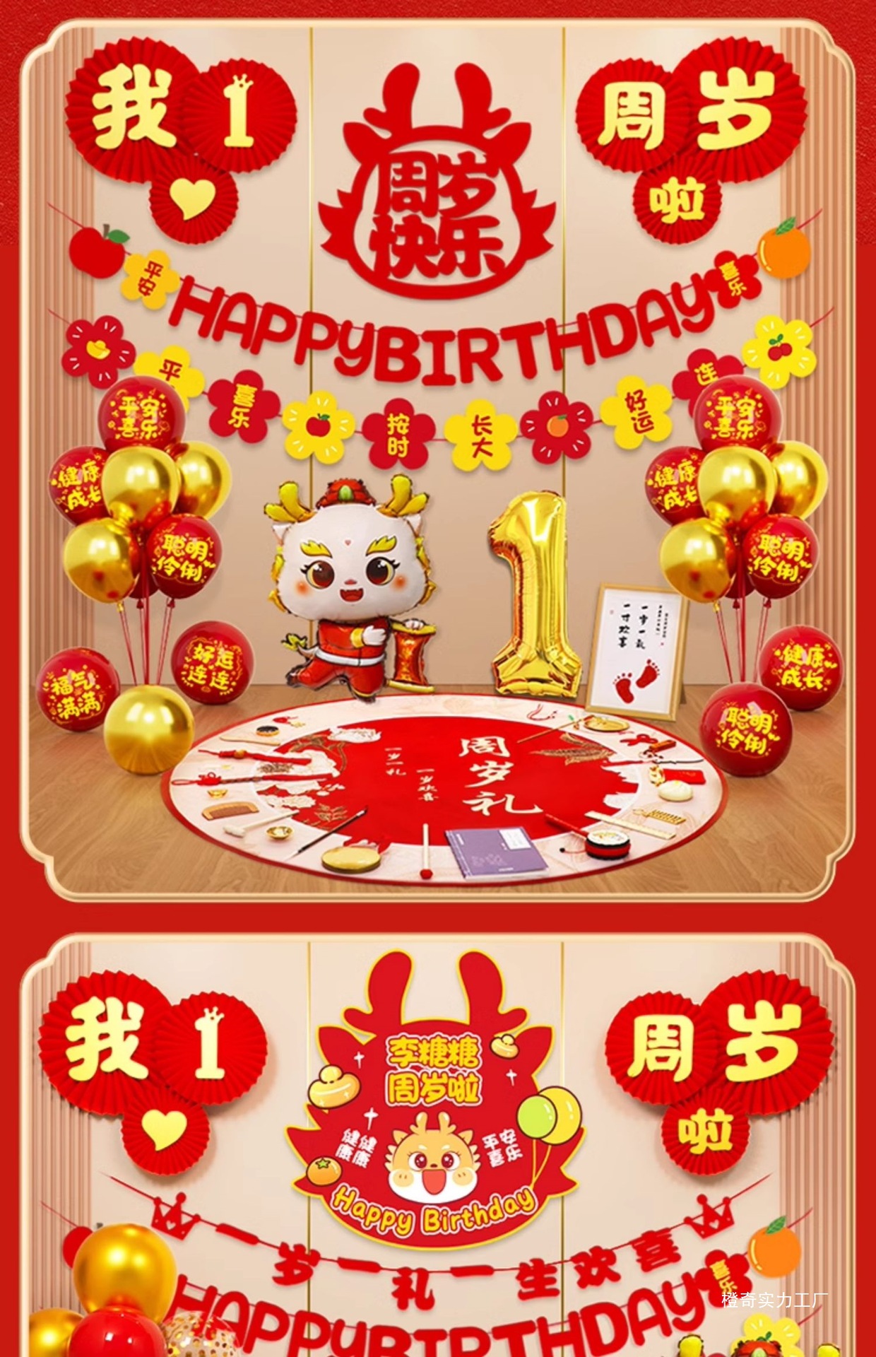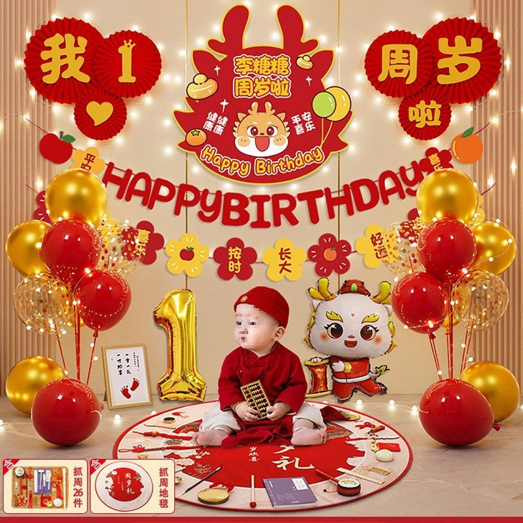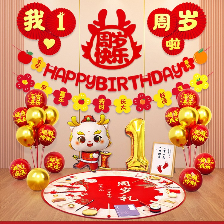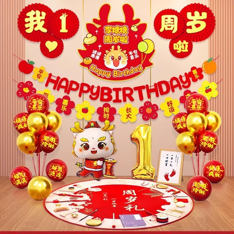 남성과 여성 용 아기 1 세 생일 파티 분위기 장식 장면 레이아웃 잡아 주 배경 벽 풍선 용품스토어 가기