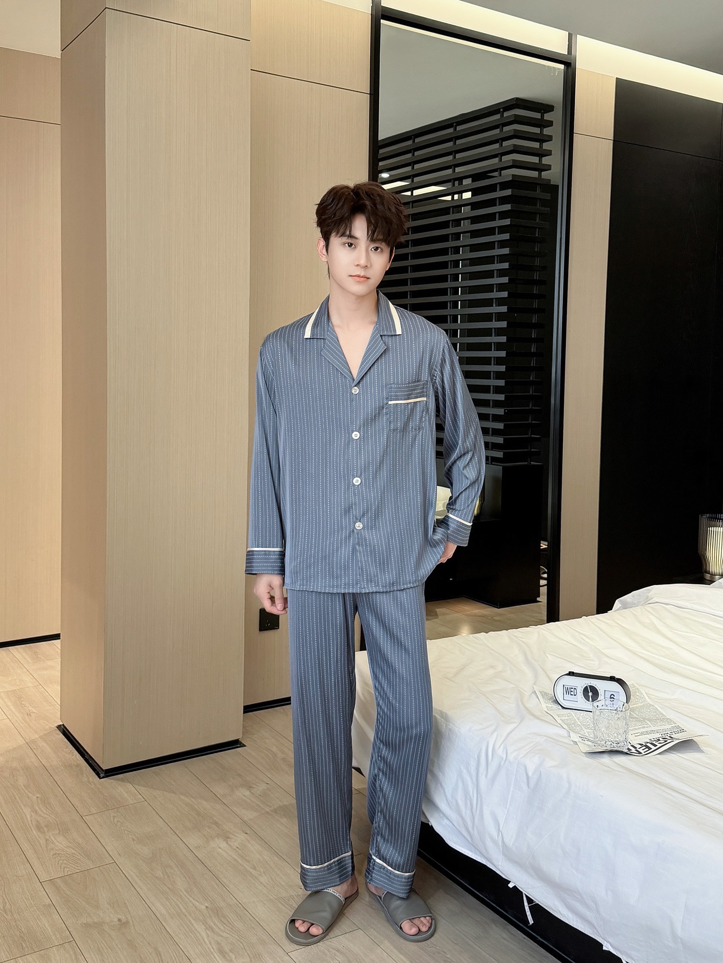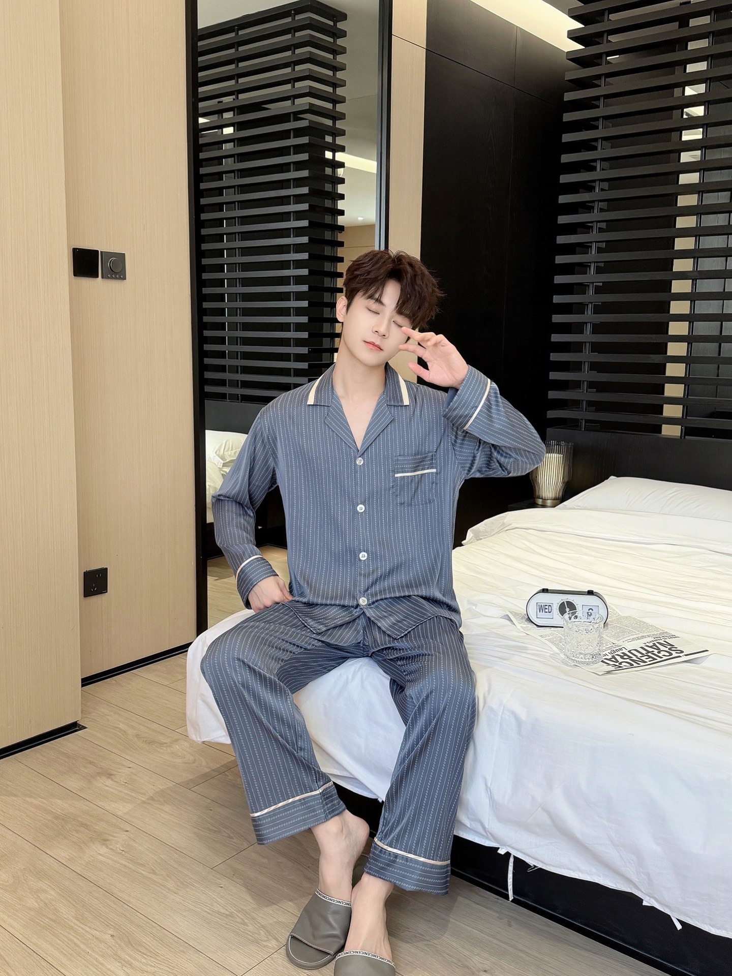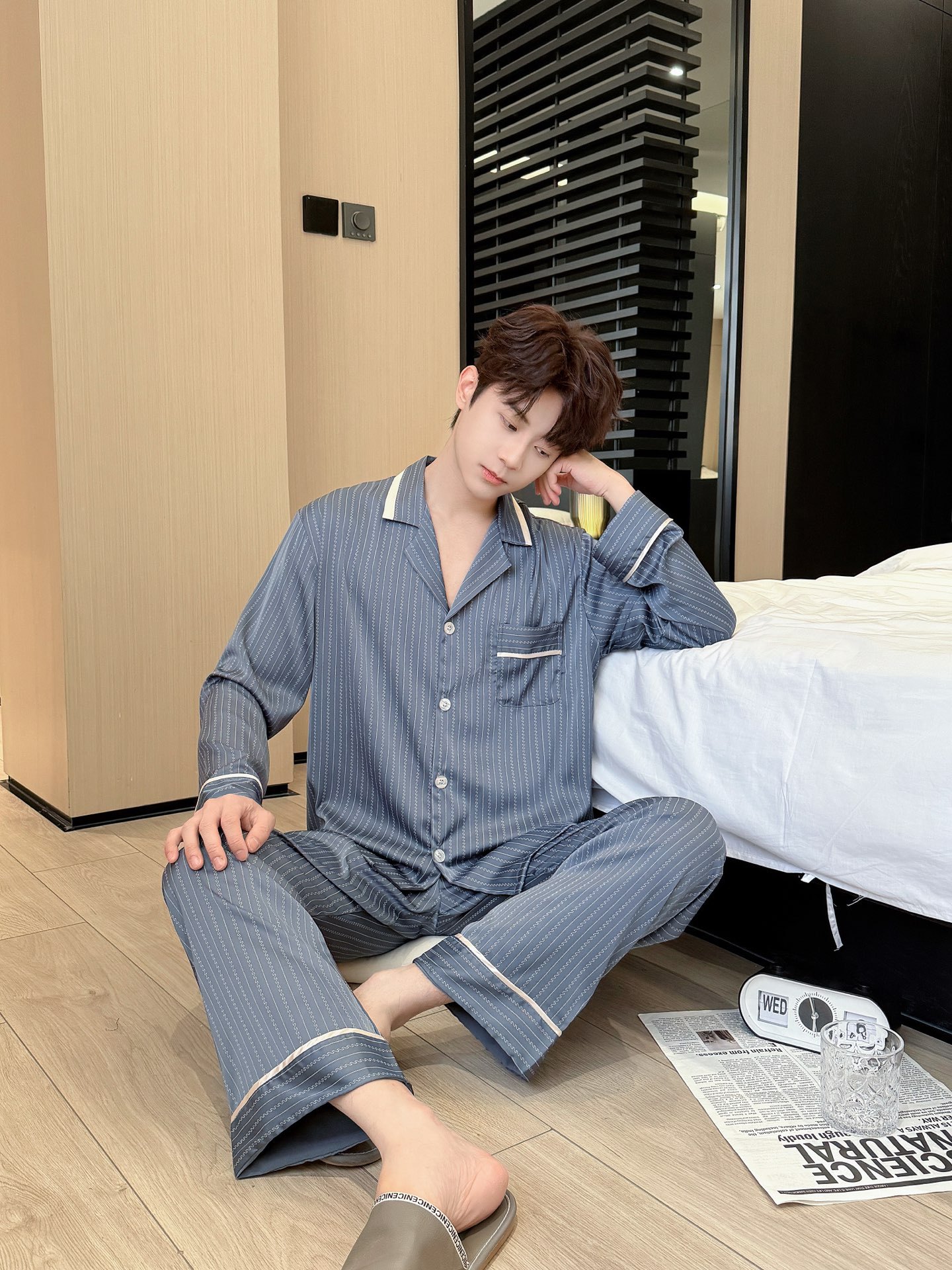 스트라이프 홈 의류 남성용 실크 옷깃 긴팔 바지 세트 아이스 실크 간단한 캐주얼 아웃웨어 남성용 파자마스토어 가기