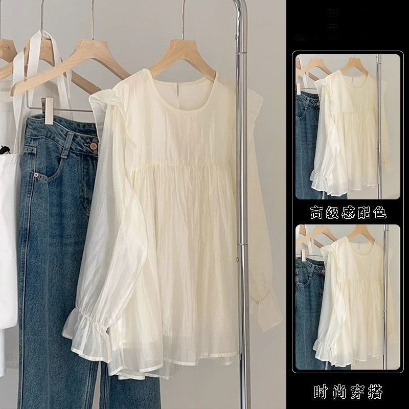 러플 쉬폰 셔츠 화이트 페어리 탑 여성 여름 2025 새로운 프랑스 스타일 세련된 트럼펫 슬리브 스타일 셔츠스토어 가기