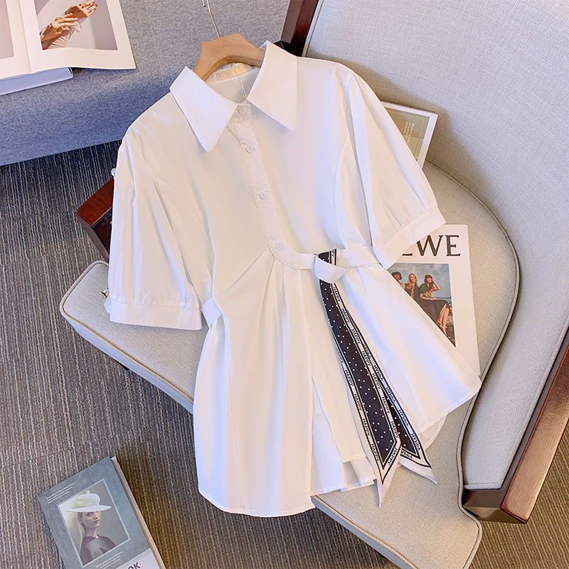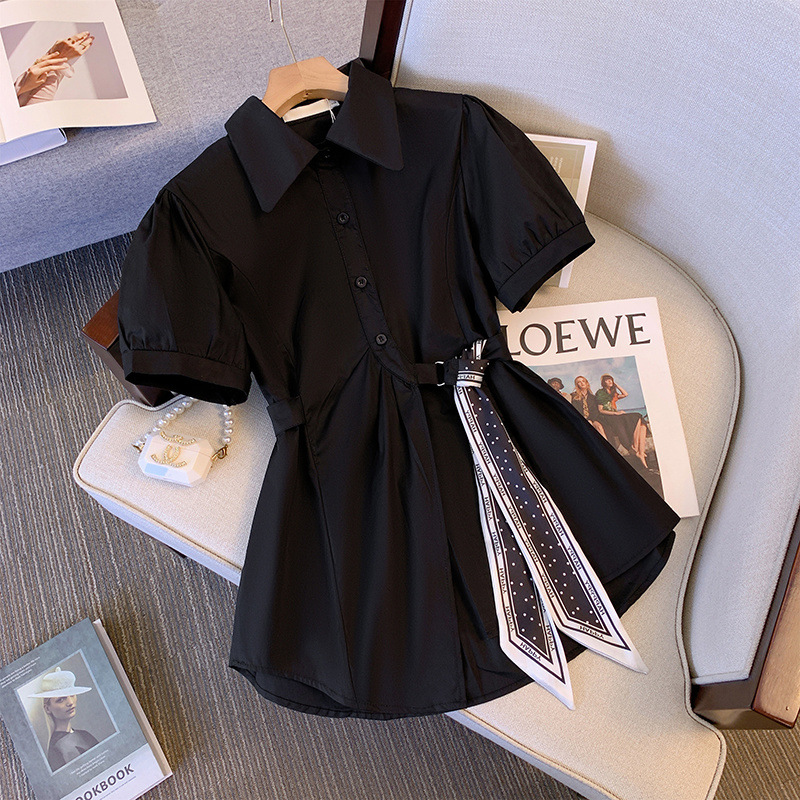 플러스 사이즈 여성 2024 옷깃 통통한 새로운 도착 여름 패션 셔츠 슬림핏 허리 반팔 셔츠 우아한 허리