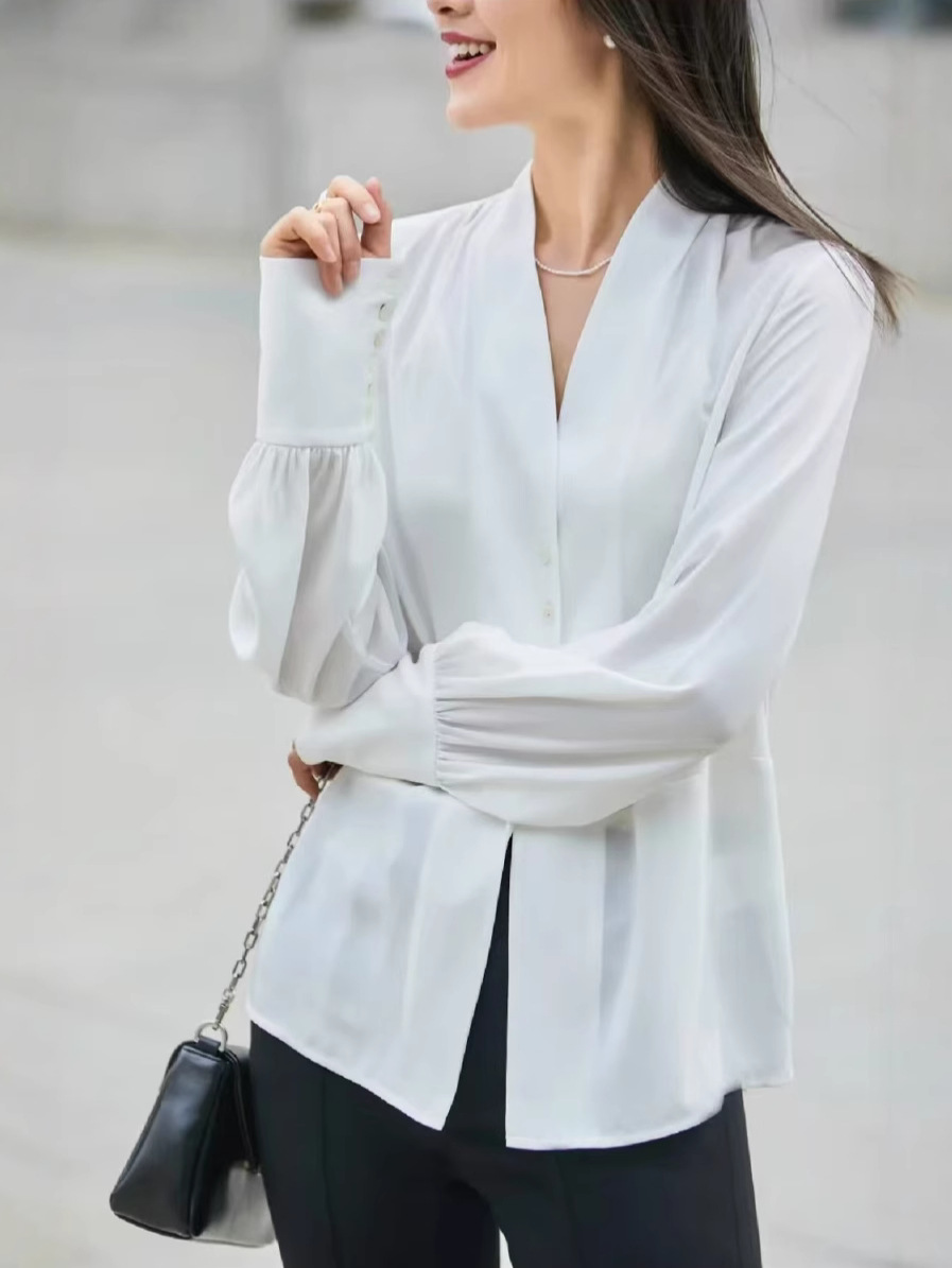 프랑스 V 넥 긴 소매 흰색 쉬폰 셔츠 직장 올 매치 통근 디자인 전문 여성 톱 OL25 봄과 여름스토어 가기