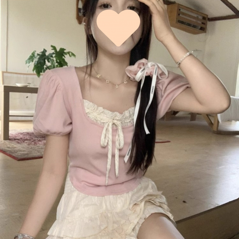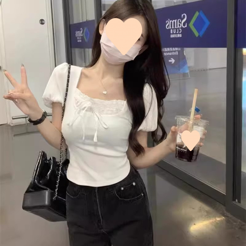 순수한 욕망 스타일 스파이스 소녀 반팔 셔츠 여성 여름 2024 새로운 디자인 센스 레이스 업 버블 슬리브 슬림 핏 쇼트 탑스토어 가기