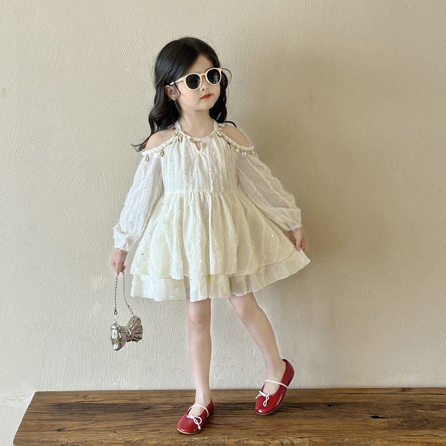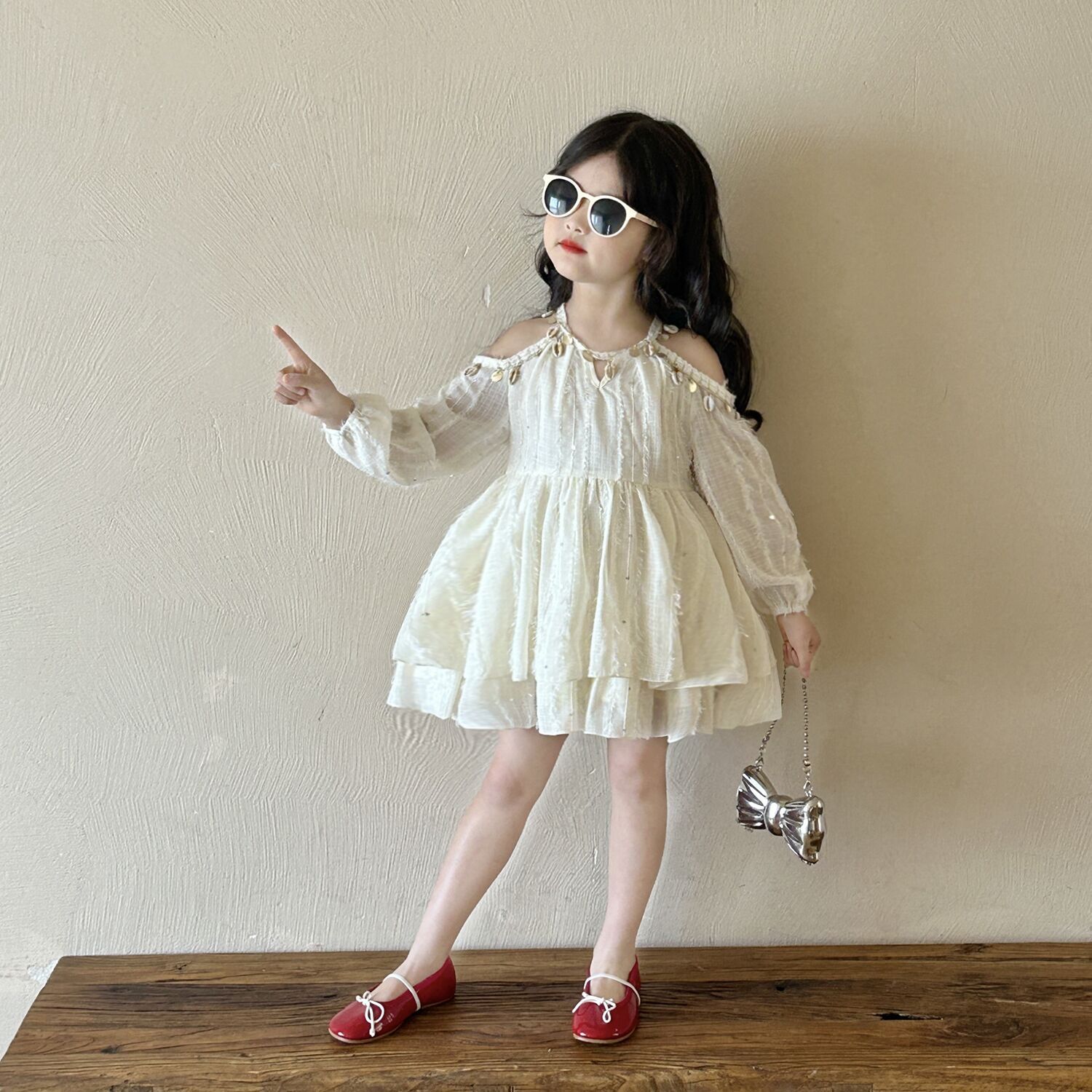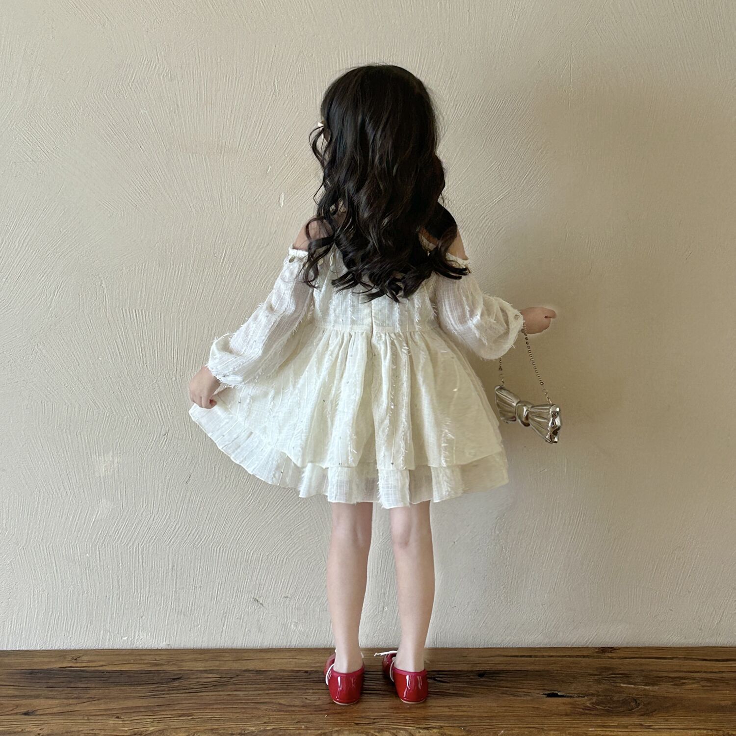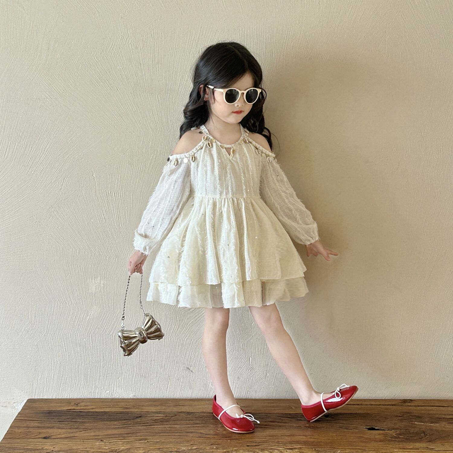 여아용 반짝이 오프숄더 긴팔 드레스 2025 가을 신상 여아용 한국 스타일 공주 드레스 생일 드레스스토어 가기