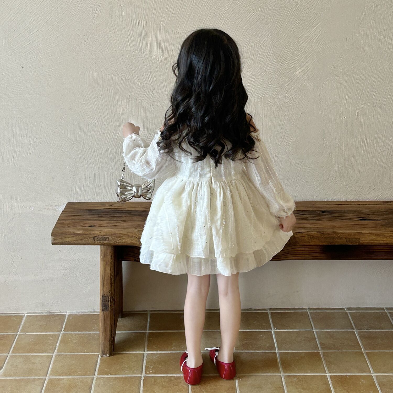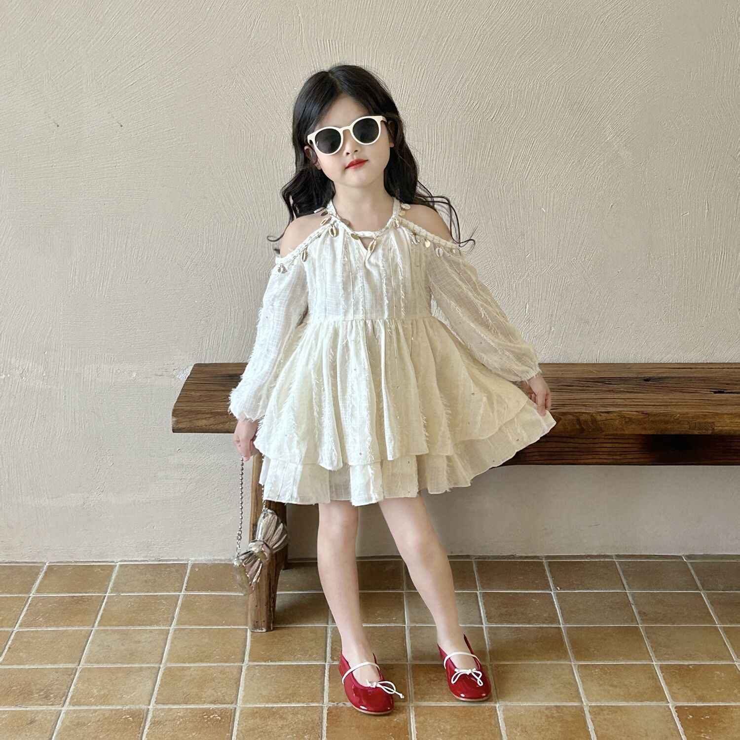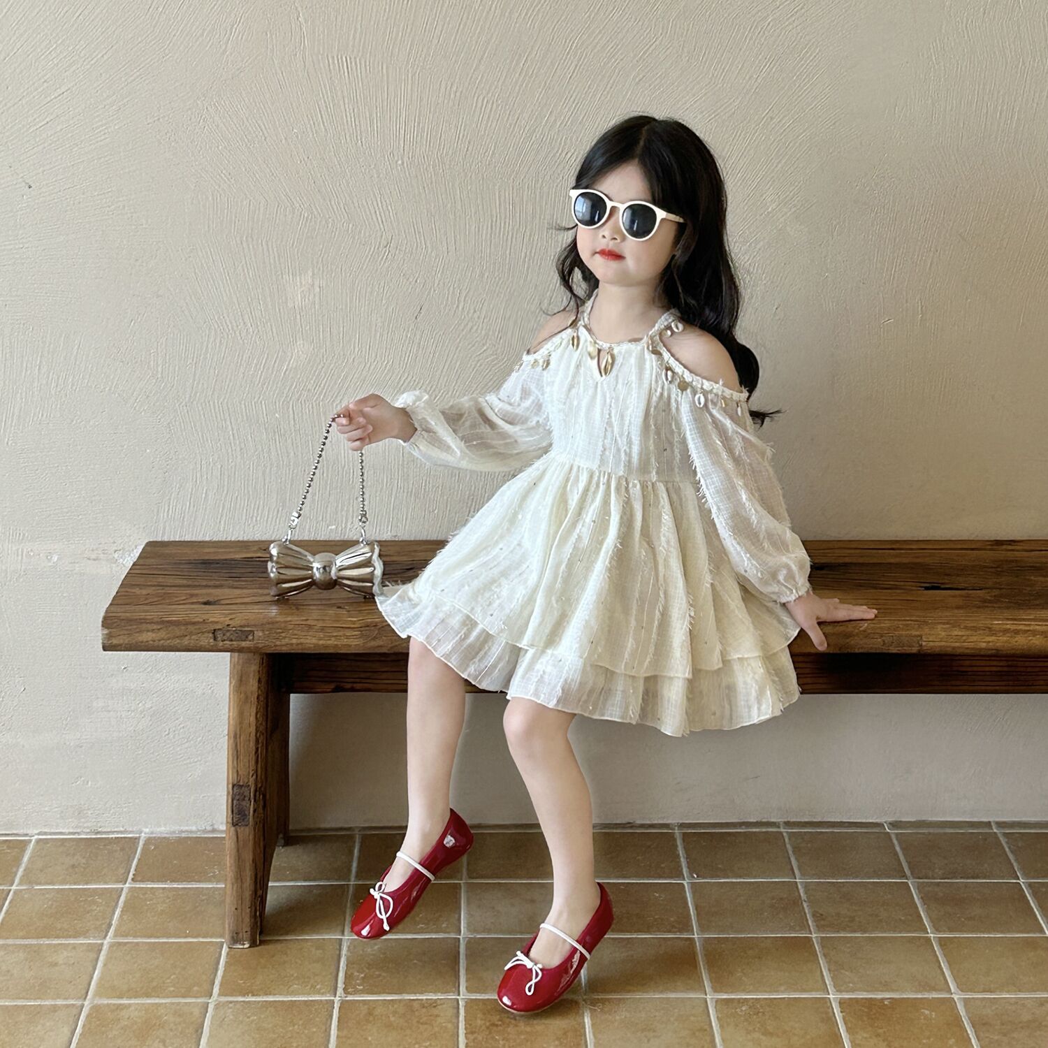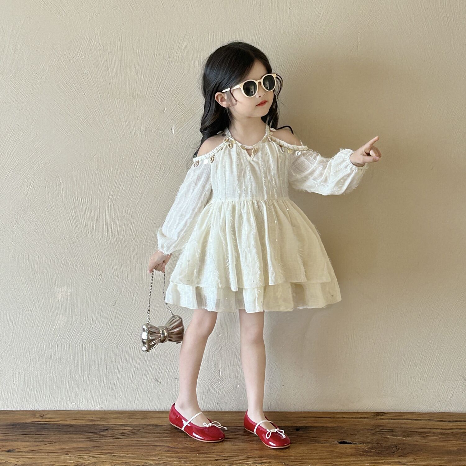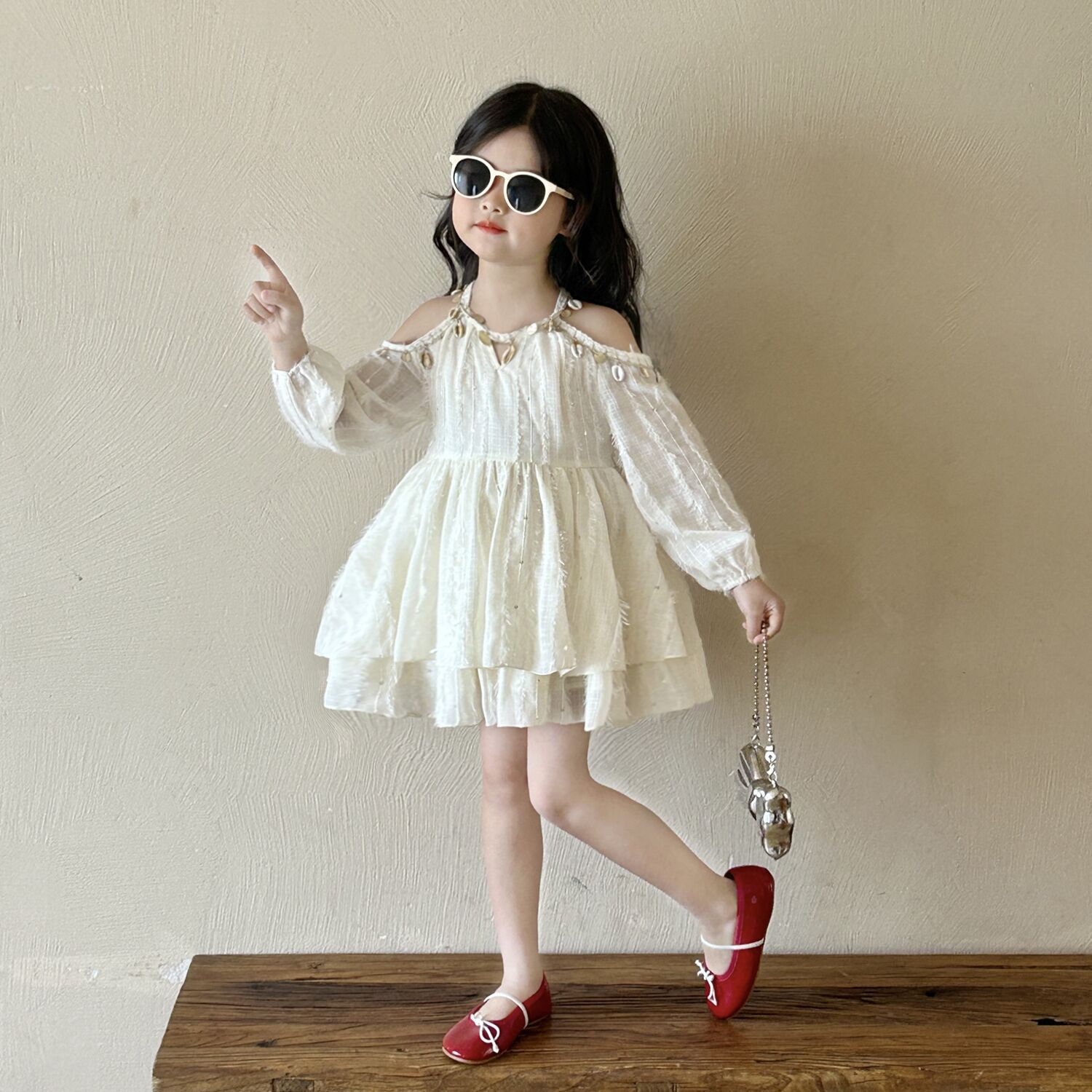 여아용 반짝이 오프숄더 긴팔 드레스 2025 가을 신상 여아용 한국 스타일 공주 드레스 생일 드레스스토어 가기