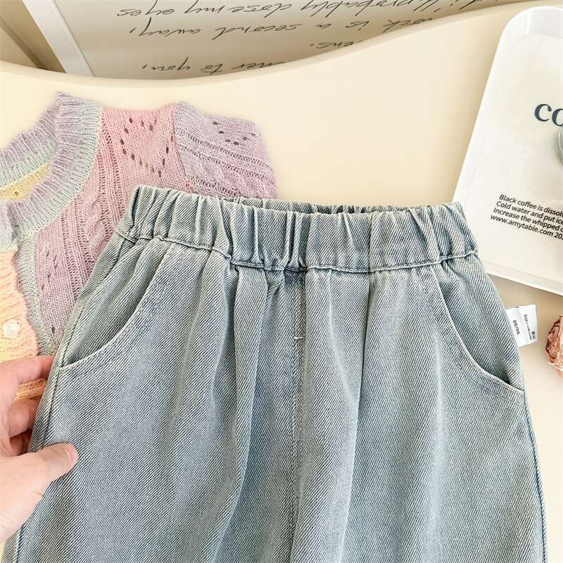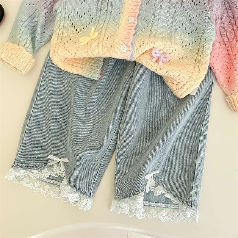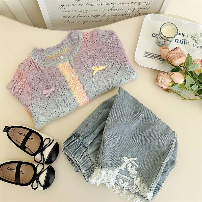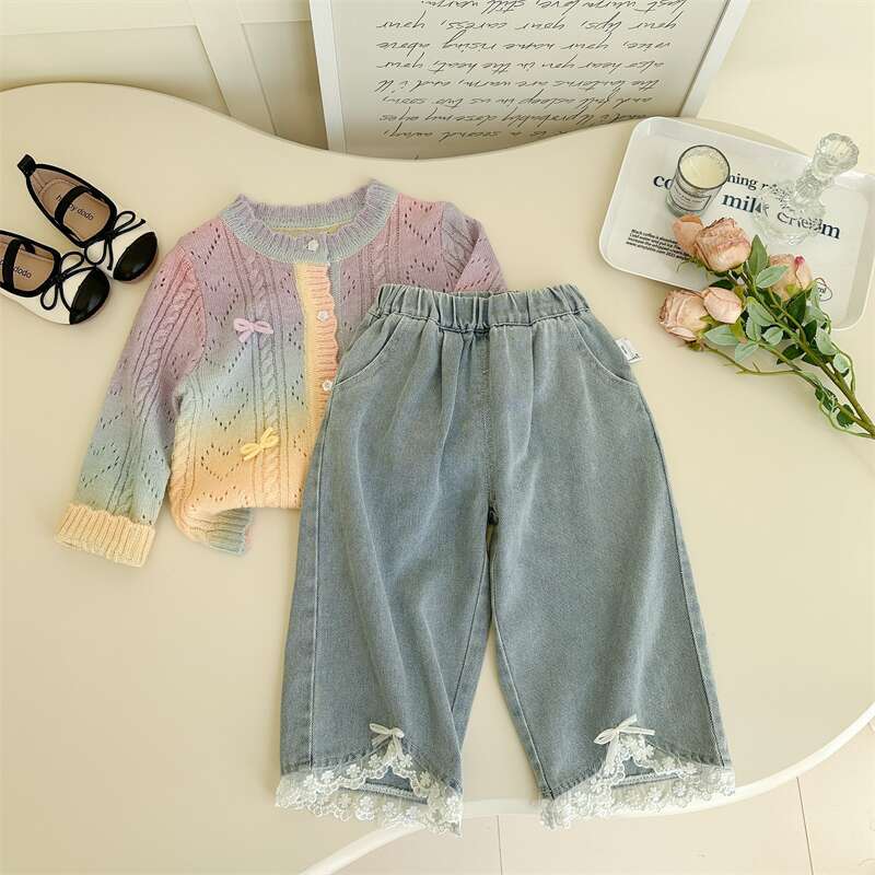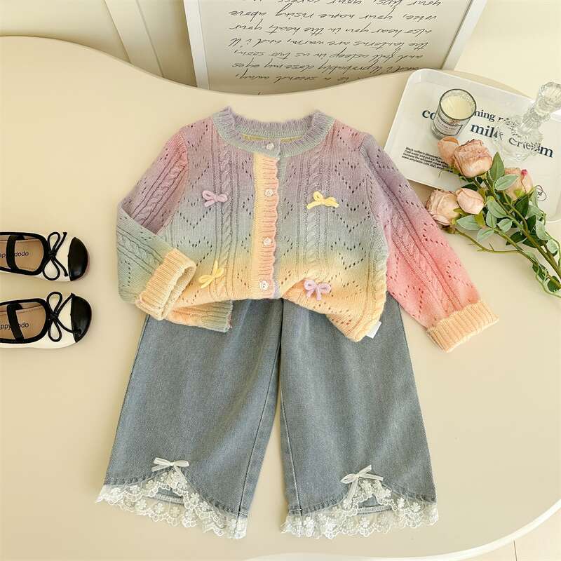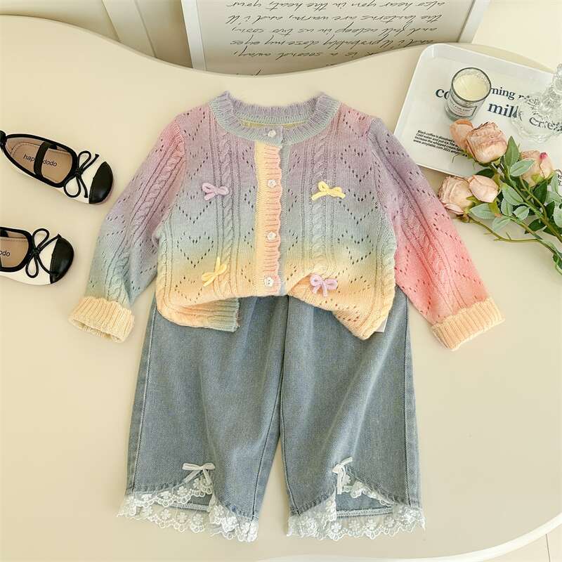 Tongxingyuan 소녀 스웨터 봄 새로운 베이비 카디건 코트 스웨터 그라디언트 스웨터 청바지 세트