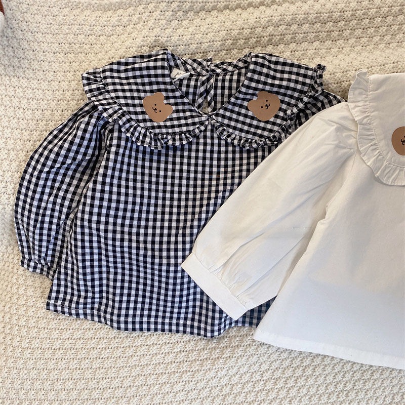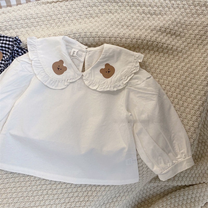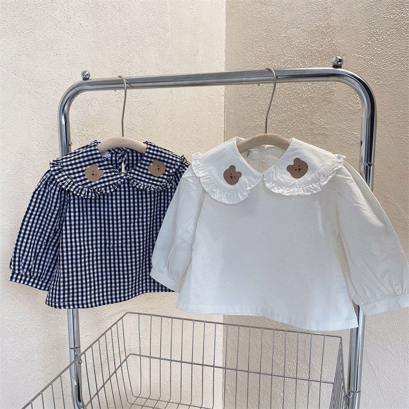 봄과 가을 여성 어린이 착용 셔츠 인형 셔츠 아기 세련된 어린이 성격 유행 한국 격자 무늬 만화 인형 목걸이 셔츠스토어 가기