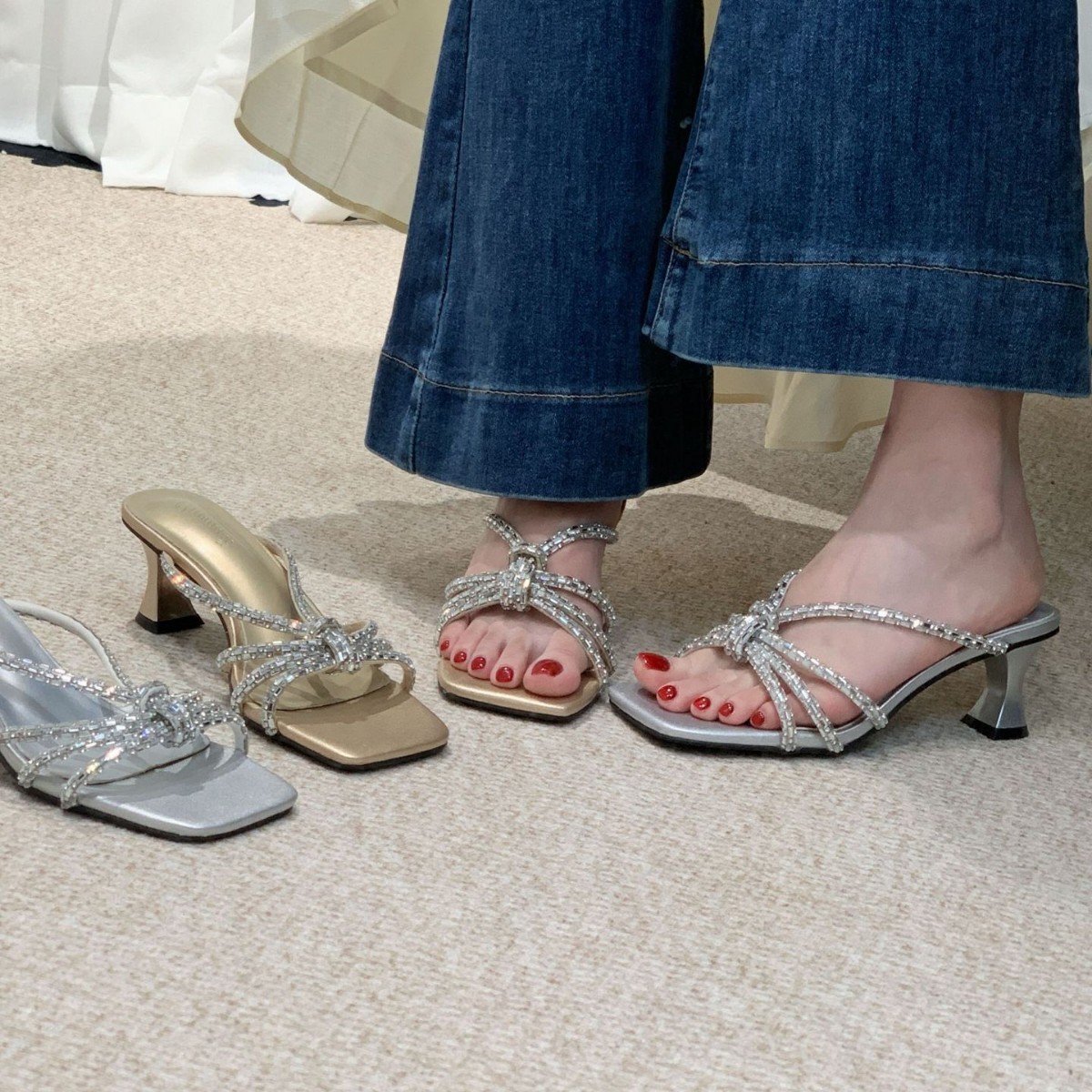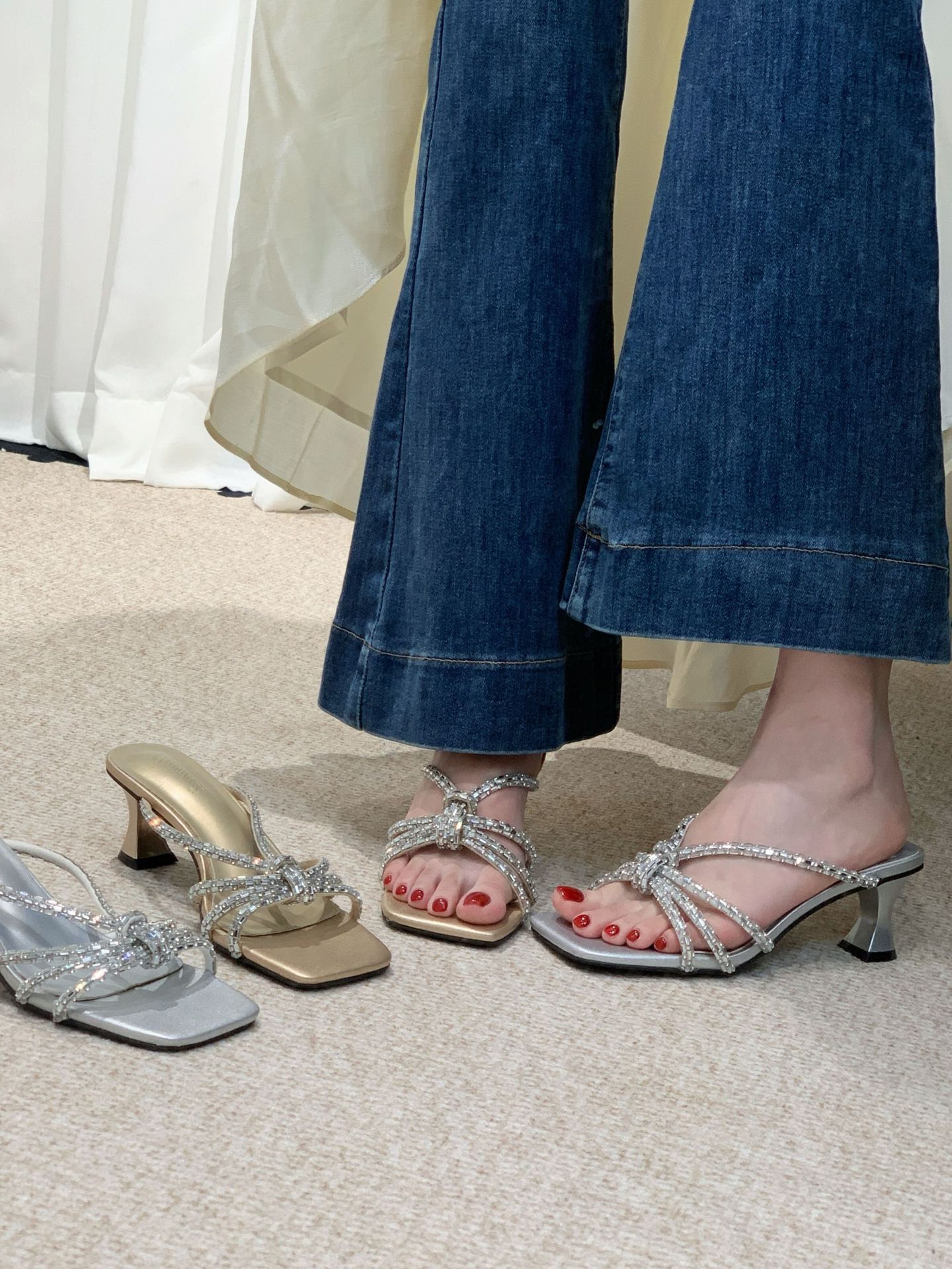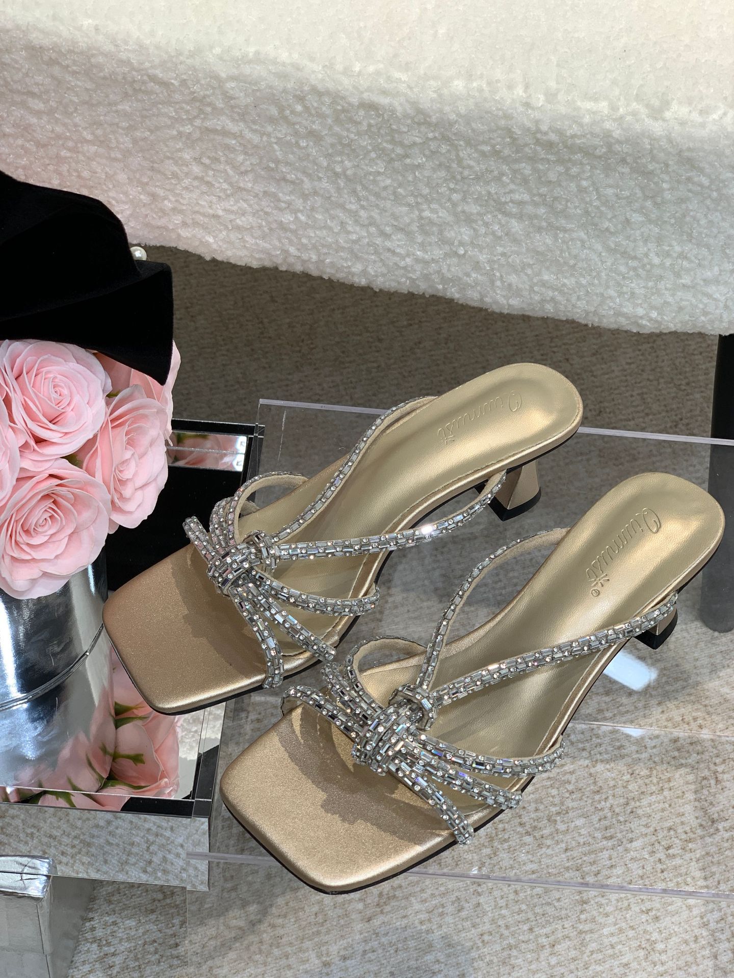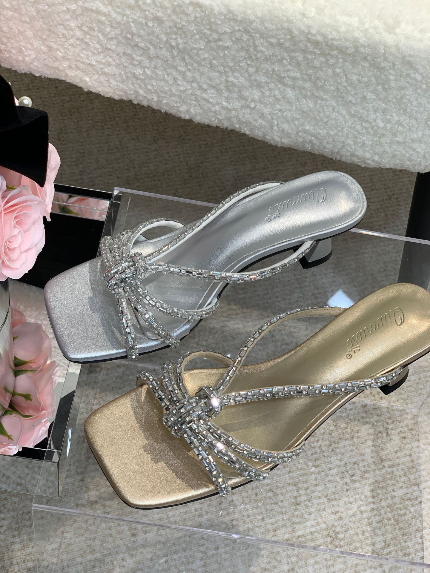 2025 년 여름 새 투명 신발 샌들 여성용 아웃웨어 패션 올매치 두꺼운 굽 크리스탈 슬리퍼 스퀘어 힐 하이힐스토어 가기