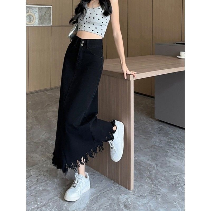 Tassel Back Split 데님 스커트 여성 여름 새로운 높은 허리 슬리밍 느슨한 A-라인 덮힌 중간 길이의 힙합 스커트