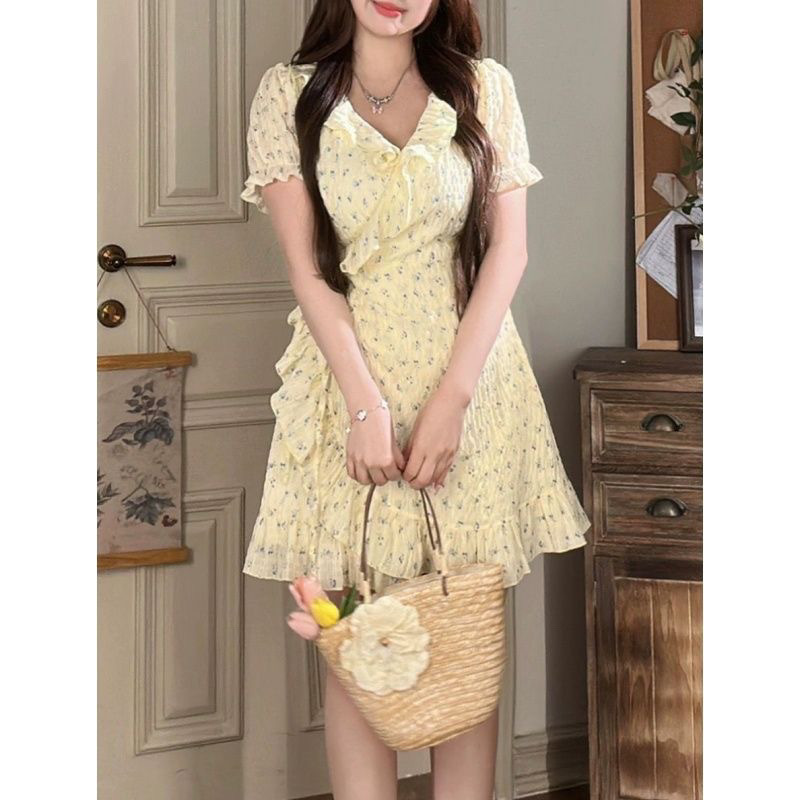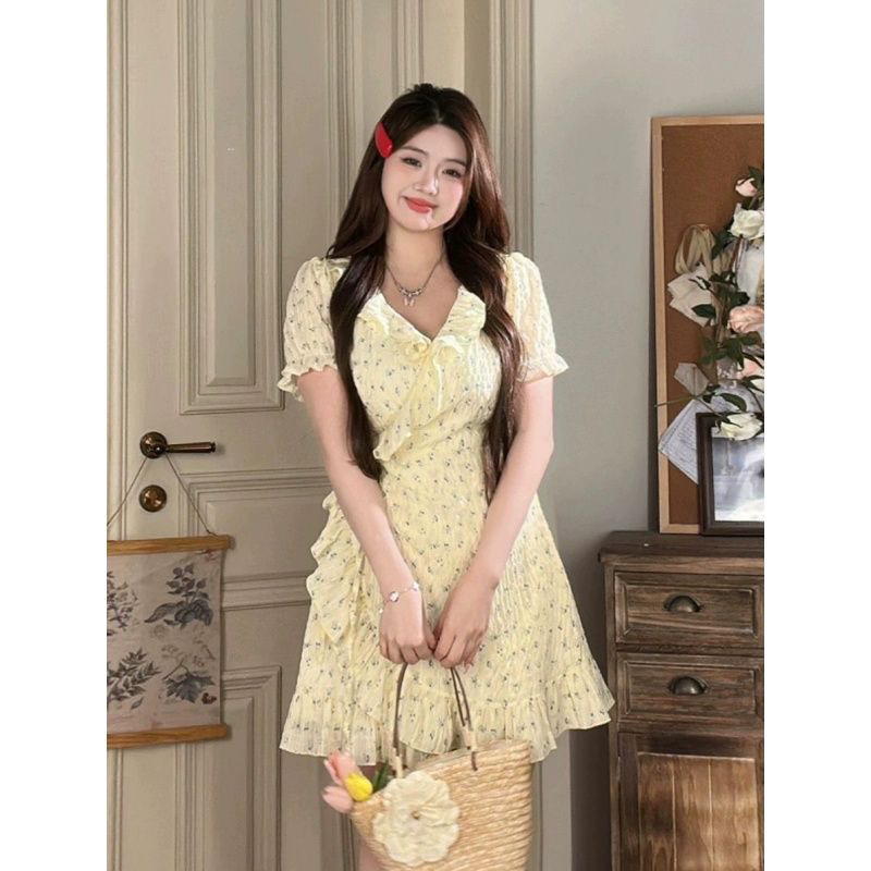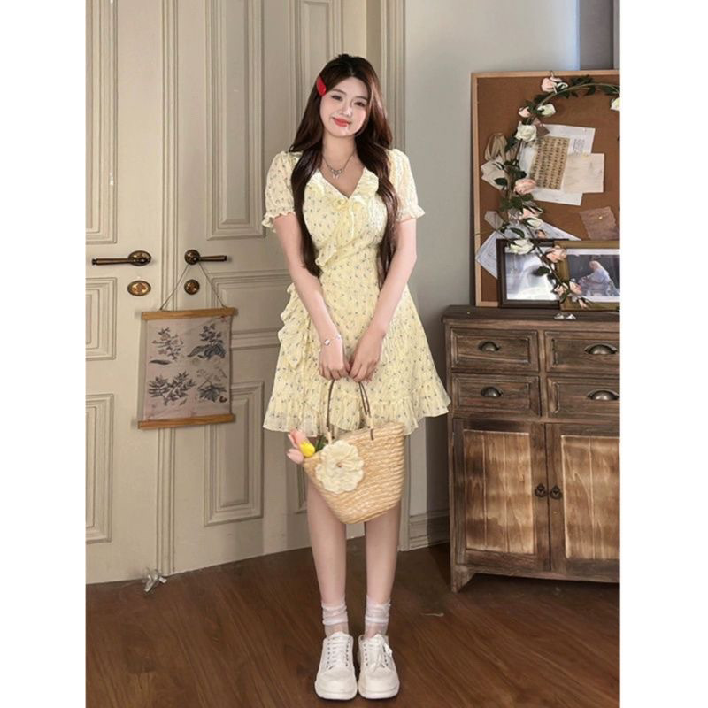 통통한 여름 새로운 원피스 여성 프랑스 스타일 우아한 달콤한 꽃 러플 슬리밍 부드러운 꽃 치마스토어 가기