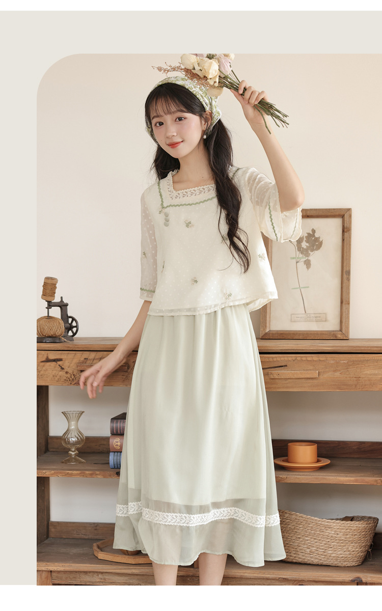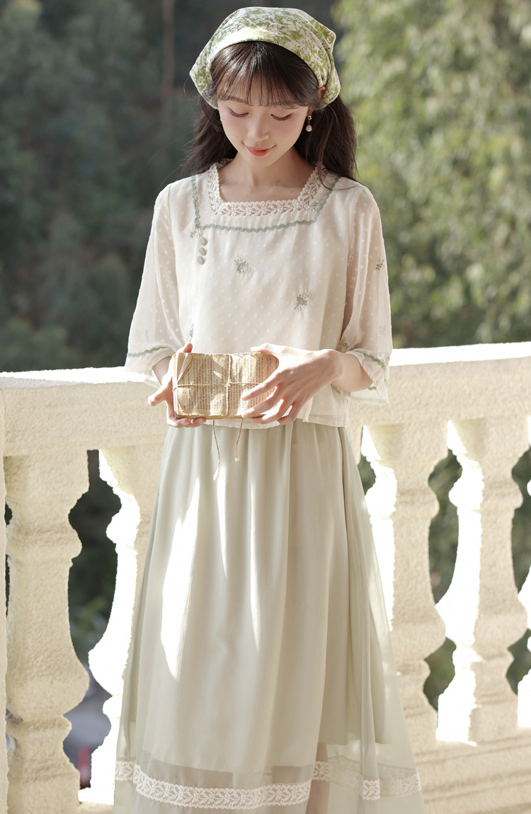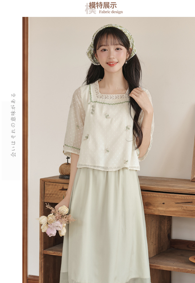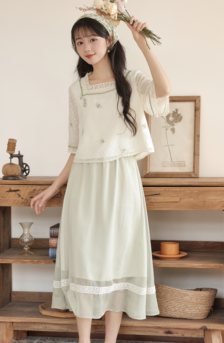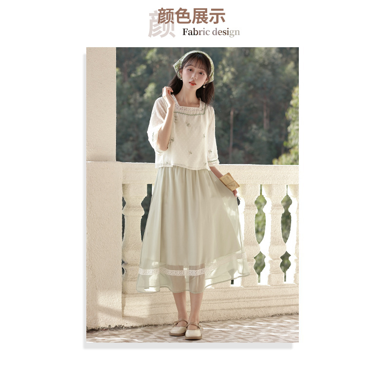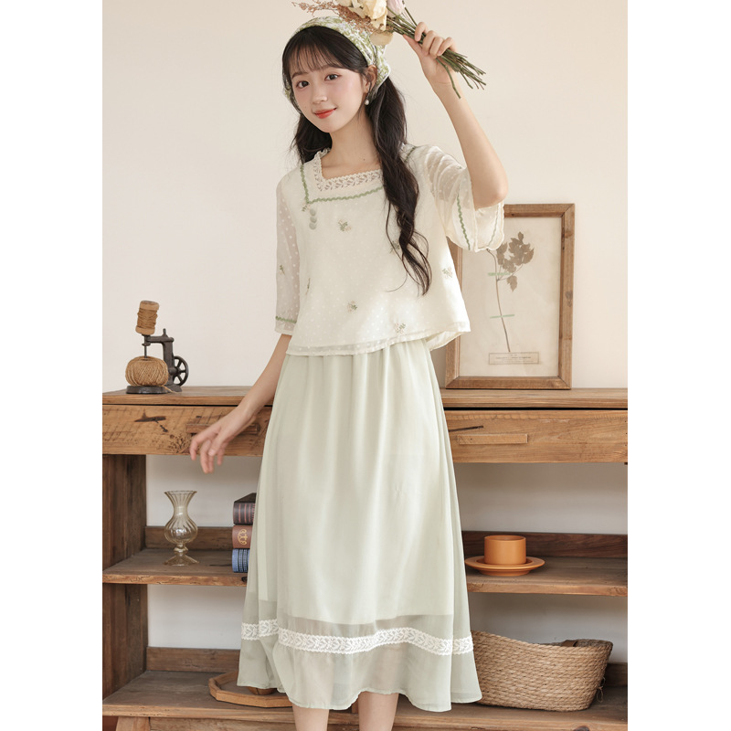 새로운 중국 스타일 여성 원피스 세트 2025 봄/여름 중국 스타일 학생 자수 사각 목 짧은 소매 셔츠