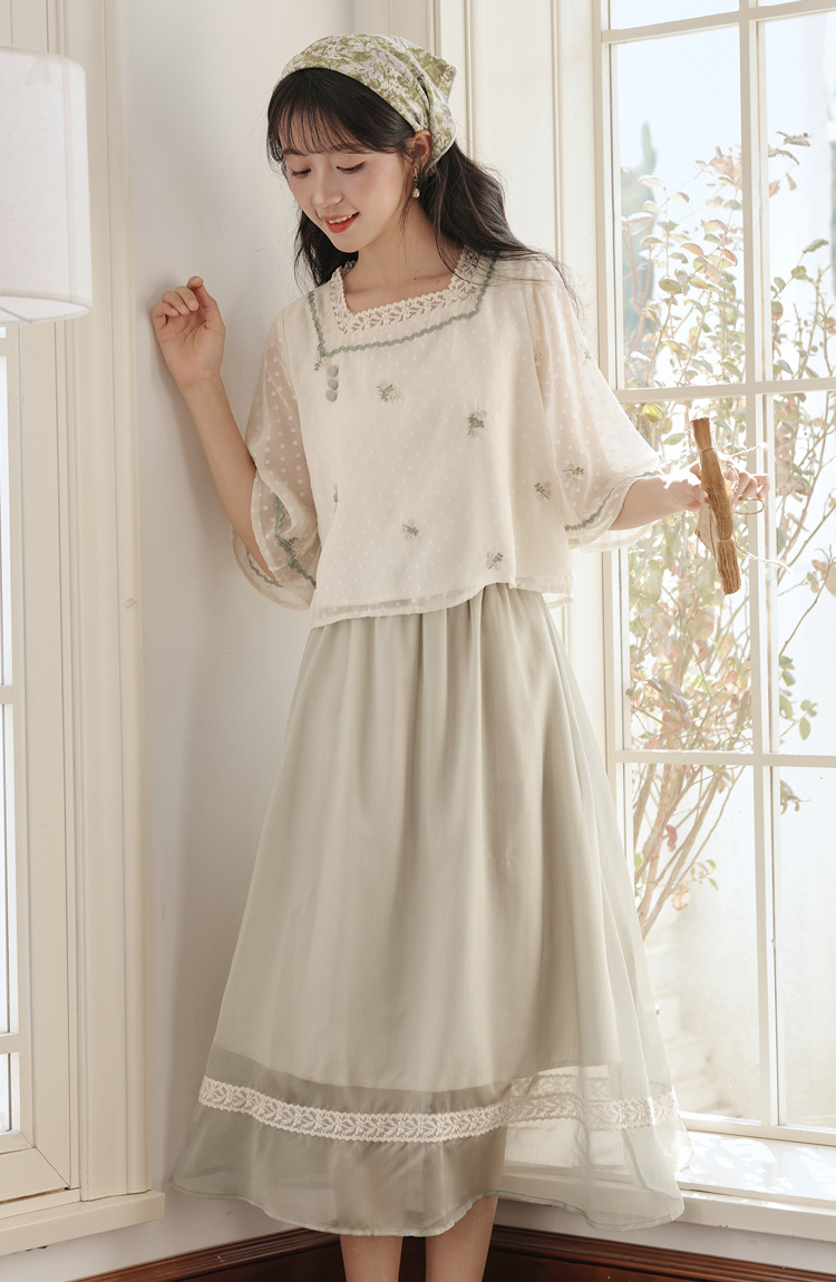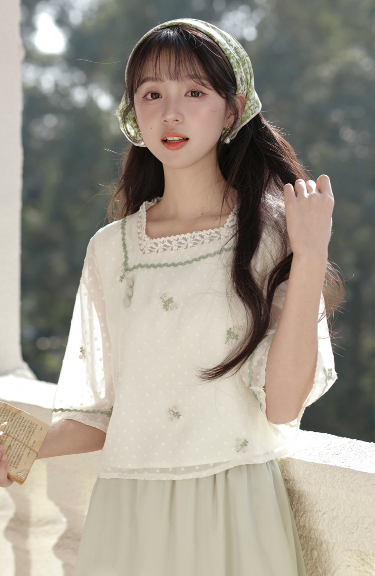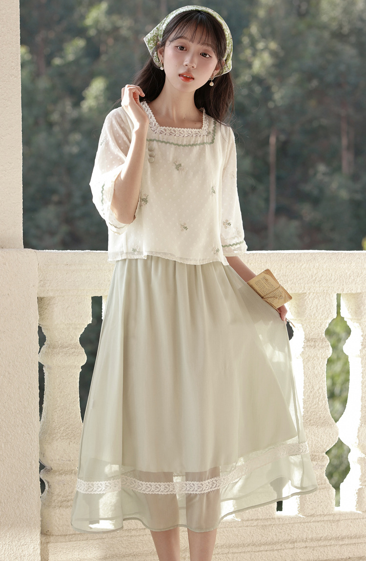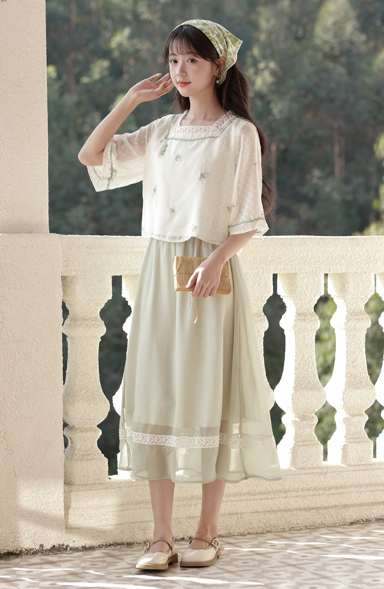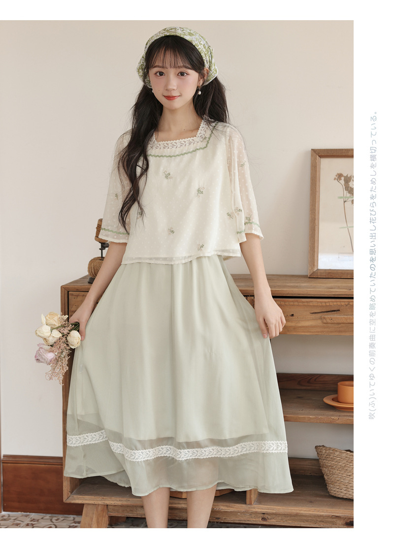 새로운 중국 스타일 여성 원피스 세트 2025 봄/여름 중국 스타일 학생 자수 사각 목 짧은 소매 셔츠