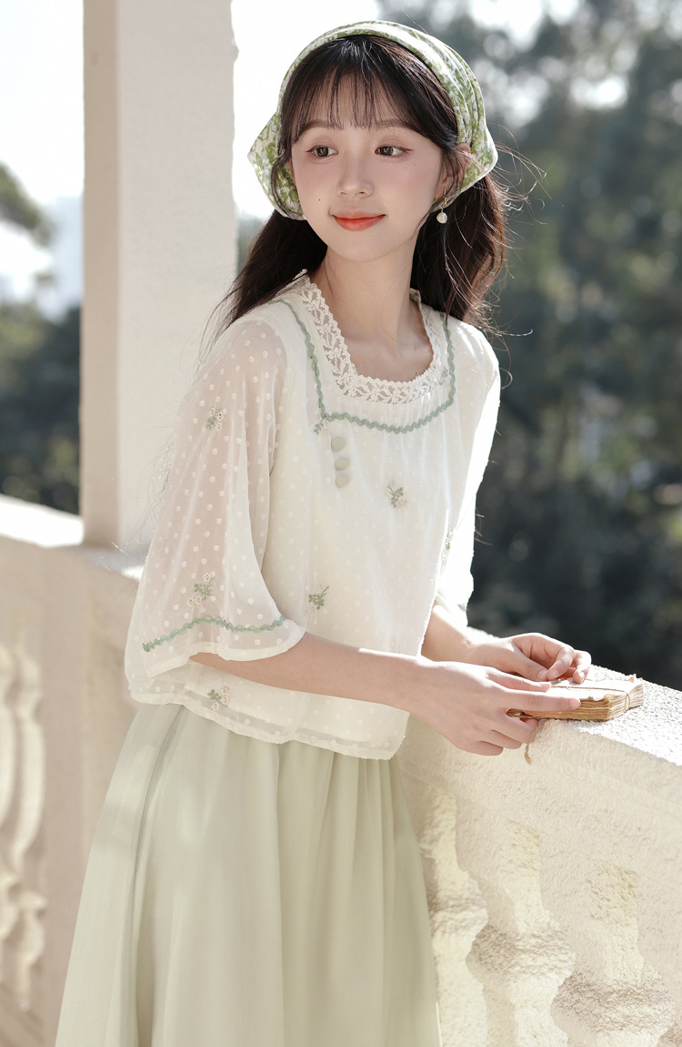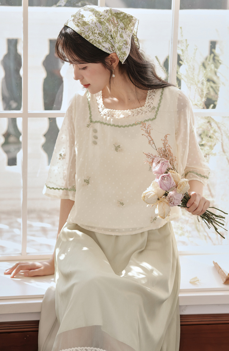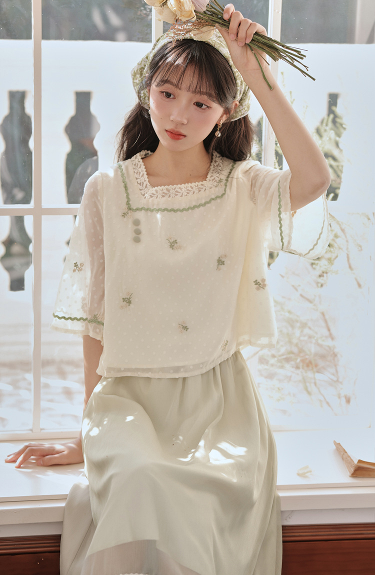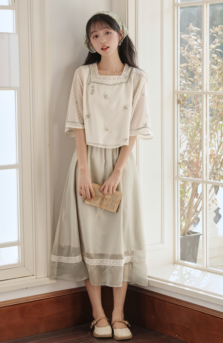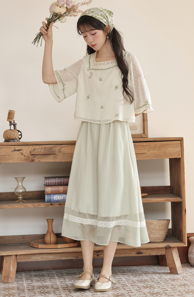 새로운 중국 스타일 여성 원피스 세트 2025 봄/여름 중국 스타일 학생 자수 사각 목 짧은 소매 셔츠