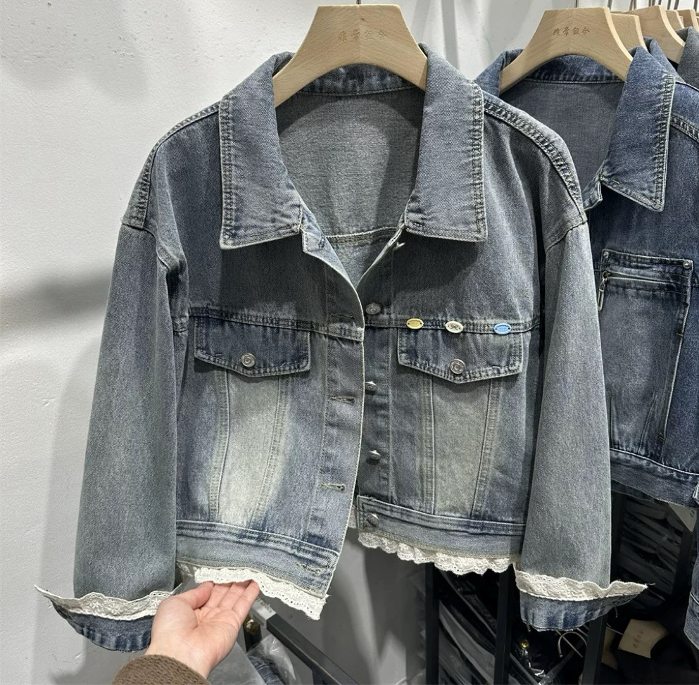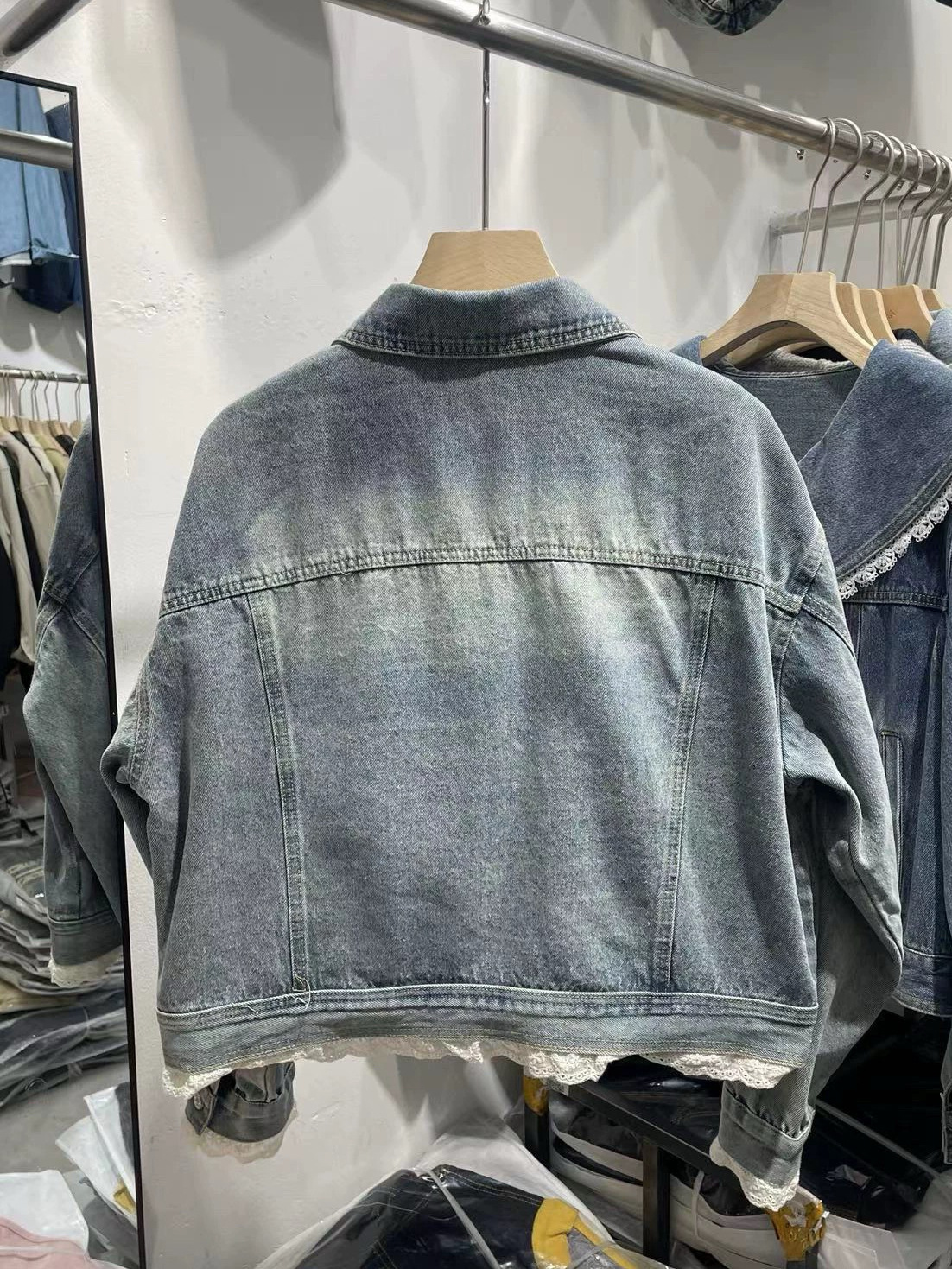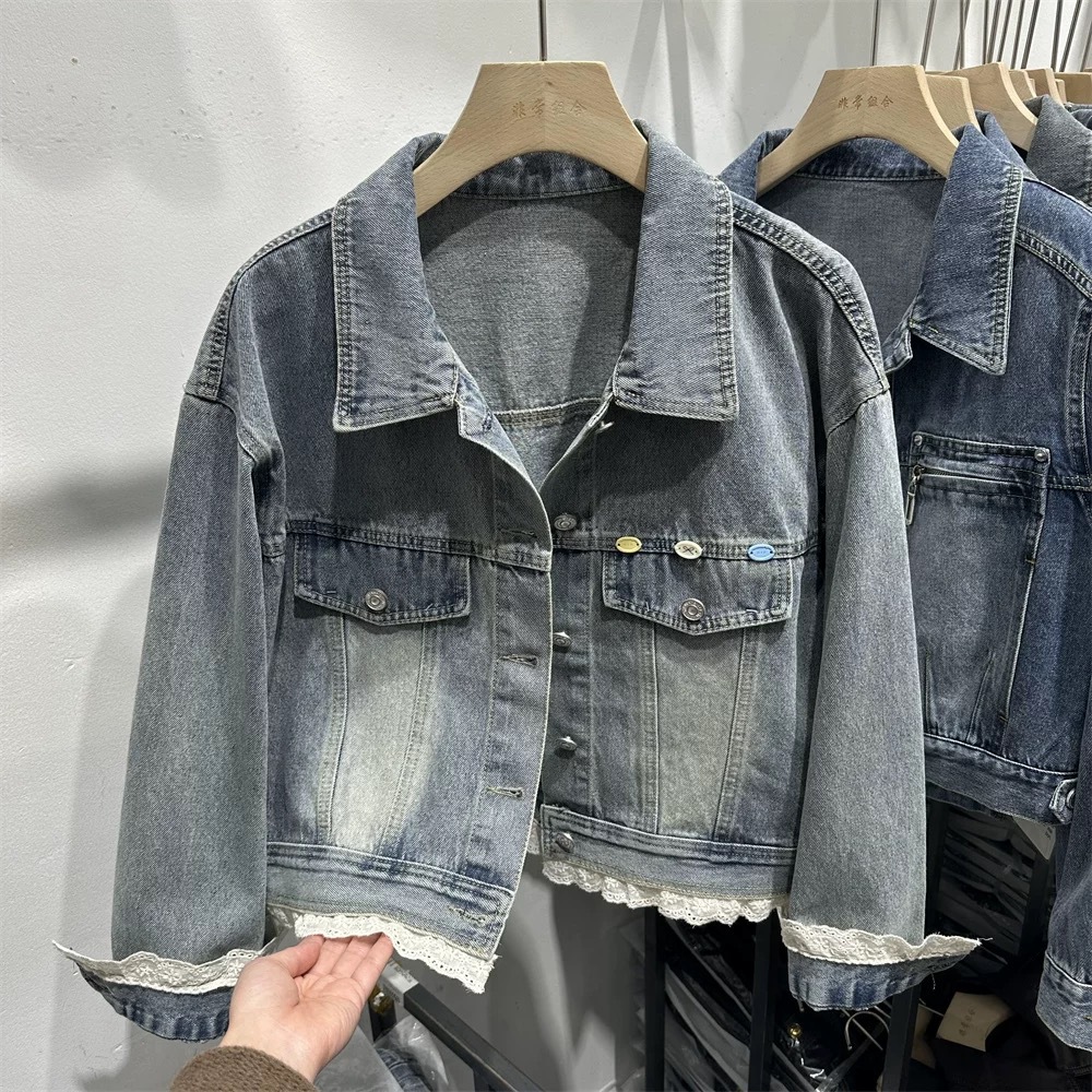 Aiyixuan 봄 인기 데님 쇼트 코트 여성 한국식 레이스 스티칭 레트로 스위트 캐주얼 재킷