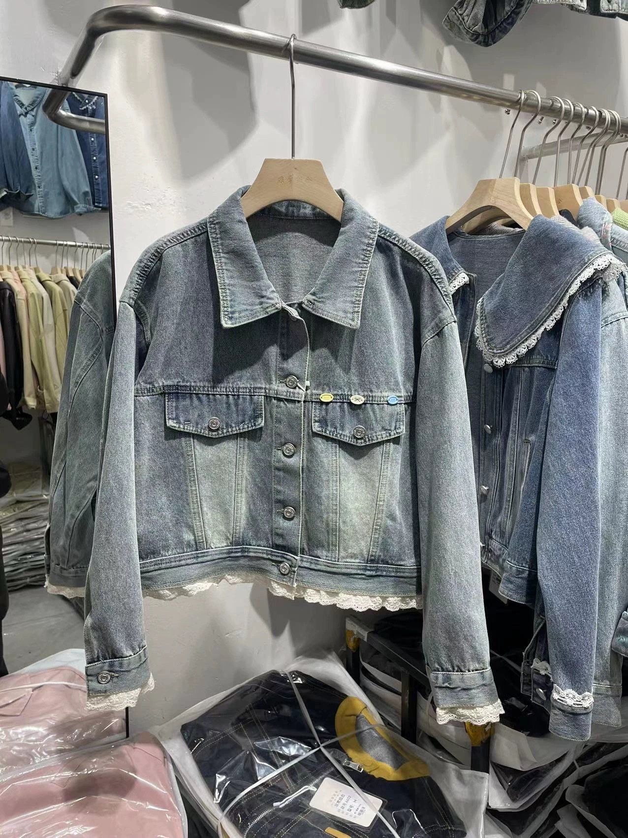 Aiyixuan 봄 인기 데님 쇼트 코트 여성 한국식 레이스 스티칭 레트로 스위트 캐주얼 재킷스토어 가기
