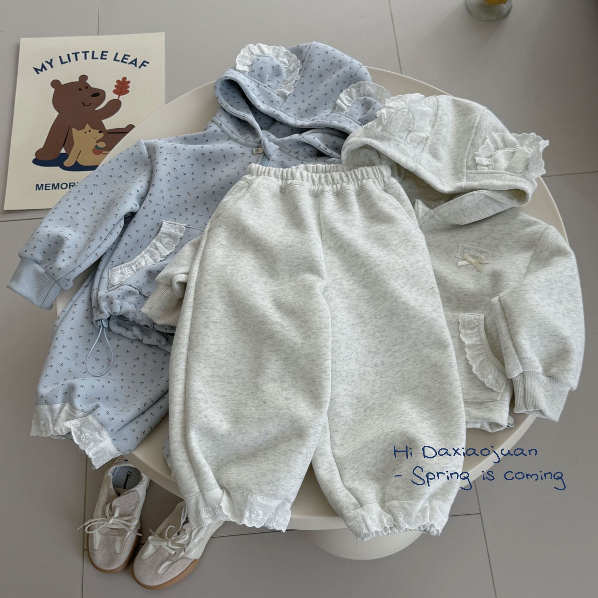 스팟 사이즈 롤 25 봄과 가을 귀여운 소녀 레이스 작은 귀 후드 지퍼 자켓 캐주얼 바지 투피스 슈트스토어 가기