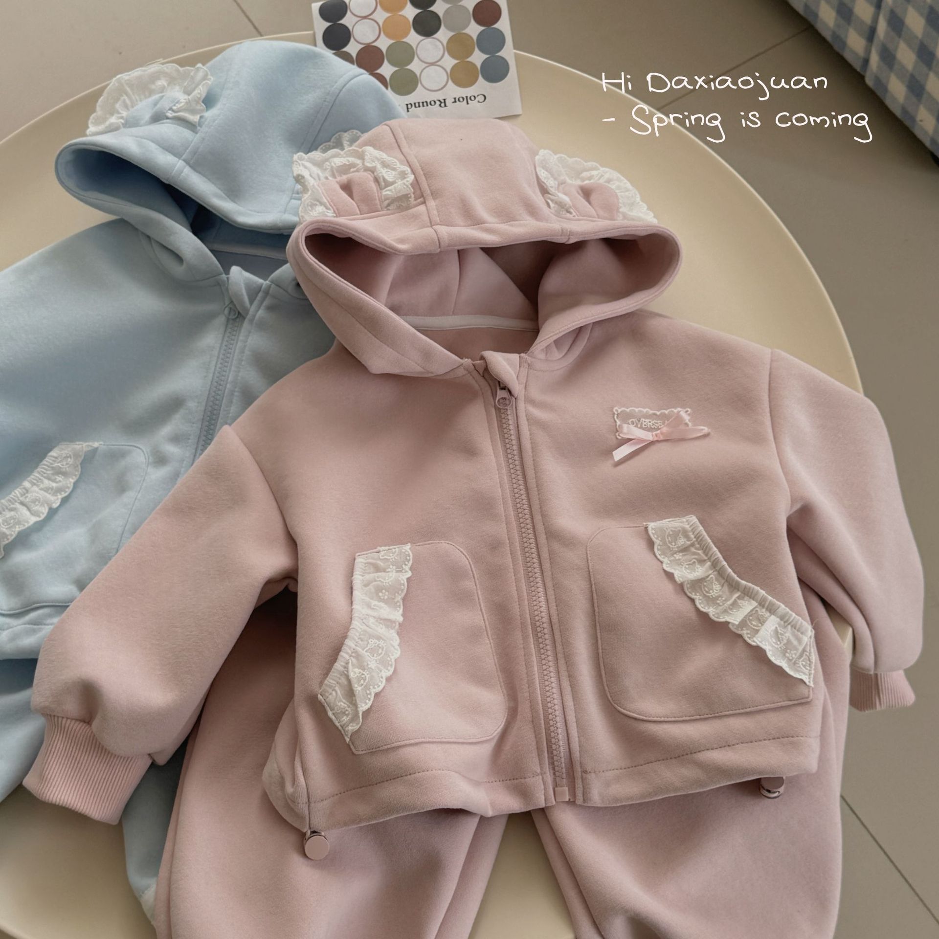 스팟 사이즈 롤 25 봄과 가을 귀여운 소녀 레이스 작은 귀 후드 지퍼 자켓 캐주얼 바지 투피스 슈트