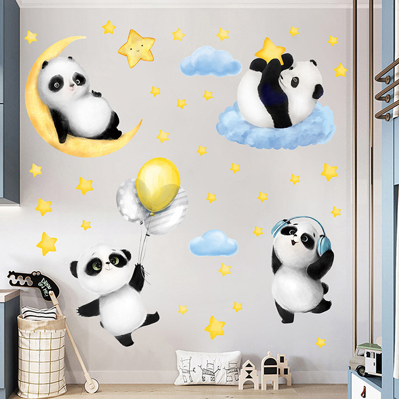 만화 동물 팬더 달 구름 창조적 인 벽 스티커 어린이 침실 배경 장식 스티커 CH40606