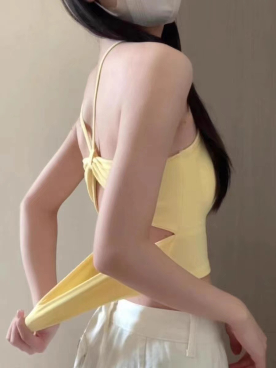 순수한 매력의 여성용 노란색 백리스 탑, 일체형 가슴 패드가 있는 한국 스타일의 아름다운 등라인 브라탑