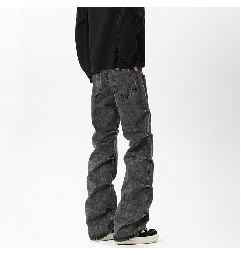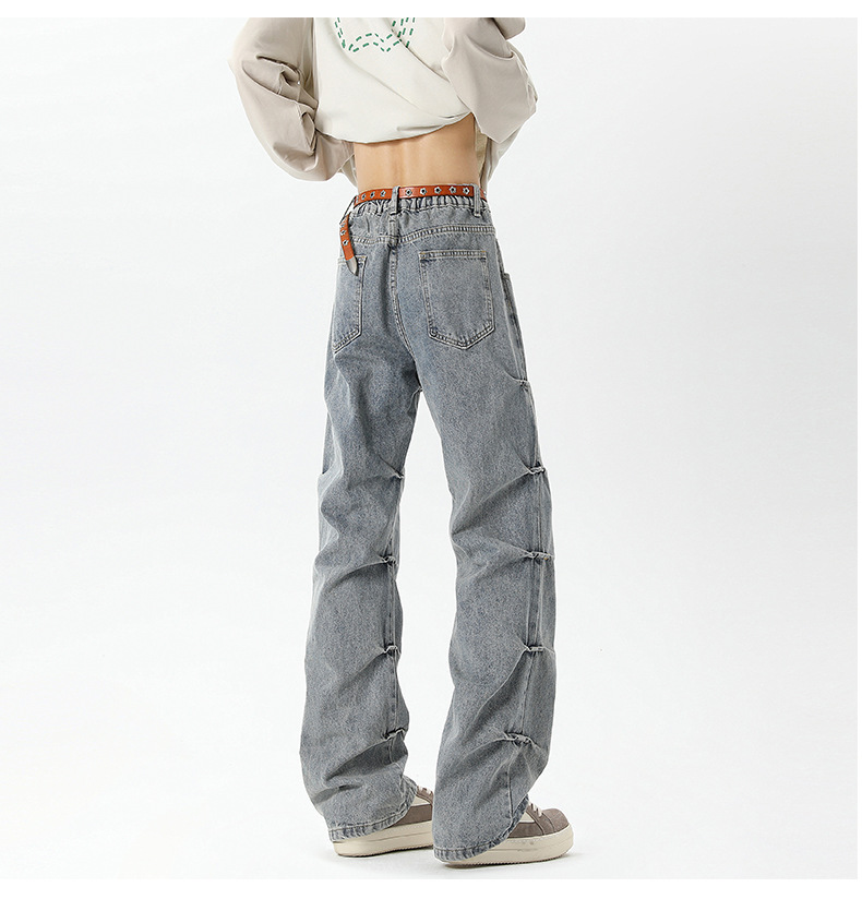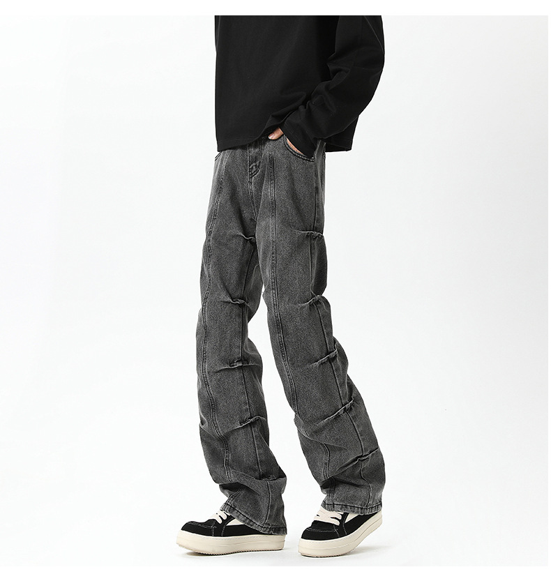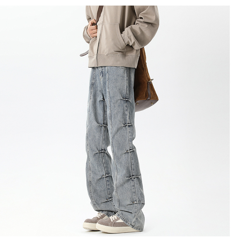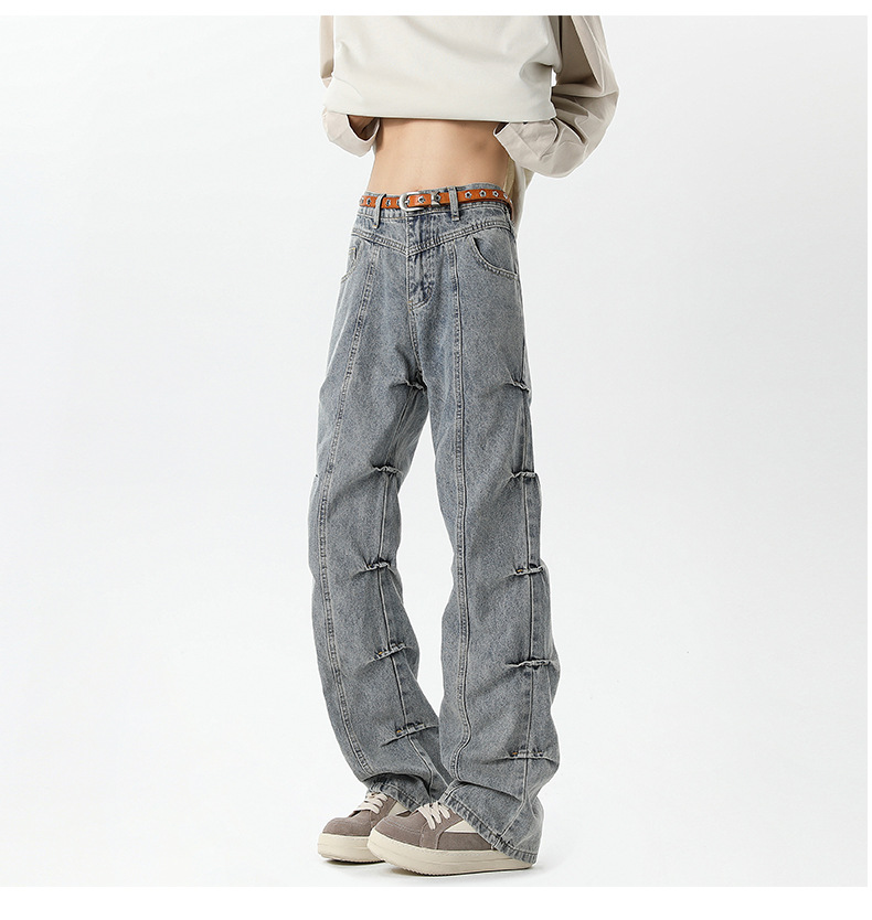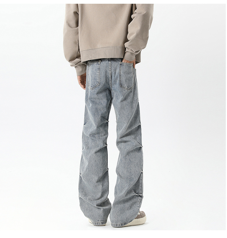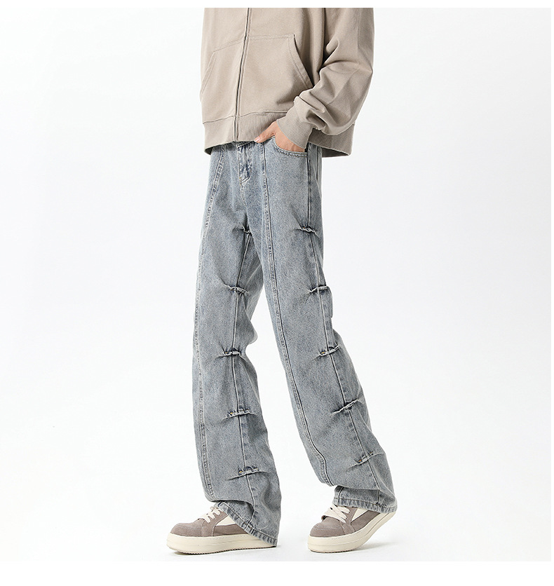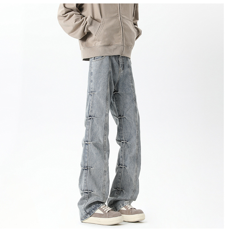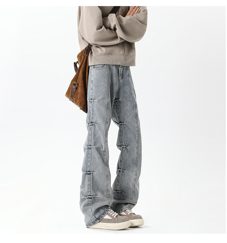 남성용 맞춤형 아메리칸 레트로 플리츠 청바지, 새로운 하이 스트리트 틈새 디자인 바지, 스트레이트 핏 슬림핏 부츠컷 팬츠스토어 가기