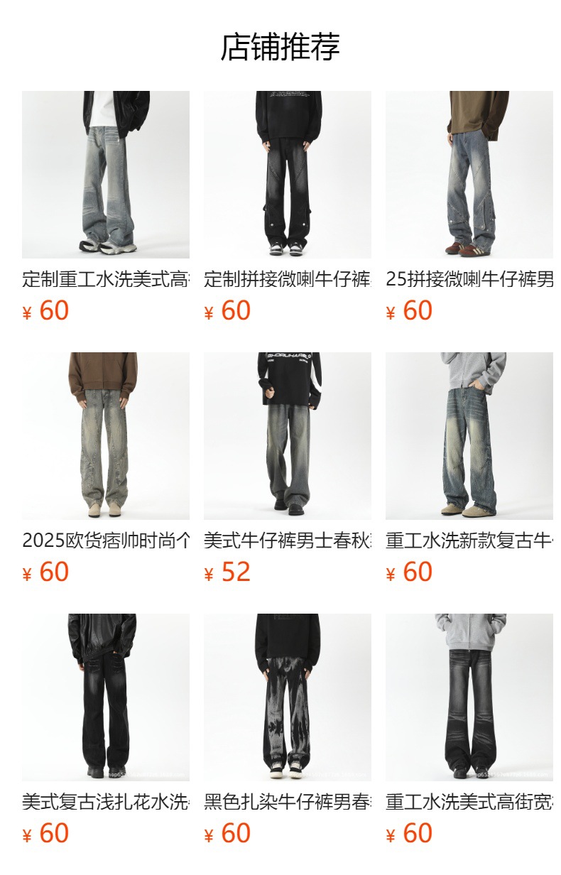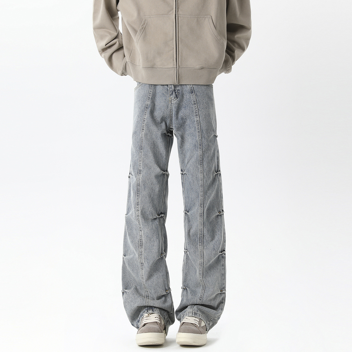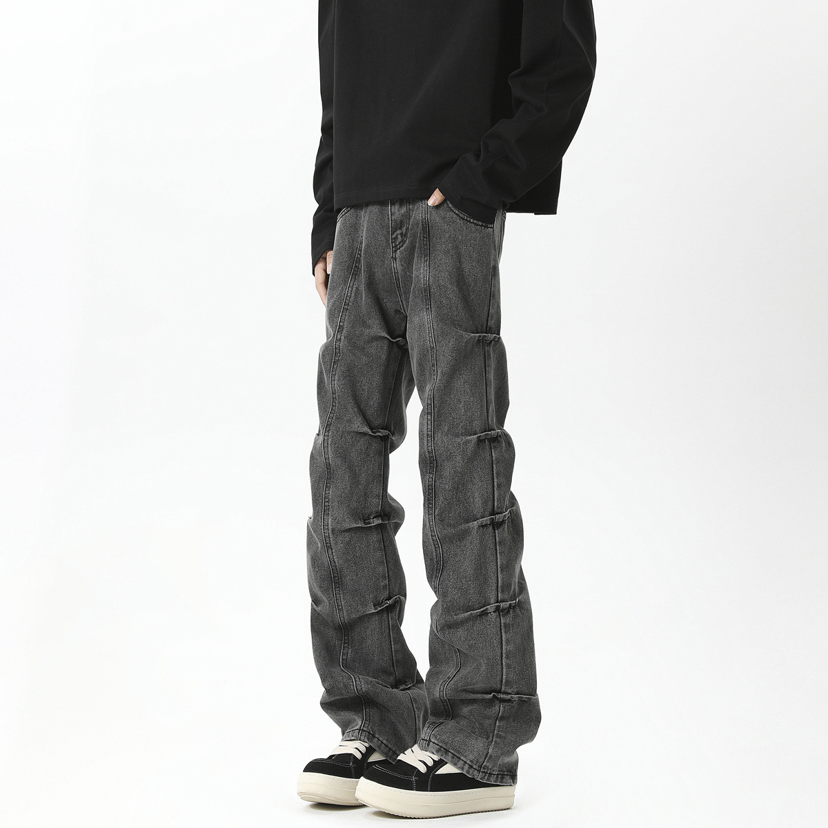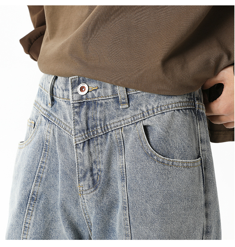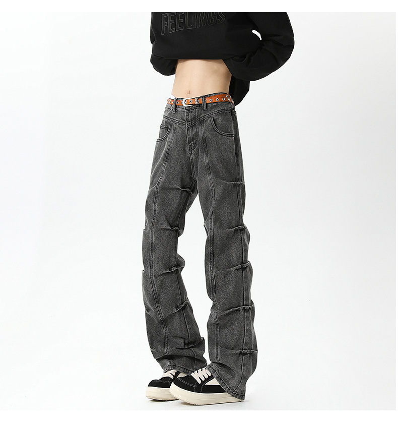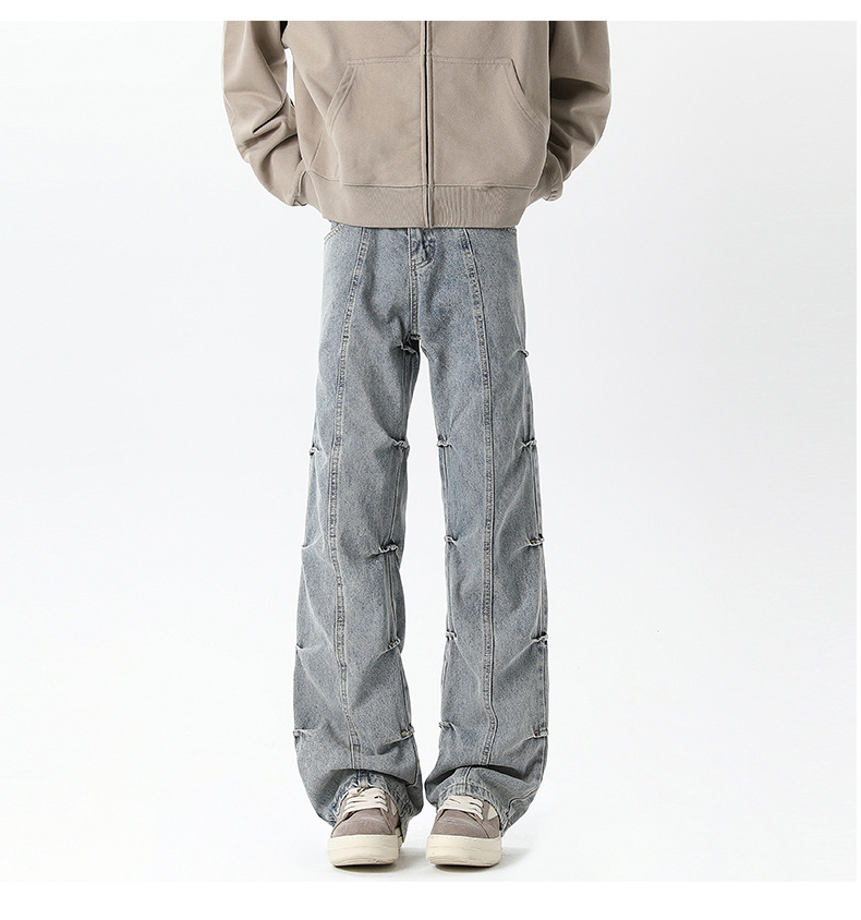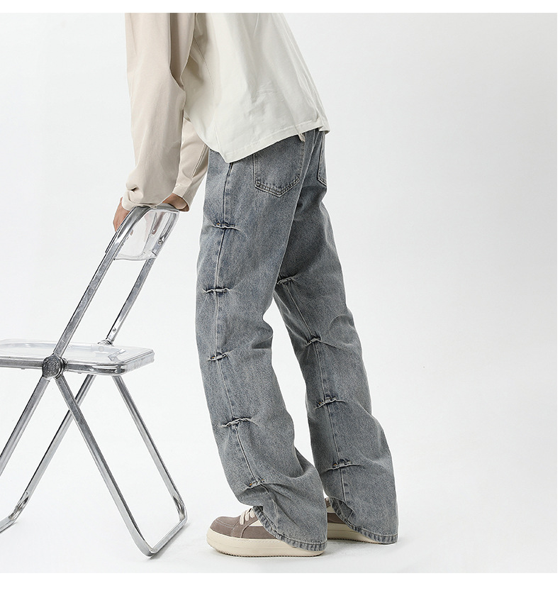 남성용 맞춤형 아메리칸 레트로 플리츠 청바지, 새로운 하이 스트리트 틈새 디자인 바지, 스트레이트 핏 슬림핏 부츠컷 팬츠스토어 가기