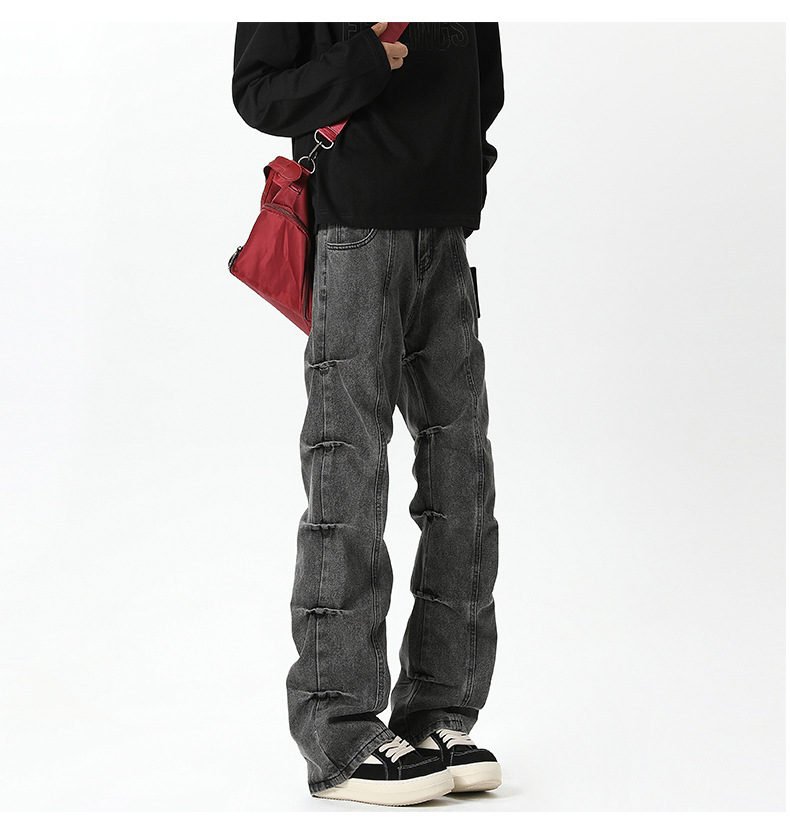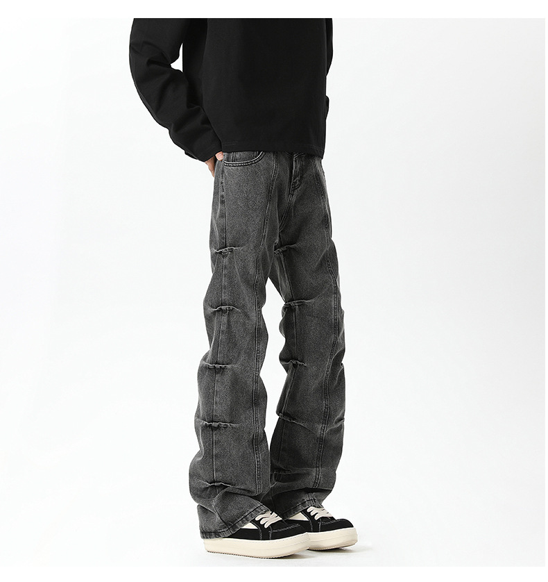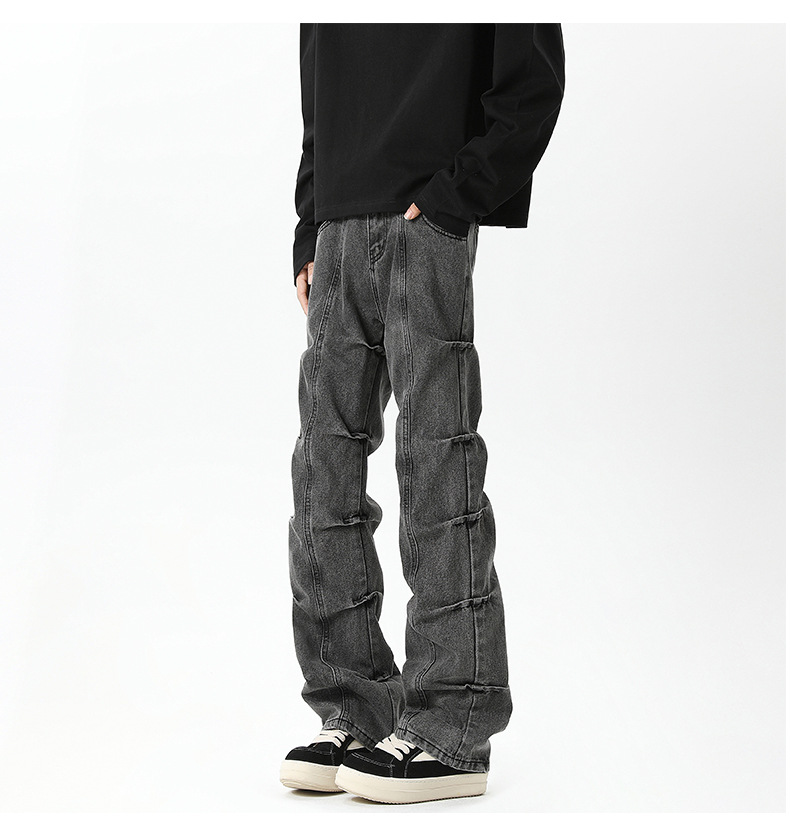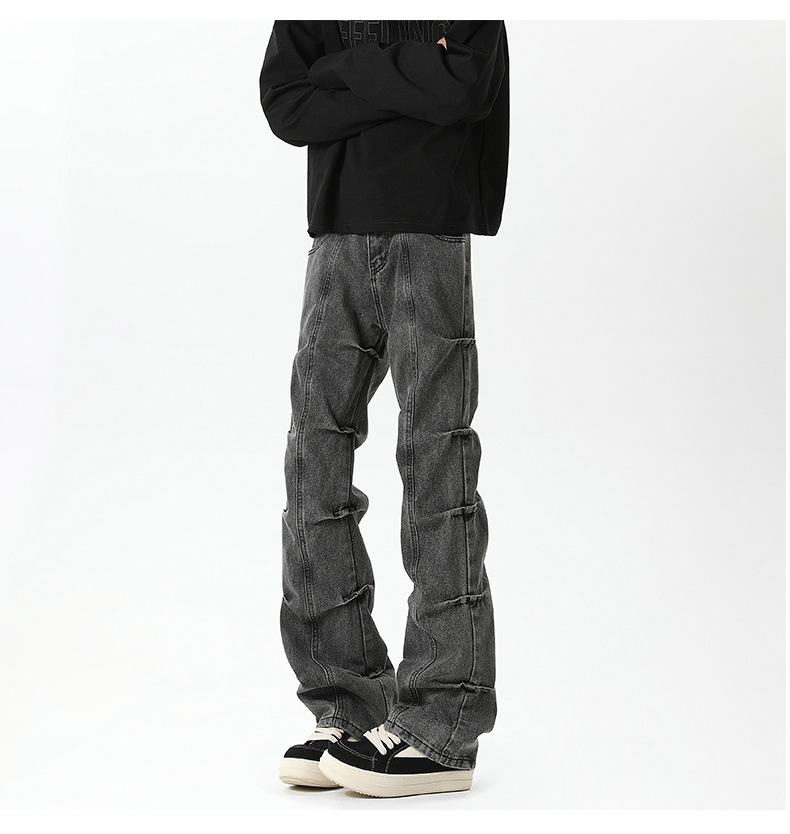 남성용 맞춤형 아메리칸 레트로 플리츠 청바지, 새로운 하이 스트리트 틈새 디자인 바지, 스트레이트 핏 슬림핏 부츠컷 팬츠