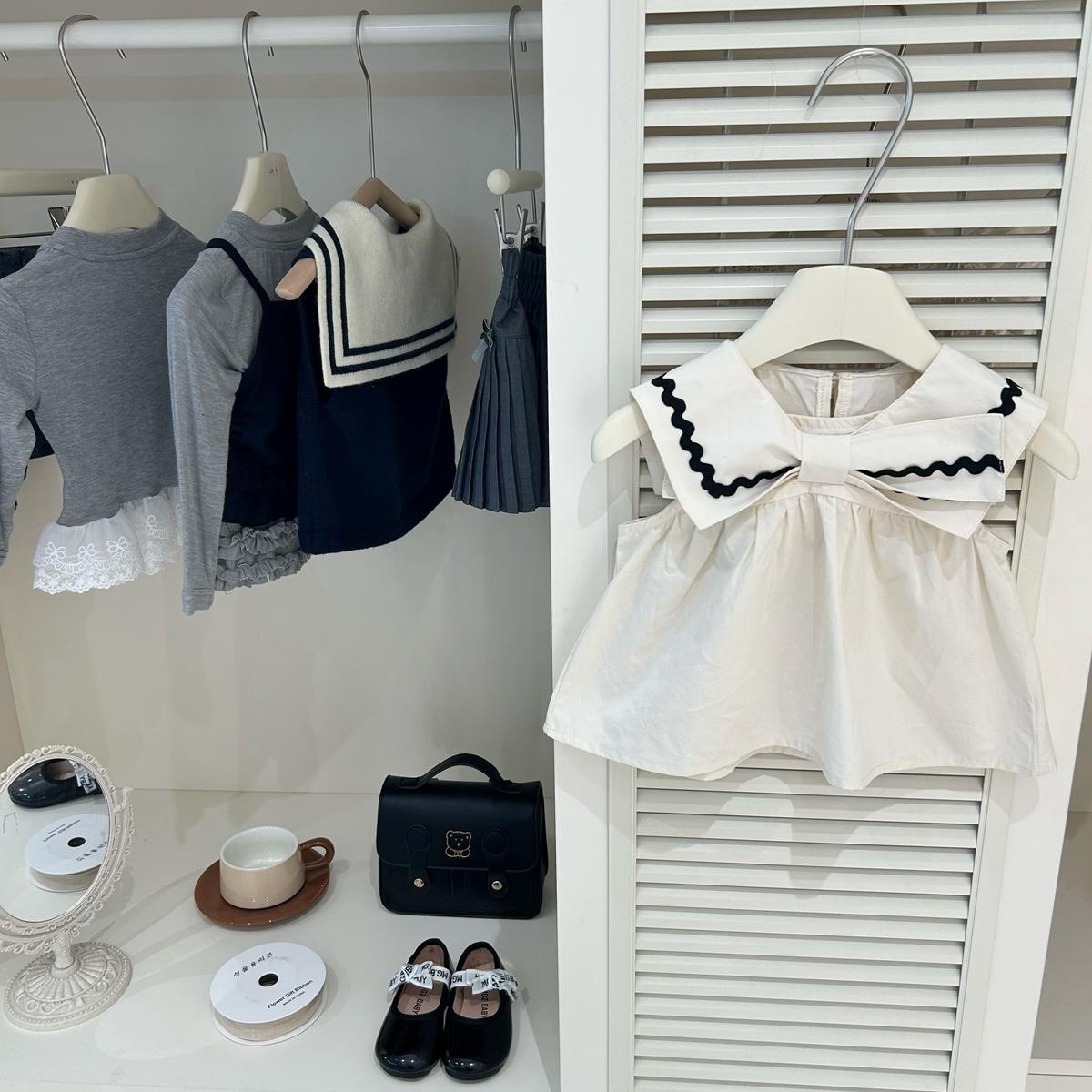 [통 싱위안] 2025 년 여름 소녀 해군 칼라 인형 셔츠 조끼 검은 색 주름진 반바지 유행 세트스토어 가기