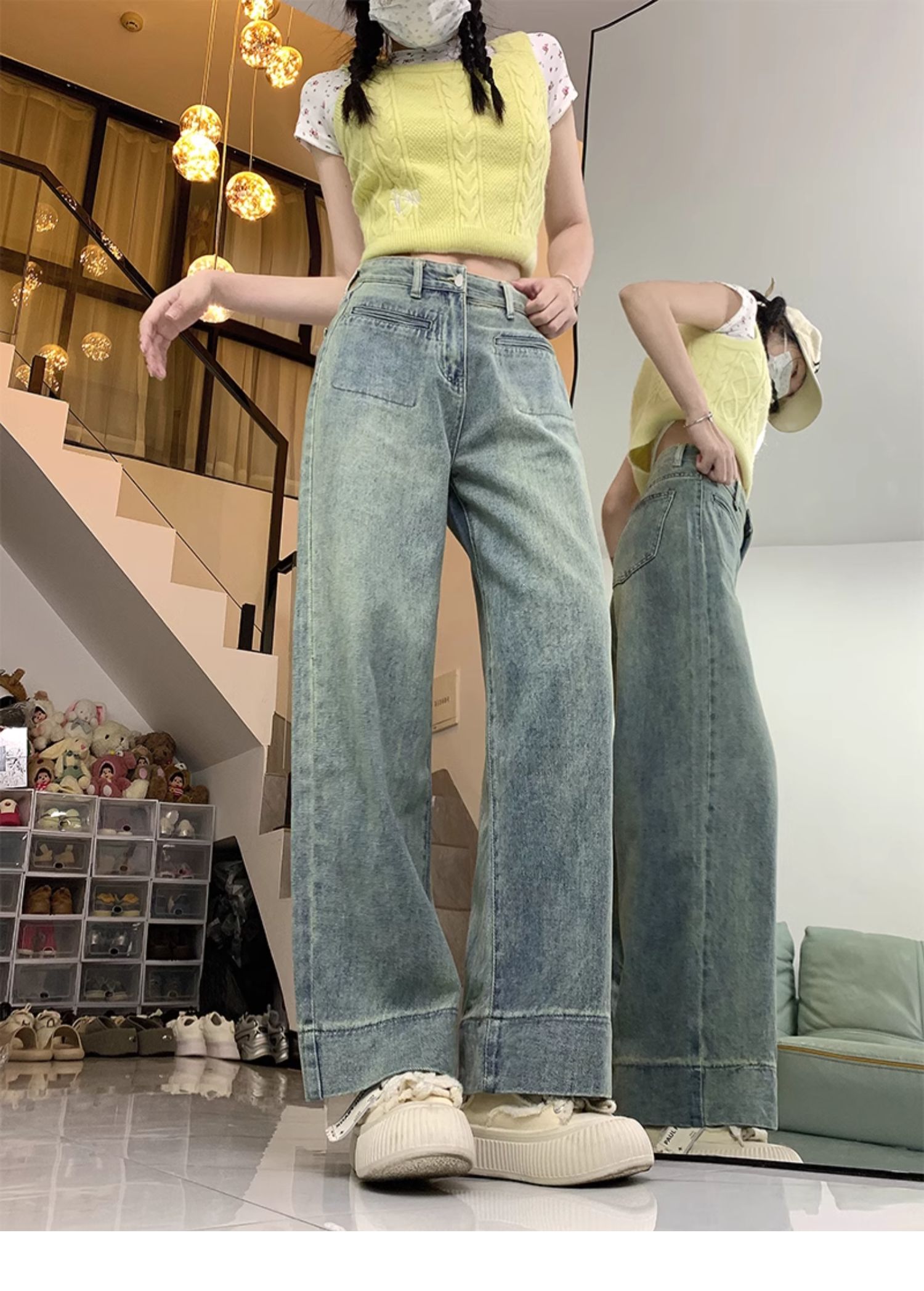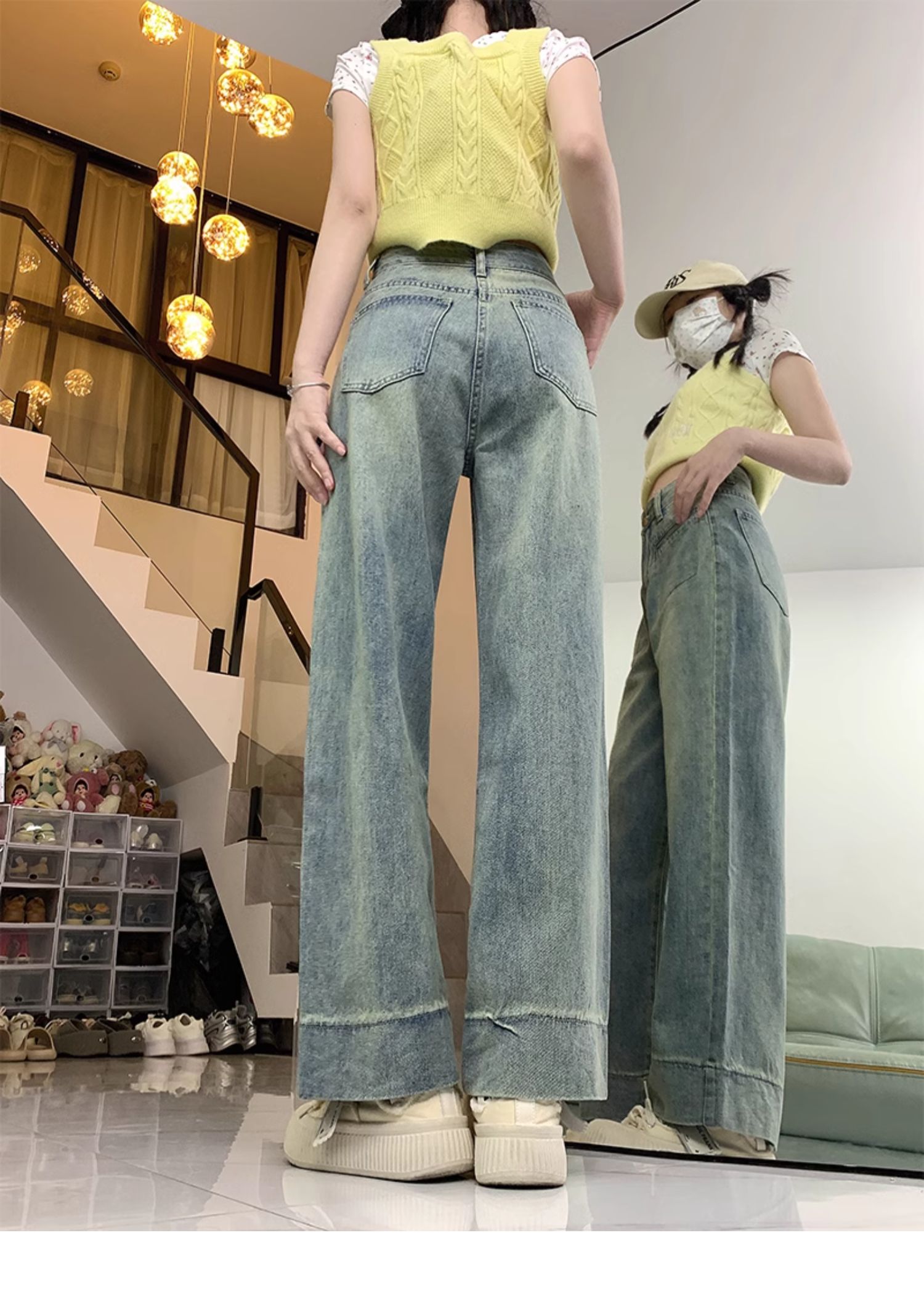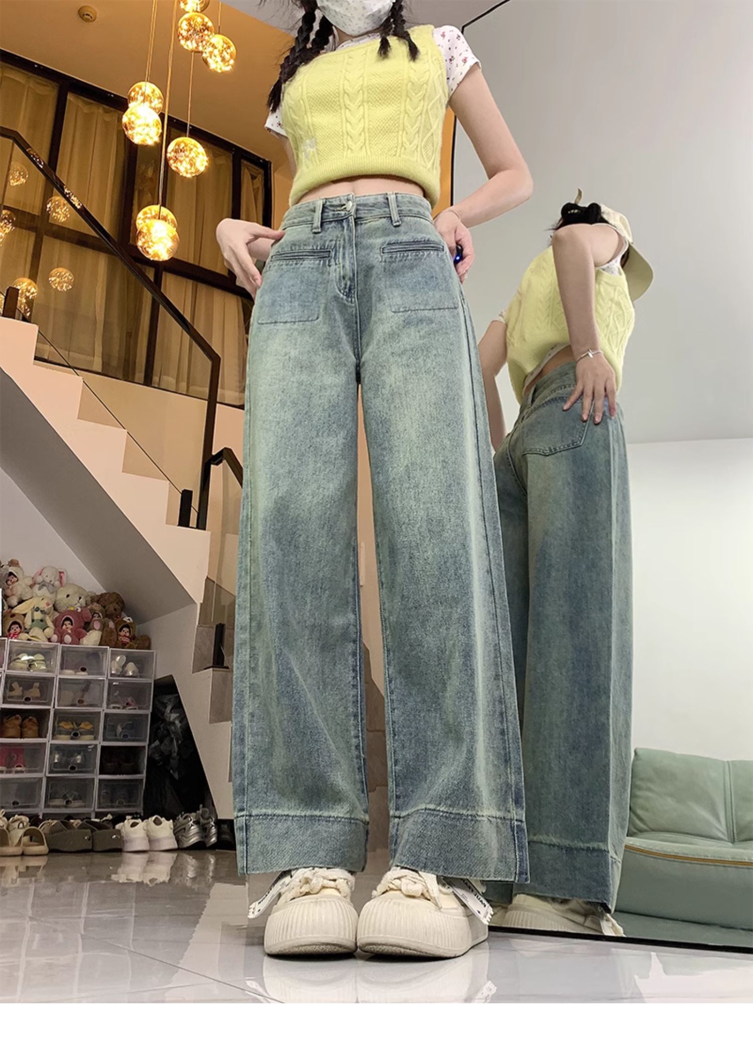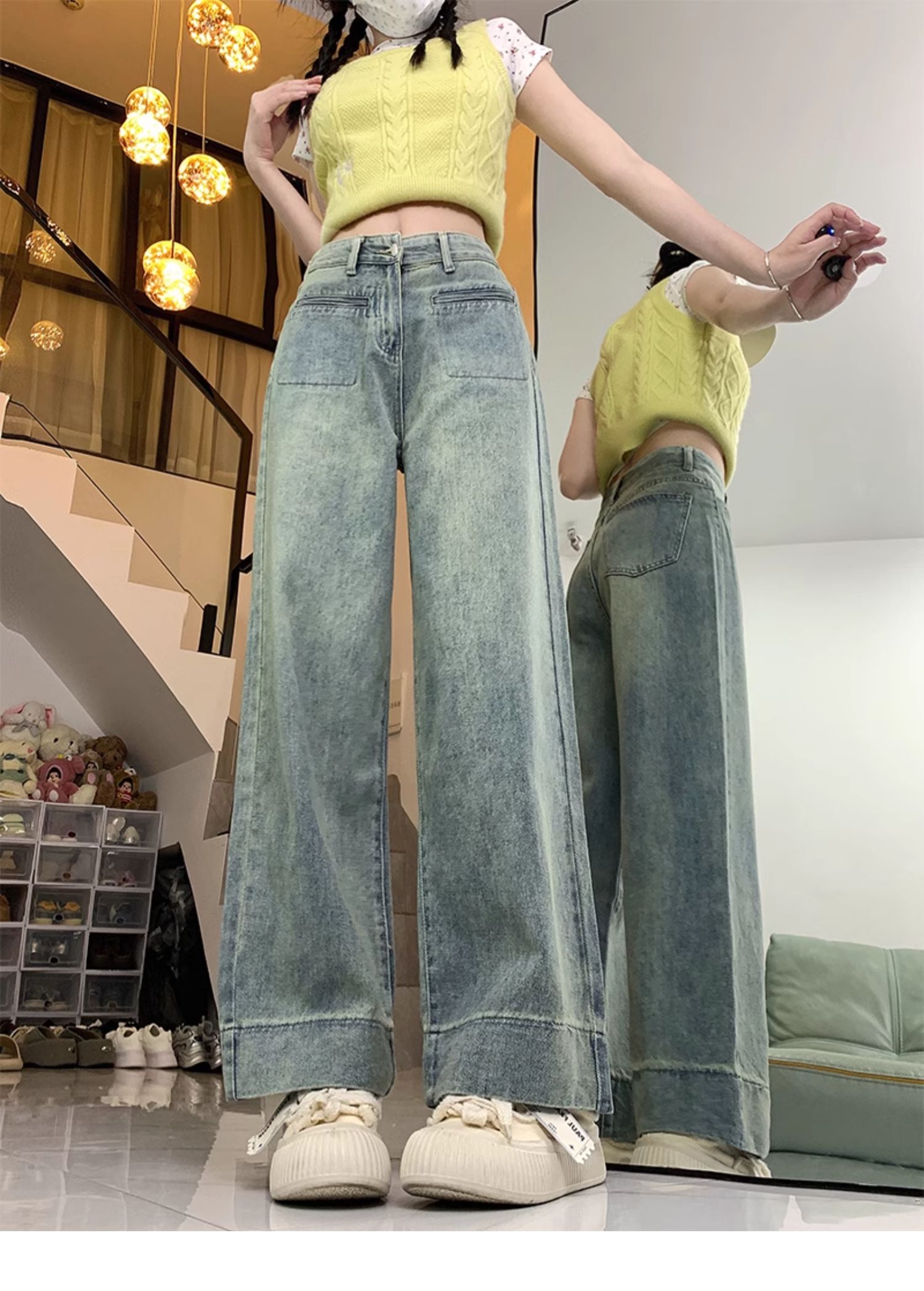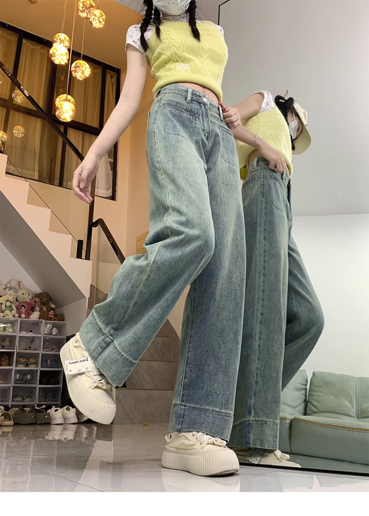 플러스 사이즈 레트로 라이트 컬러 청바지 여성의 가을과 겨울 통통녀 높은 허리 슬리밍 느슨한 작은 직선 다리 넓은 다리 긴 바지스토어 가기