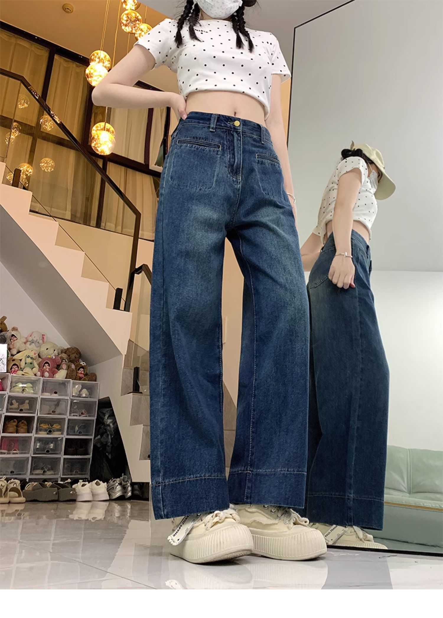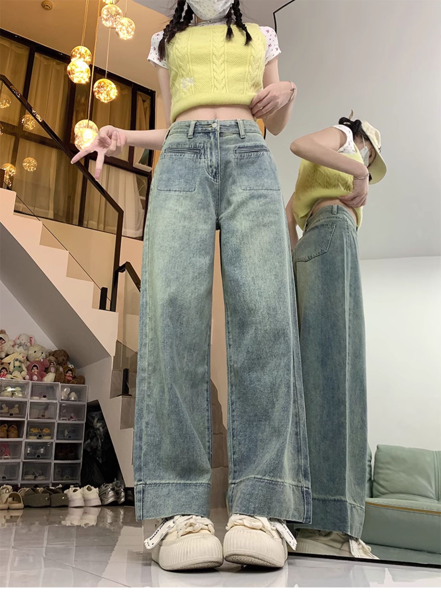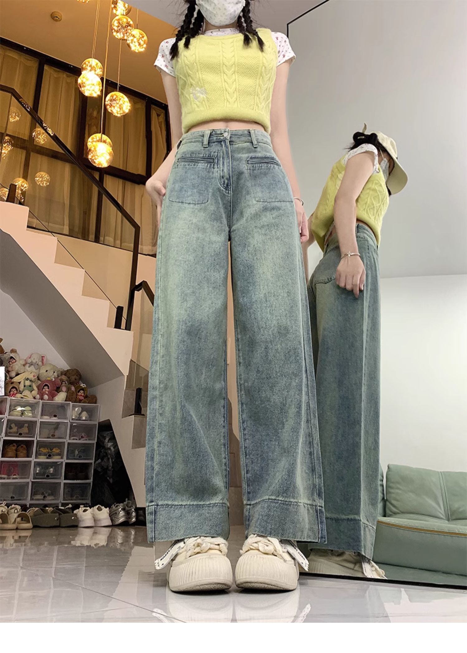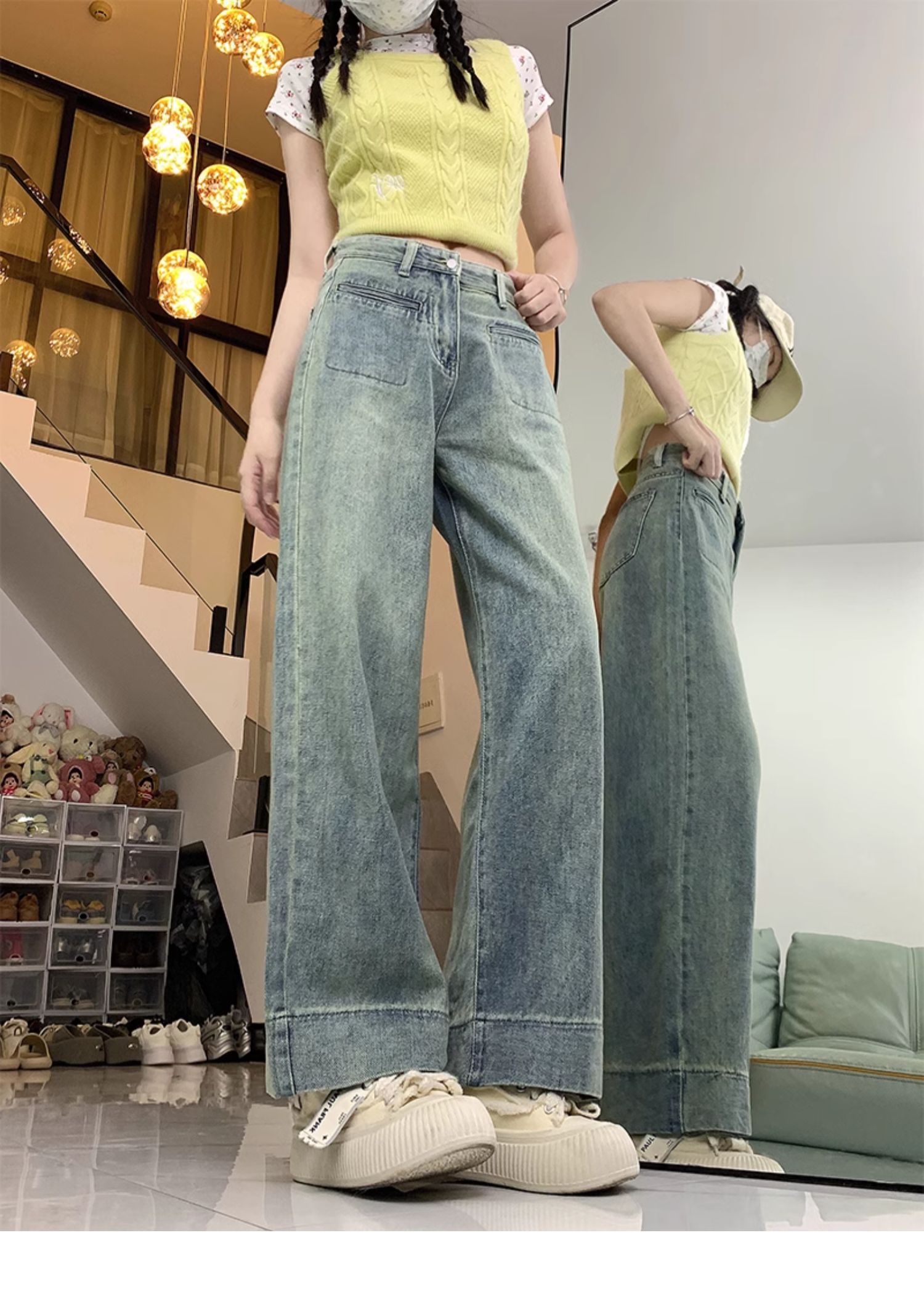 플러스 사이즈 레트로 라이트 컬러 청바지 여성의 가을과 겨울 통통녀 높은 허리 슬리밍 느슨한 작은 직선 다리 넓은 다리 긴 바지스토어 가기
