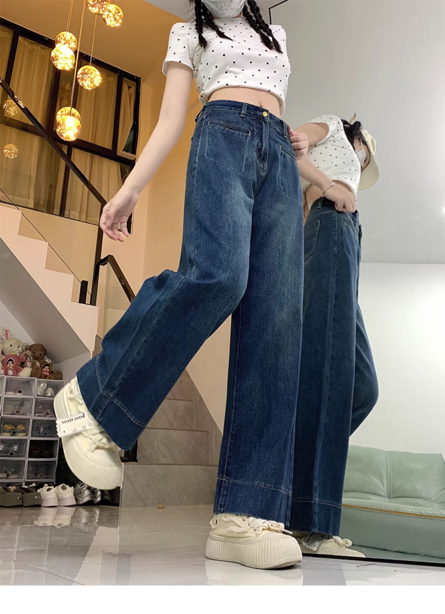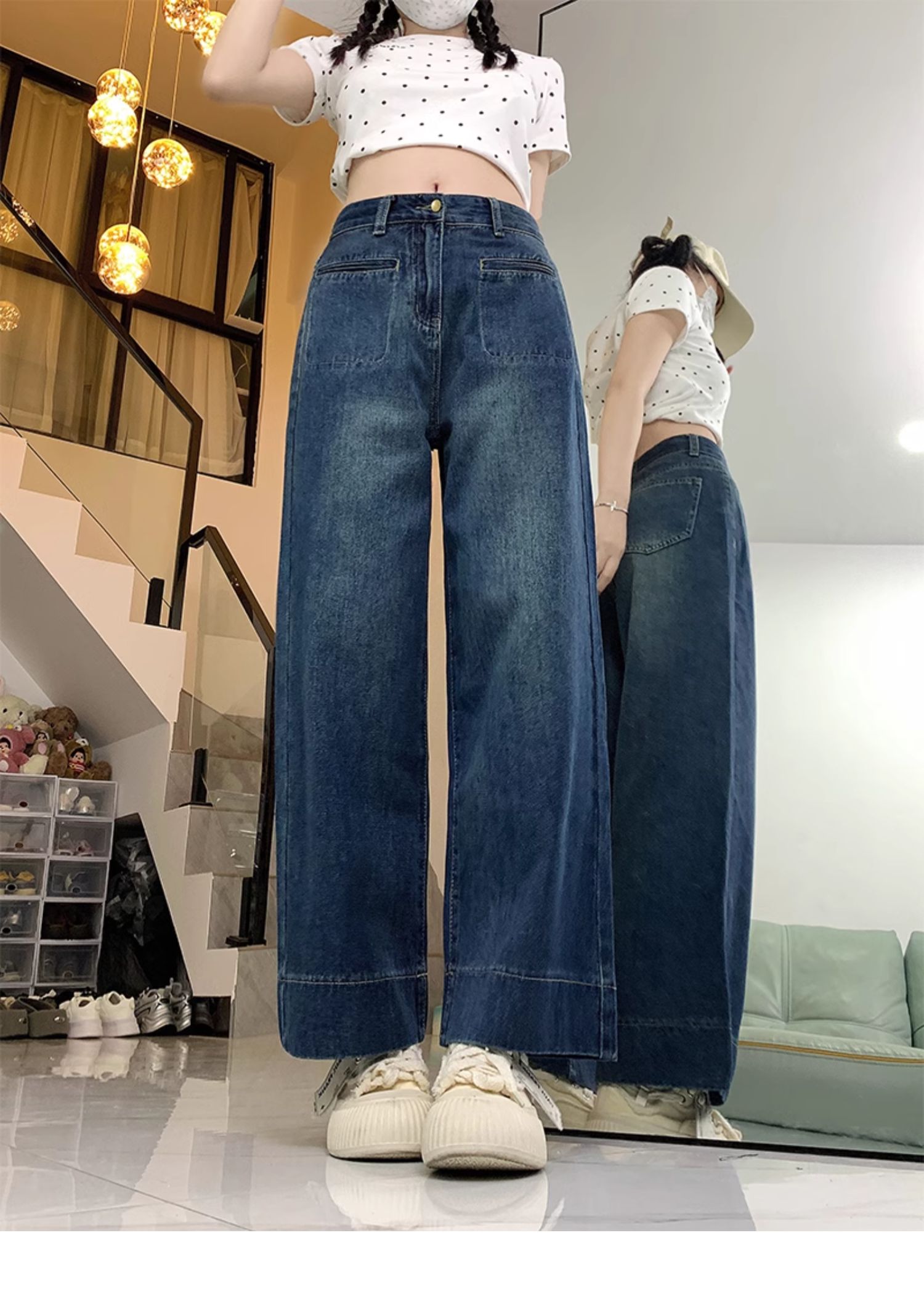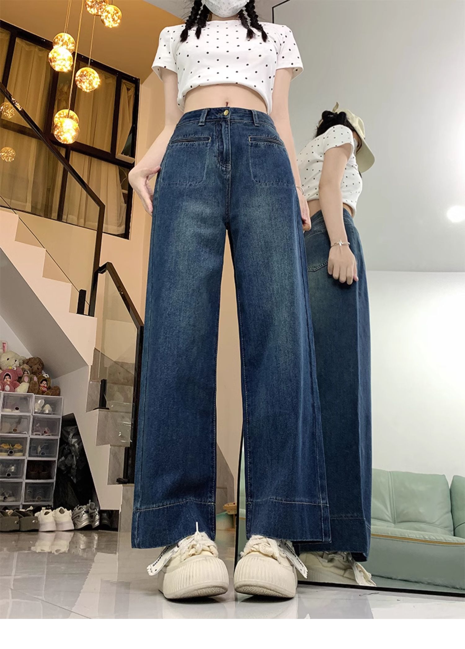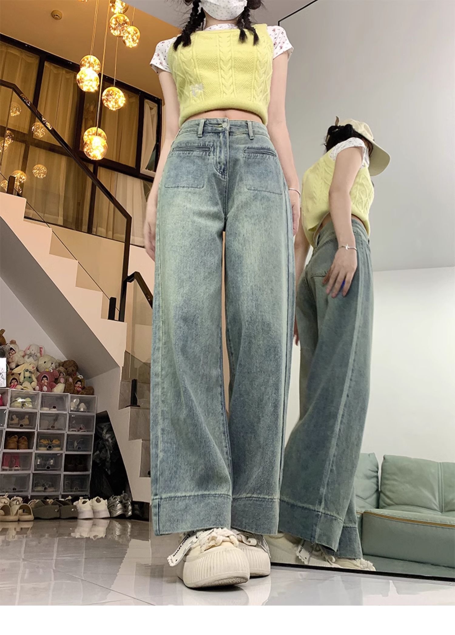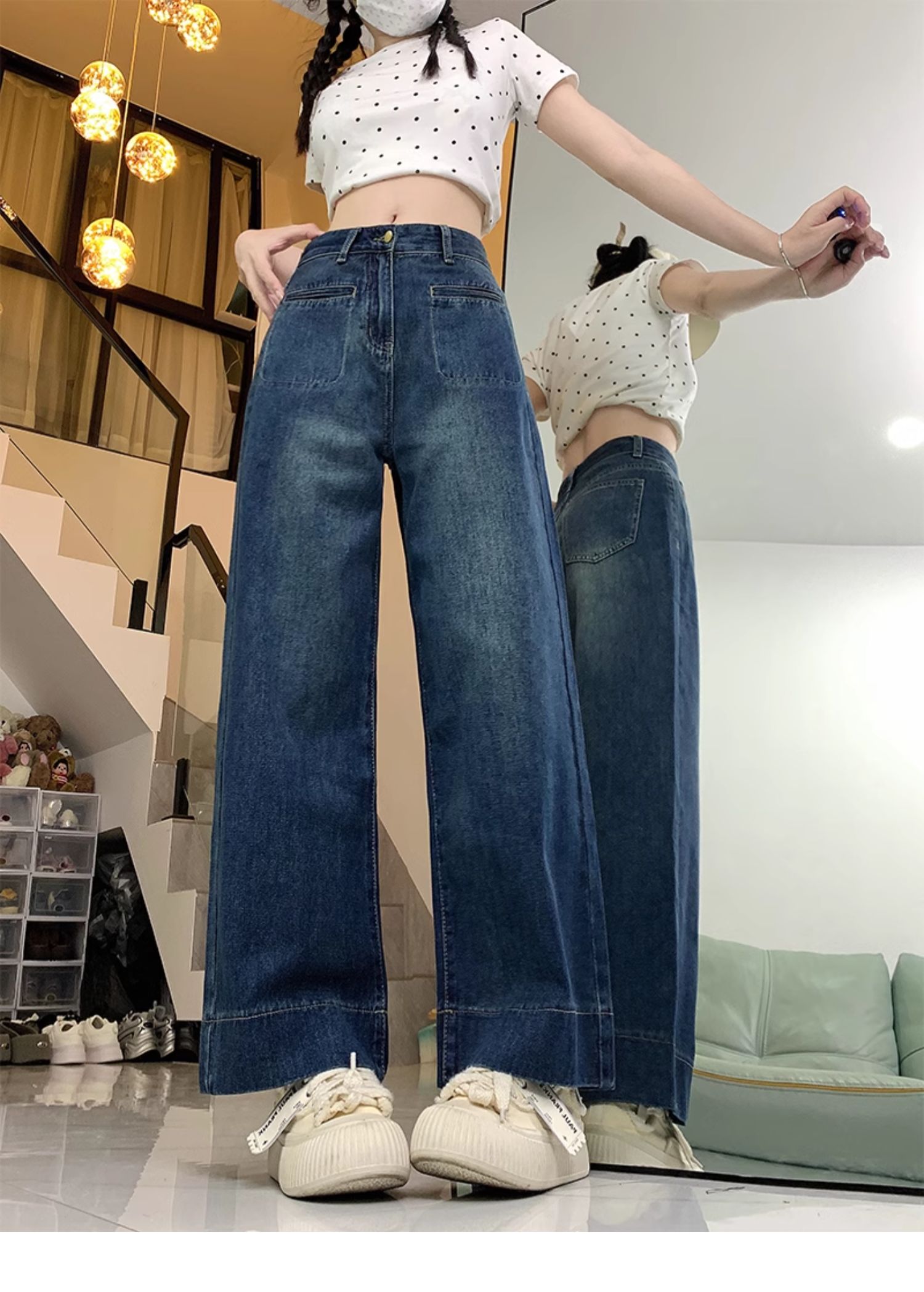 플러스 사이즈 레트로 라이트 컬러 청바지 여성의 가을과 겨울 통통녀 높은 허리 슬리밍 느슨한 작은 직선 다리 넓은 다리 긴 바지스토어 가기