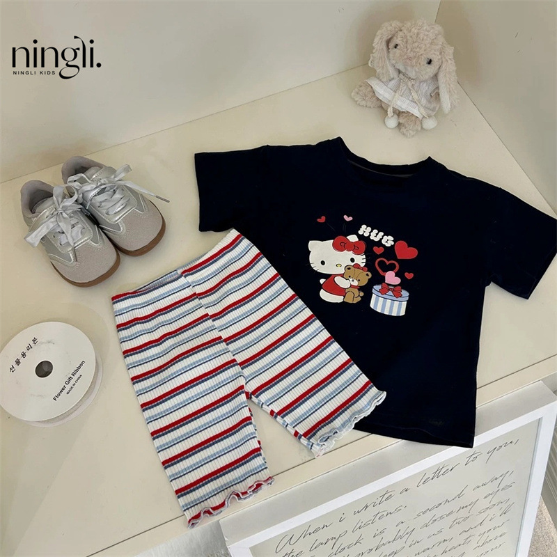 라임 소녀 세트 2025 여름 새 여성 아기 한국 만화 KT 고양이 상단 줄무늬 바지 투피스 세트 조수스토어 가기