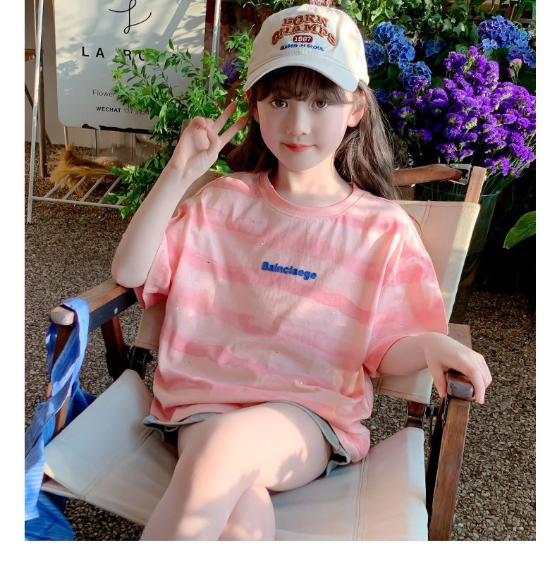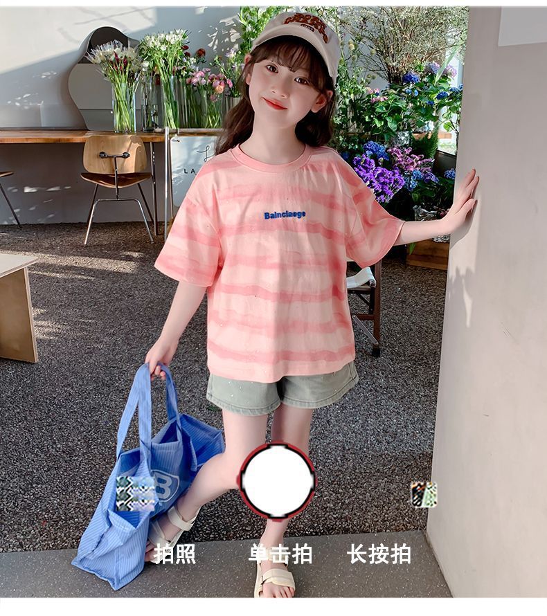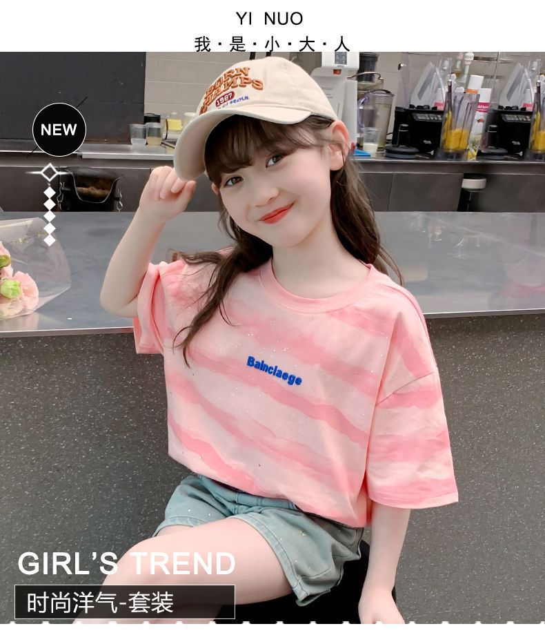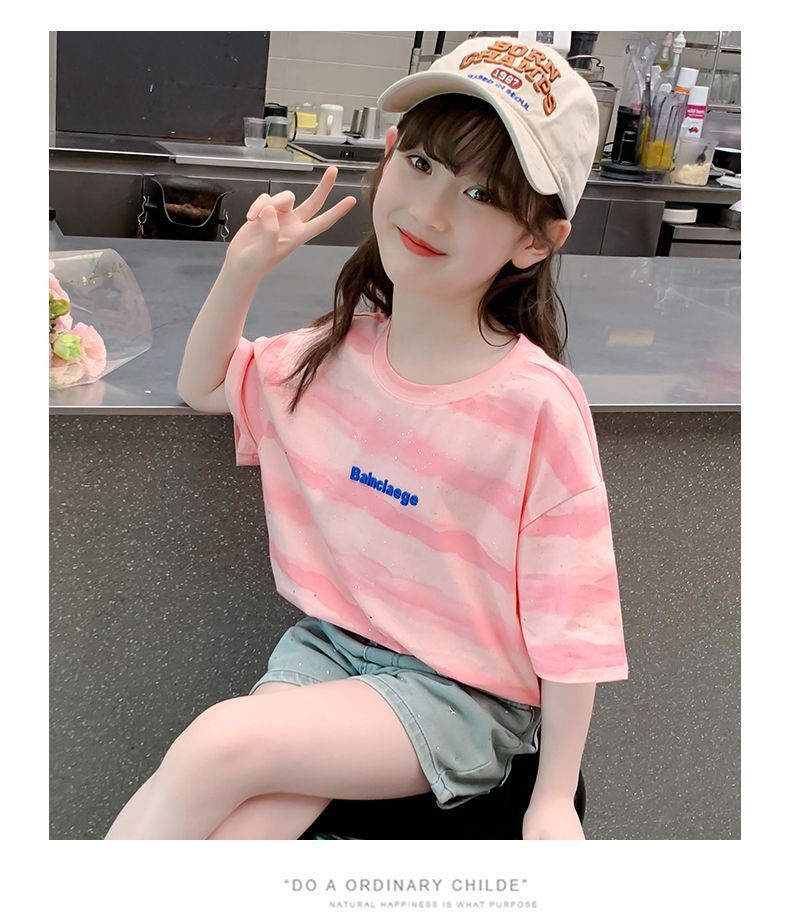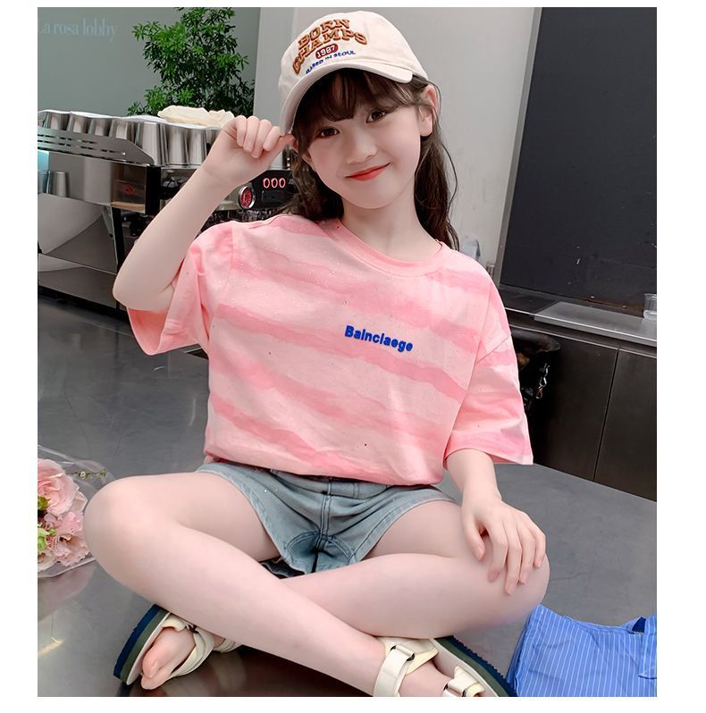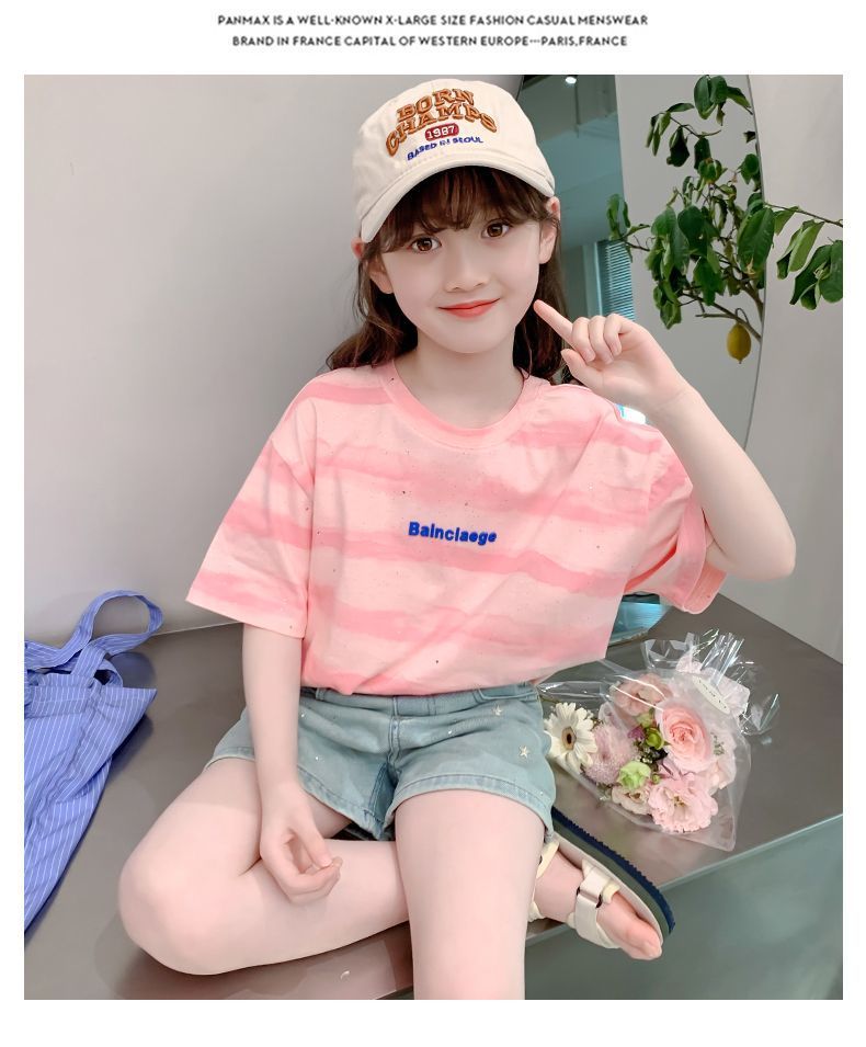 여자 반팔 티셔츠 2025 새로운 스타일 여름 어린이 온라인 인기 서양식 올 매치 코튼 티셔츠 걸스 여름 최고 트렌디스토어 가기