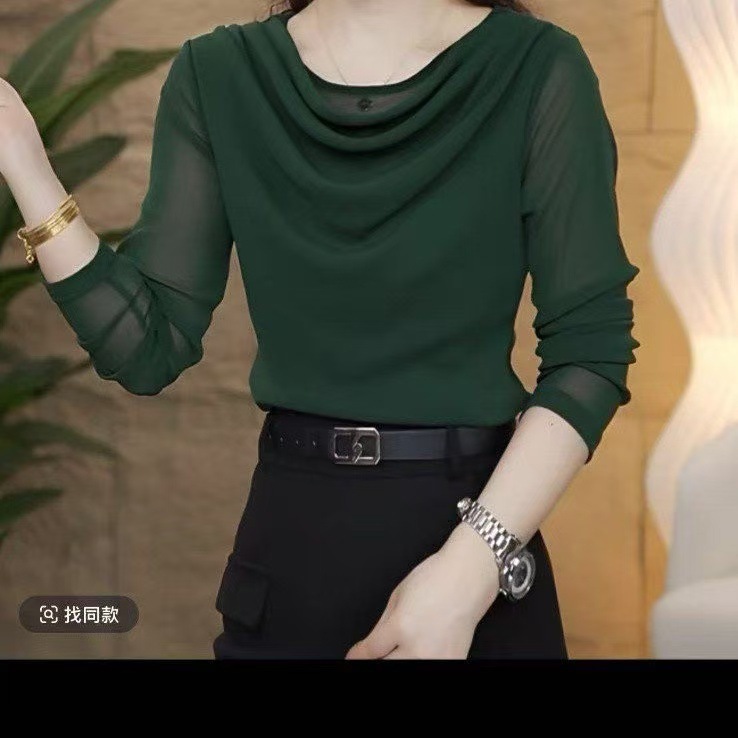 헤어 어머니 파일 칼라 외국 스타일 메쉬 스트레치 패션 여성 봄 긴팔 티셔츠 여성 조커 탑