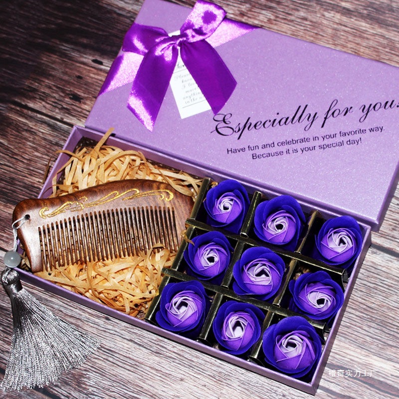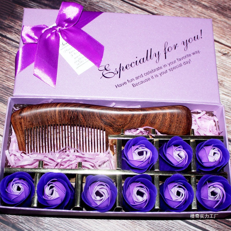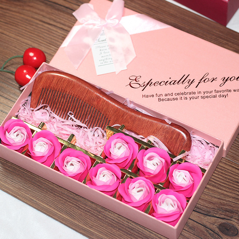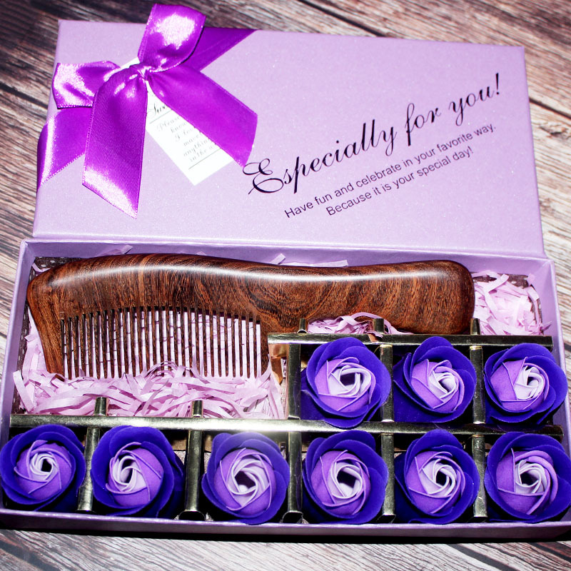 • 긴 붉은 백단향 빗 + 9개의 분홍색 꽃 선물 상자 + 무료 각인