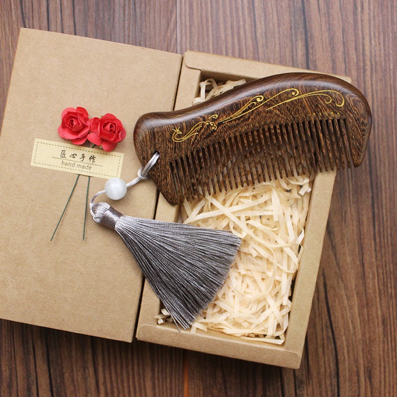 • 블랙 골드 백단향 빗 + 짙은 녹색 술 + 선물 상자 선물 가방 + 천 가방 + 무료 각인