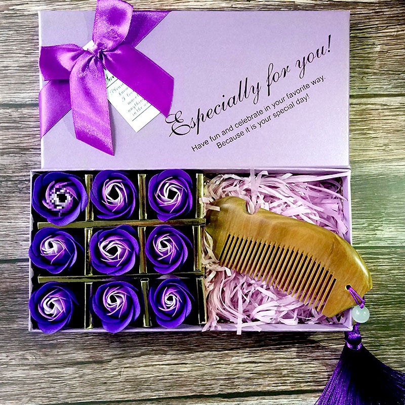 • 녹색 백단향 빗 + 9개의 보라색 꽃 선물 상자 + 무료 각인