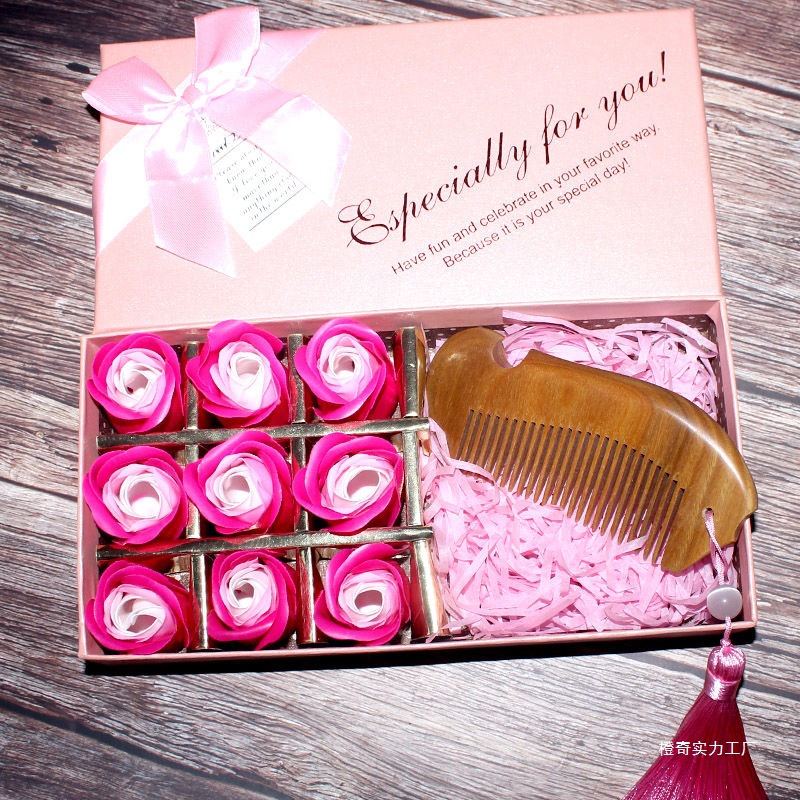 • 녹색 백단향 빗 + 9개의 분홍색 꽃 선물 상자 + 무료 각인