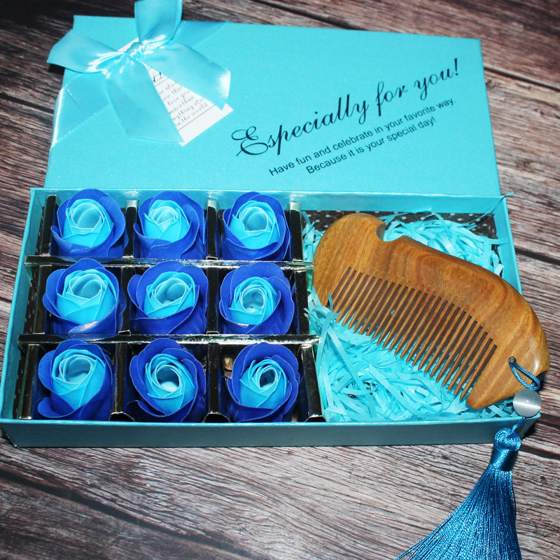 • 녹색 백단향 빗 + 9개의 파란색 꽃 선물 상자 + 무료 각인