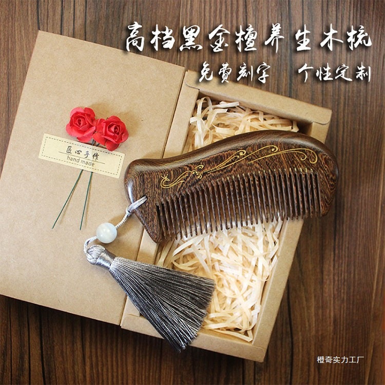 • 블랙 골드 백단향 빗 + 은회색 술 + 선물 상자 선물 가방 + 천 가방 + 무료 각인