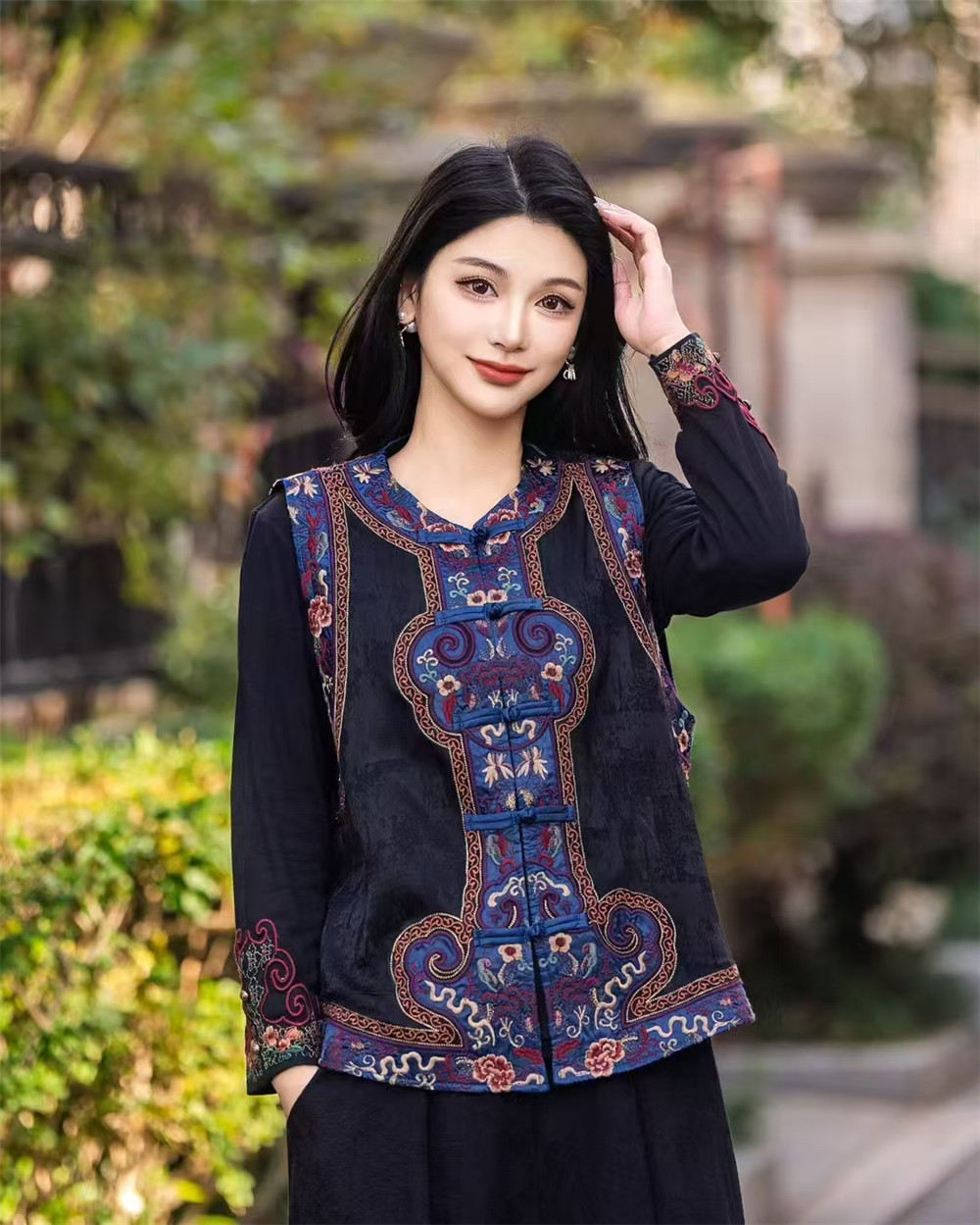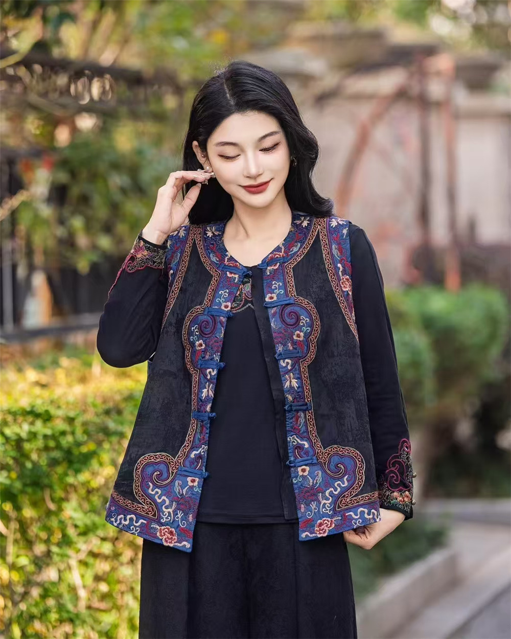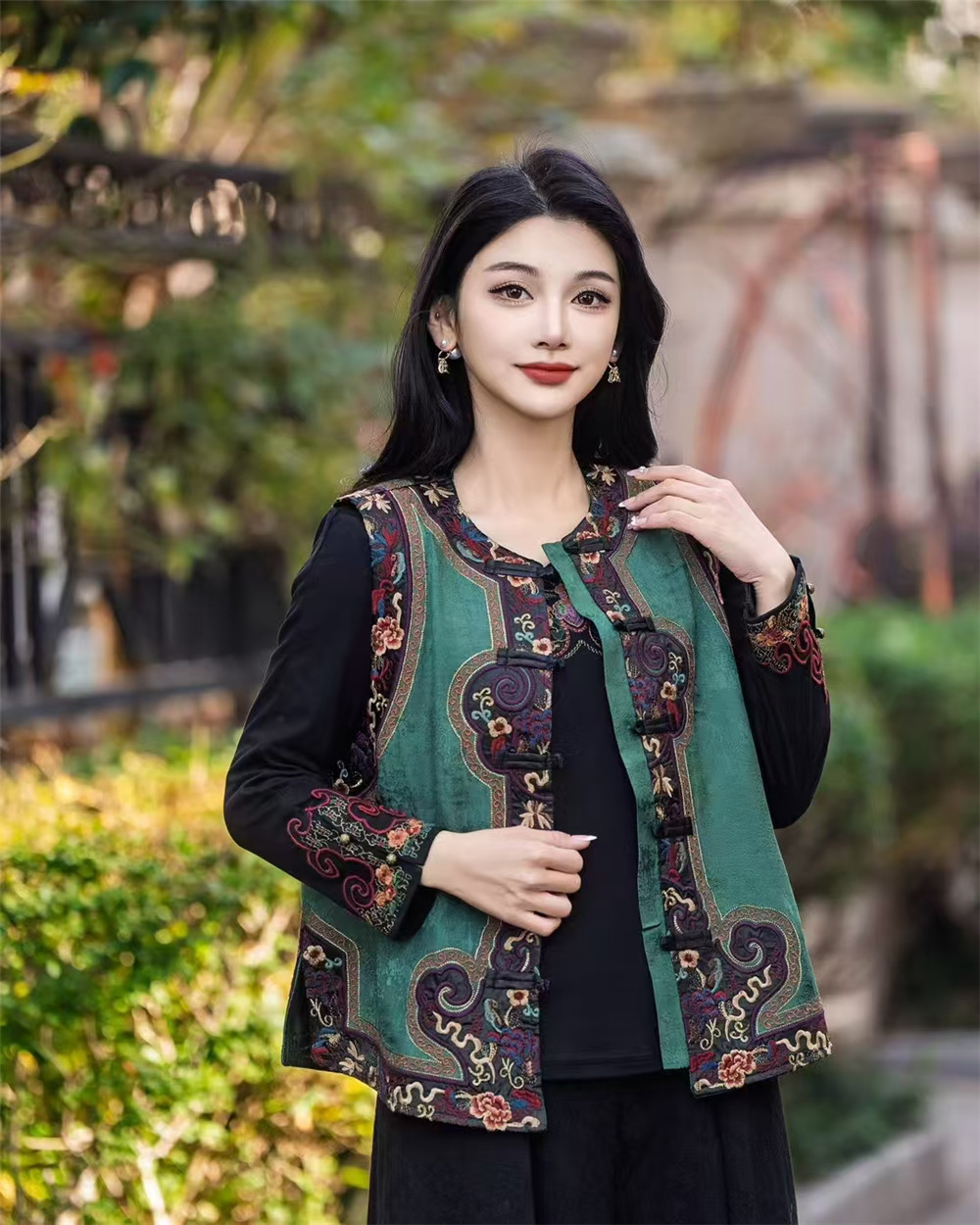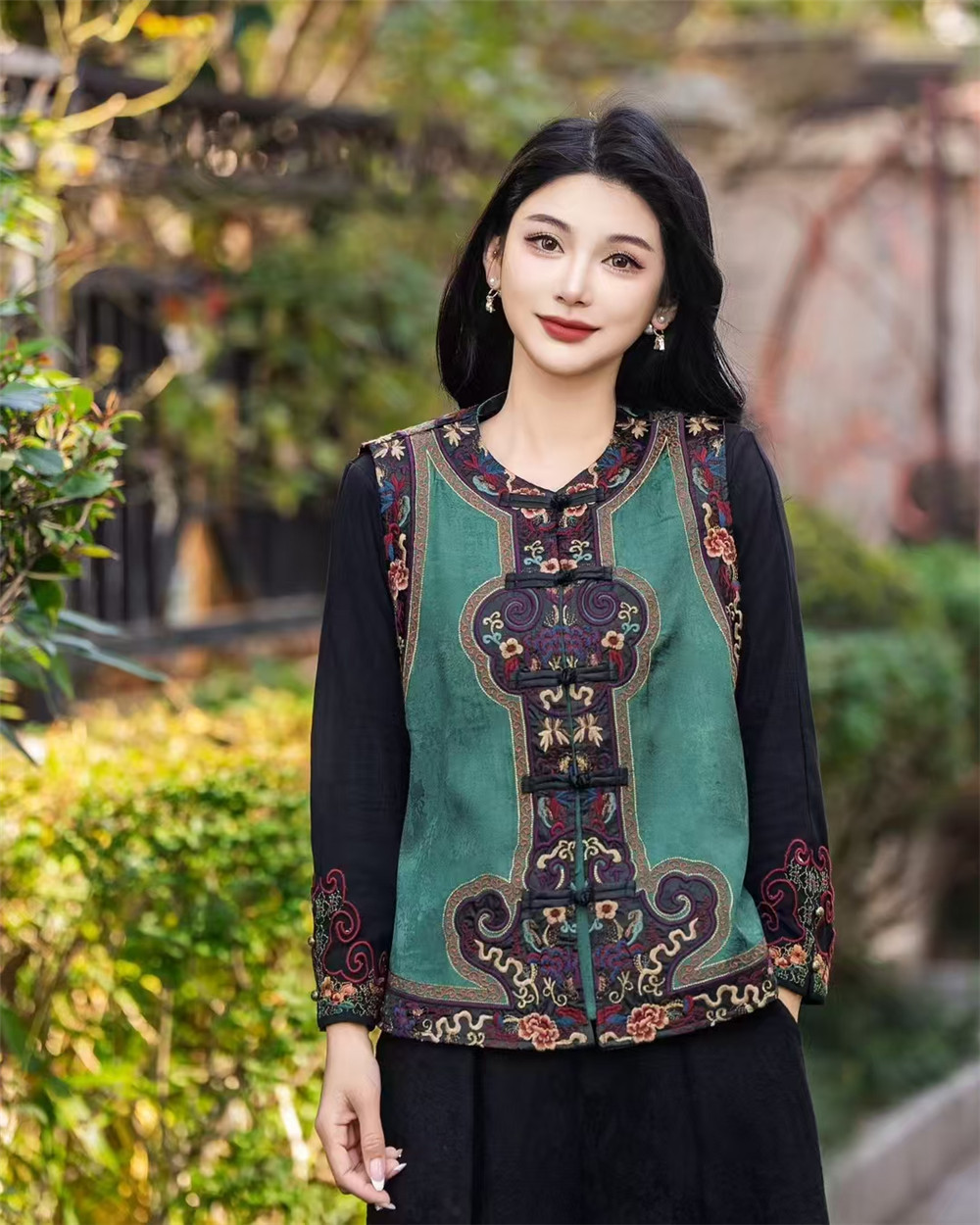Guofeng 중공업 자수 여성 새틴 조끼 2025 봄 여성 민족 스타일 버클 코튼 리본 조끼스토어 가기
