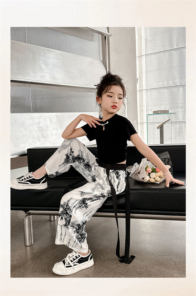 소녀 중국 잉크 그림 중국 스타일 넓은 다리 바지 중국 스타일 세트 새로운 여름 서양 스타일 어린이 투피스 세트