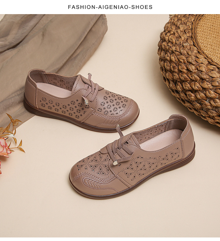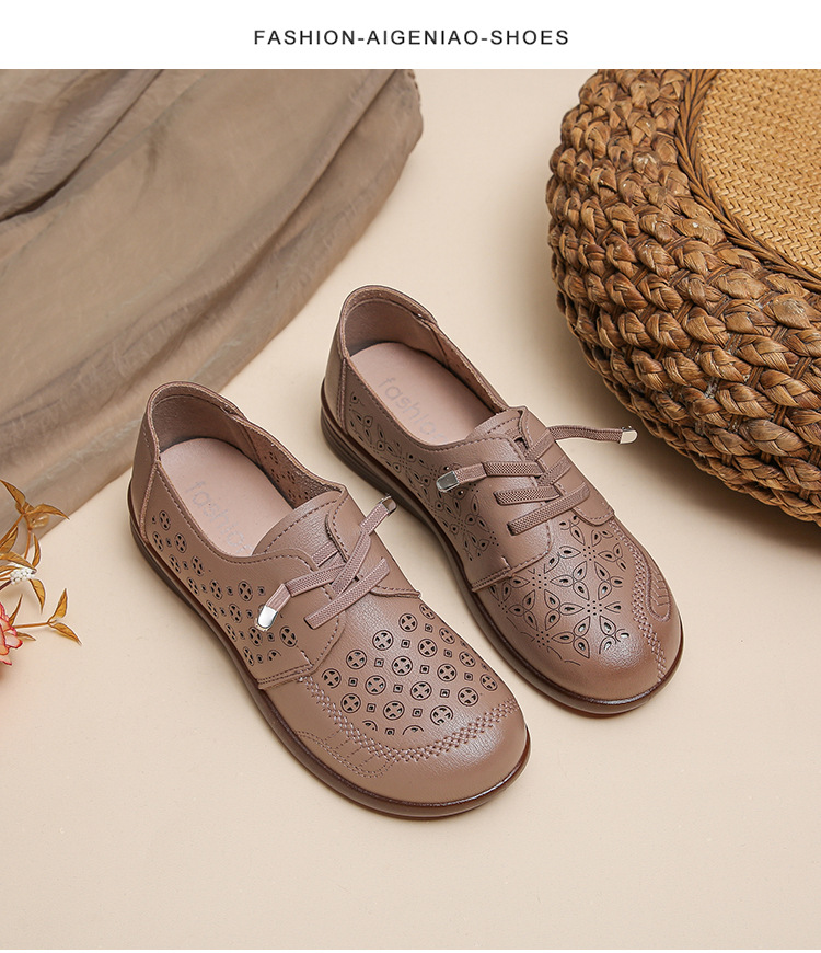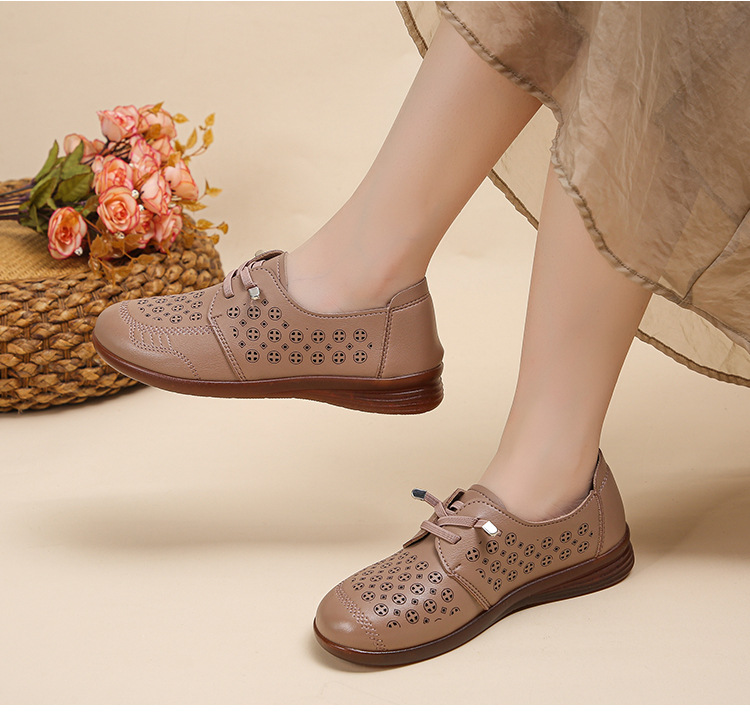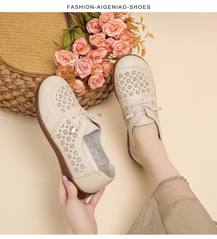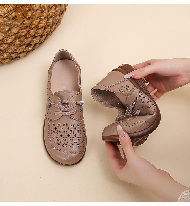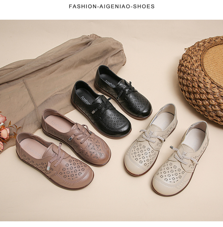 2025 새로운 중공 구멍 단층 신발 둥근 발가락 편안한 부드러운 바닥 평면 통기성 다용도 가죽 신발 편안한 어머니 여성 신발