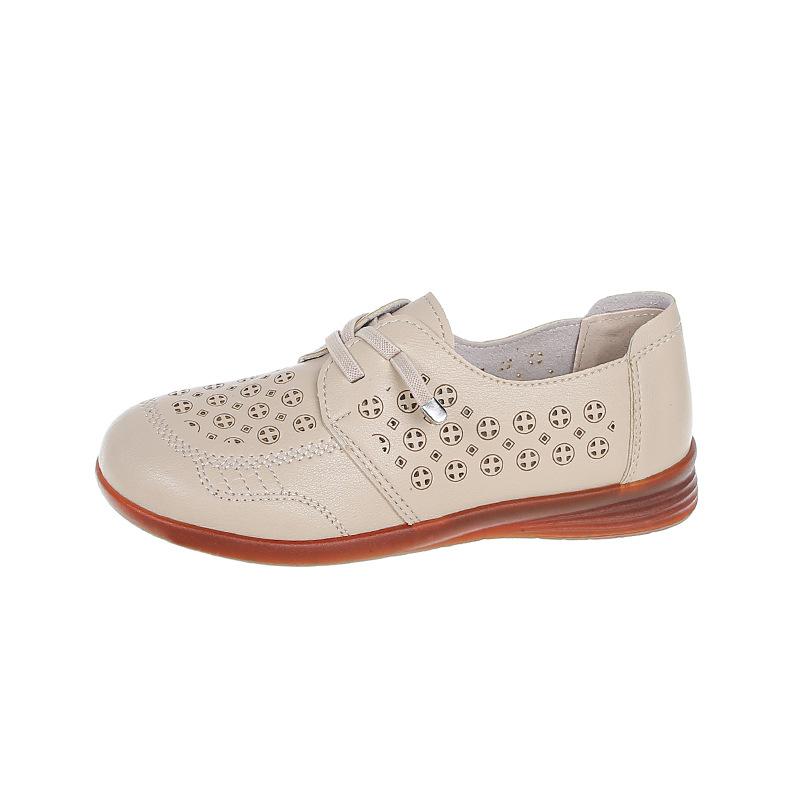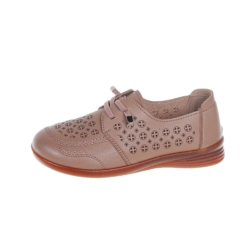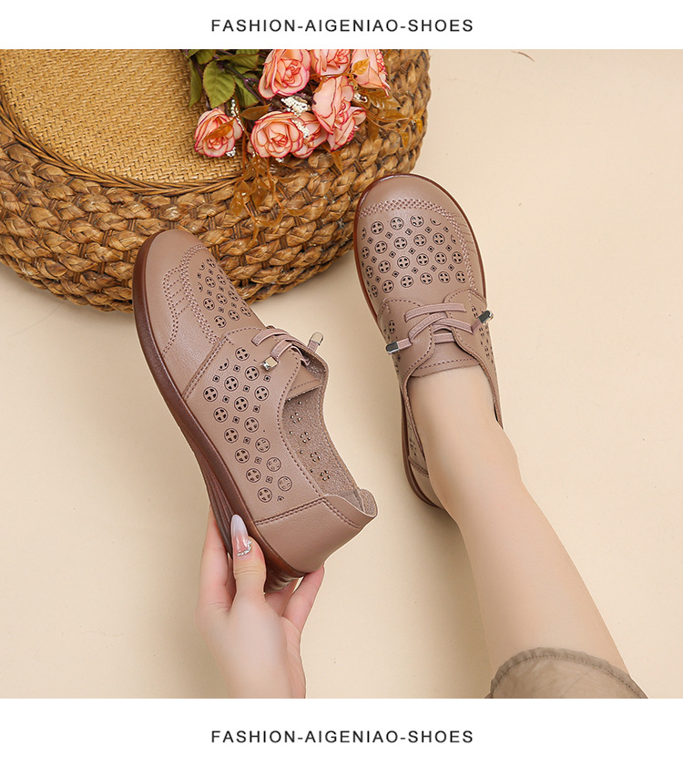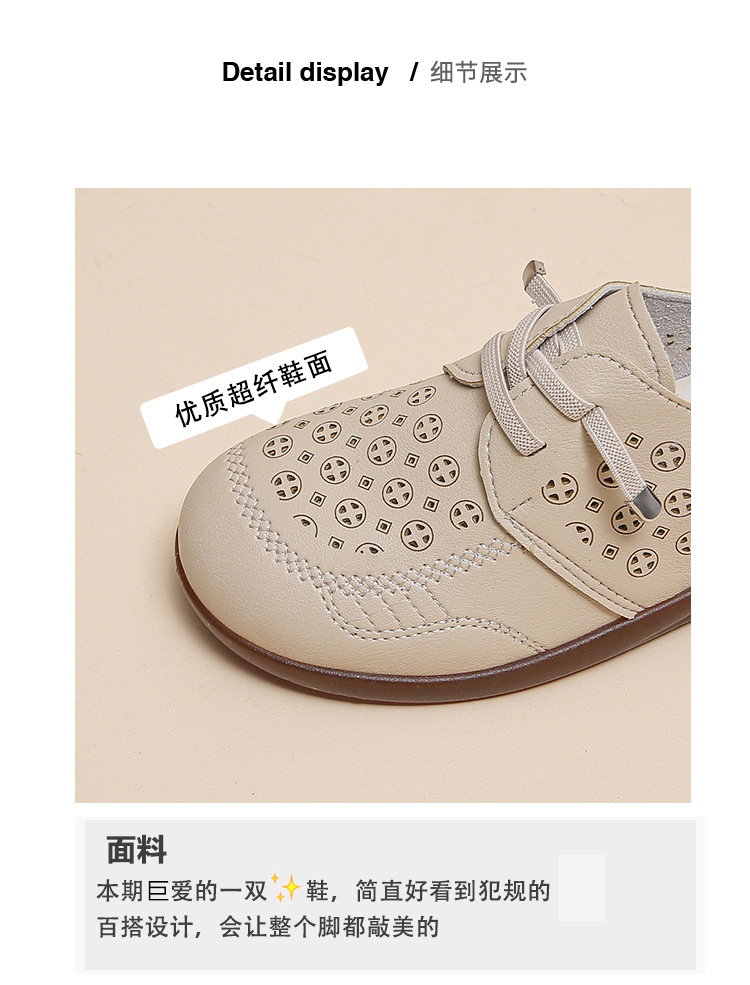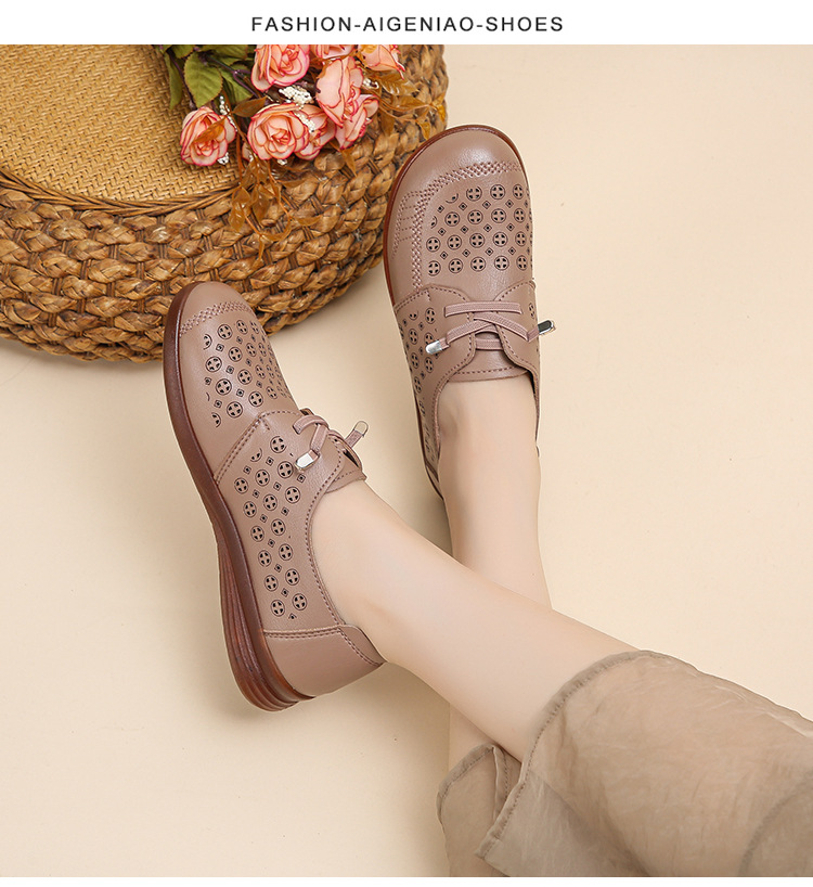 2025 새로운 중공 구멍 단층 신발 둥근 발가락 편안한 부드러운 바닥 평면 통기성 다용도 가죽 신발 편안한 어머니 여성 신발